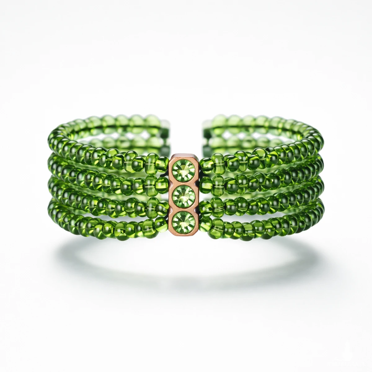 Bransoletka z zielonych korali z pięknym elementem dekoracyjnym centralnie umieszczonym. Oprawione w metal w kolorze miedzi zielone cyrkonie. Zapięcie karabińczyk ze stali nierdzewnej. Efektowna, przykłuwająca uwagę. Długość 18-20 cm