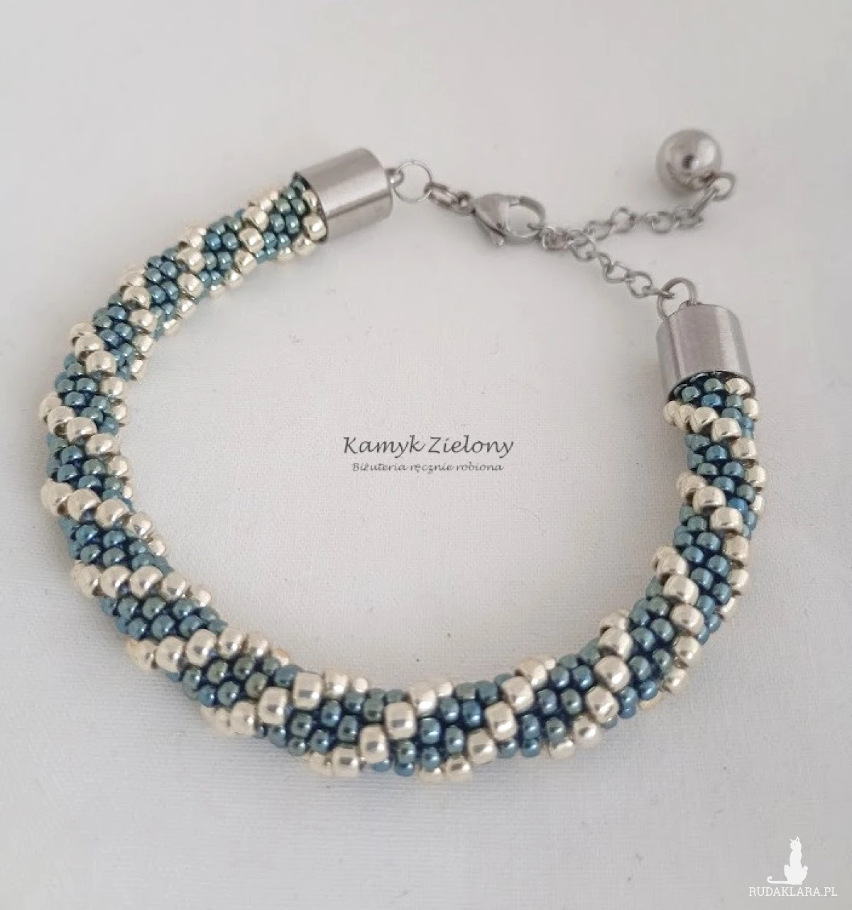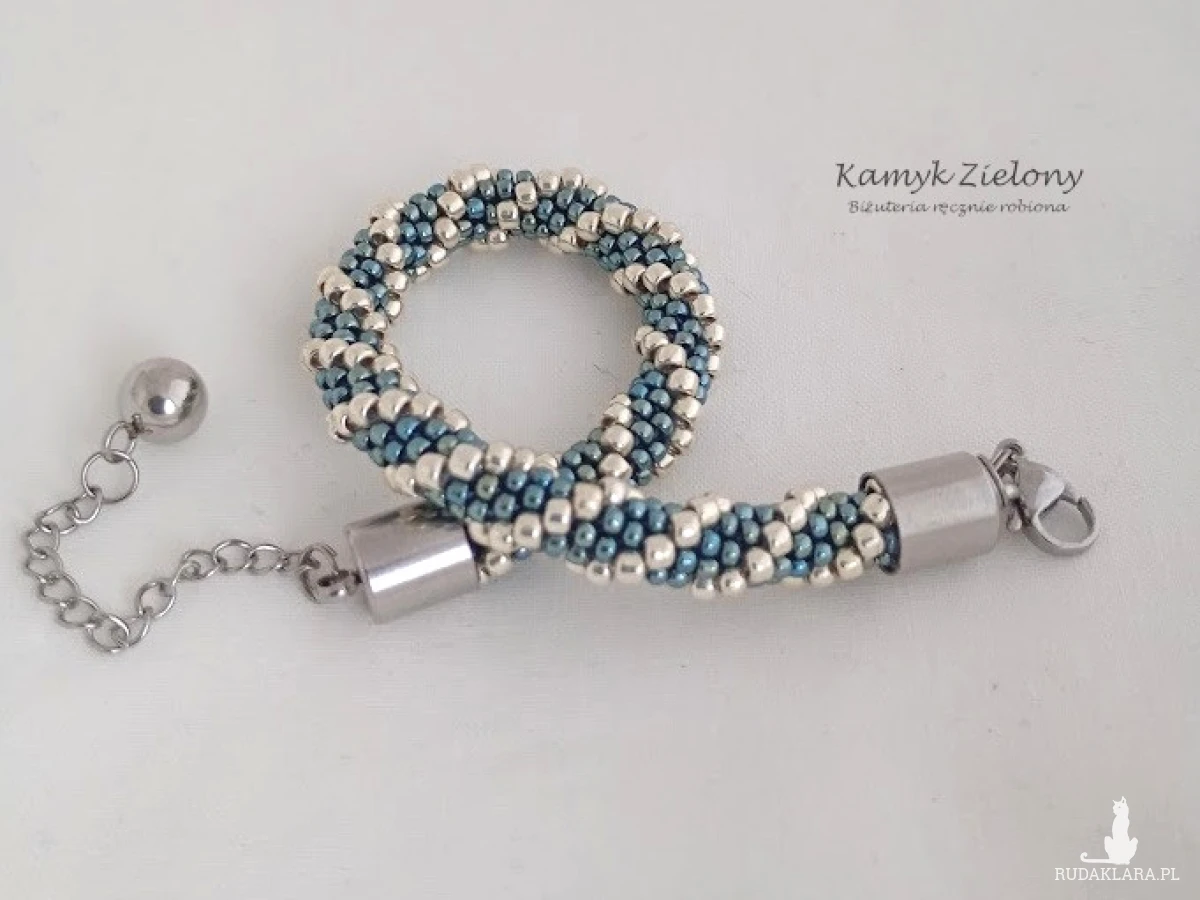 Bransoletka wykonana ręcznie ze szklanych, japońskich koralików Toho w dwóch kolorach - szaro-niebieskim o metalicznym wykończeniu oraz jasnosrebrnym.