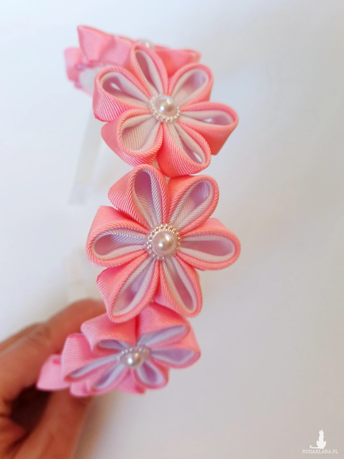 Opaska do włosów jest ozdobiona wykonanymi ręcznie kwiatami ze wstążki. Baza opaski jest plastikowa z ząbkami - rozmiar uniwersalny rozciąga się na 12-17 cm.