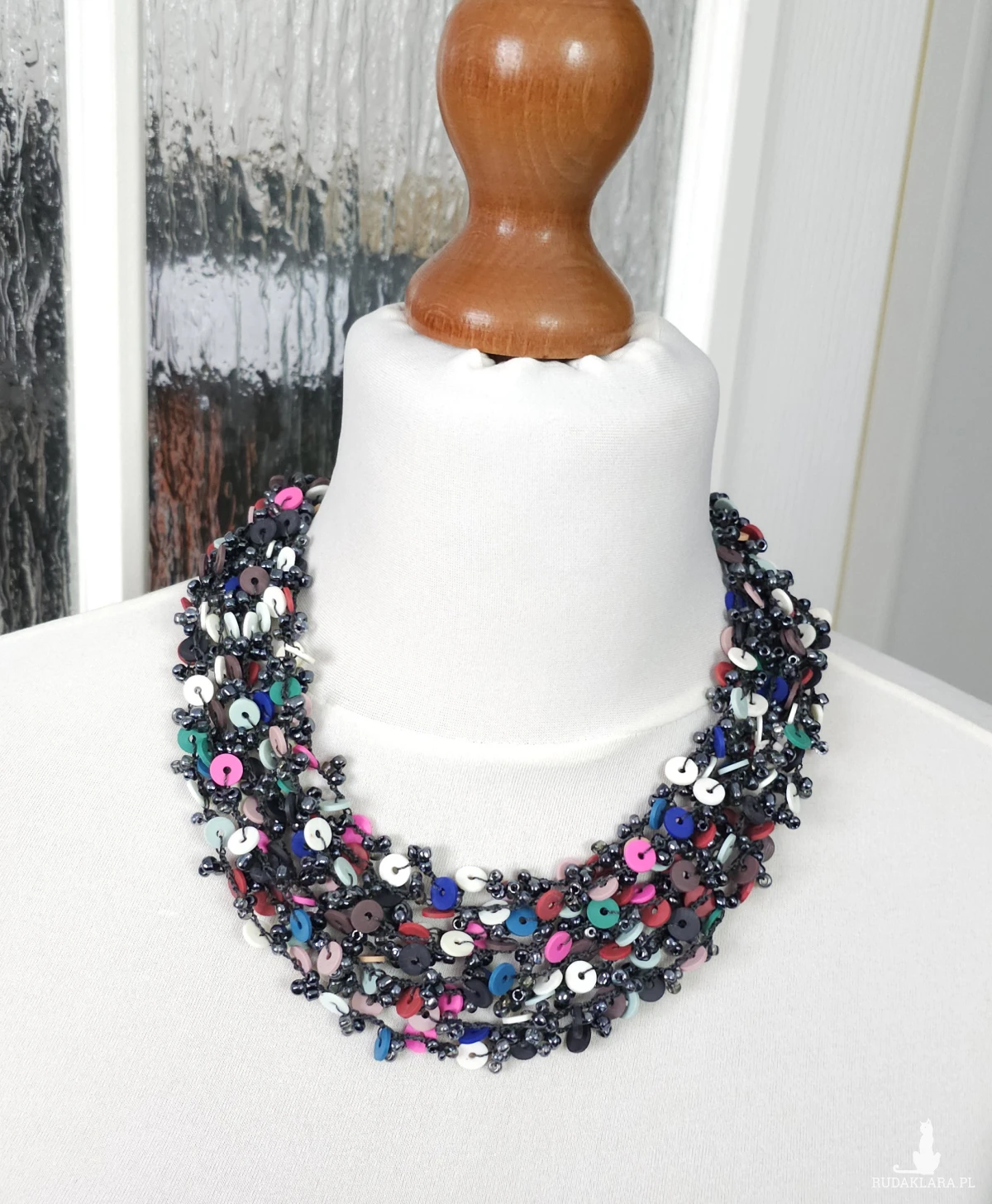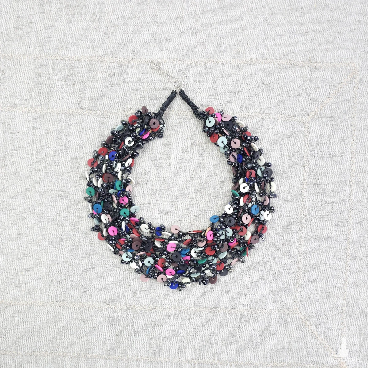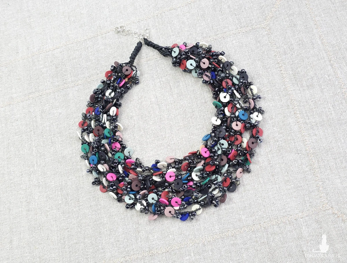 Ręcznie wykonany, bogaty naszyjnik o strukturze wielowarstwowej. Połączenie drobnych, ciemnych koralików szklanych z kolorowymi elementami z masy modelarskiej. Wyrazisty dodatek w stylu etno/boho, który ożywi każdą stylizację.