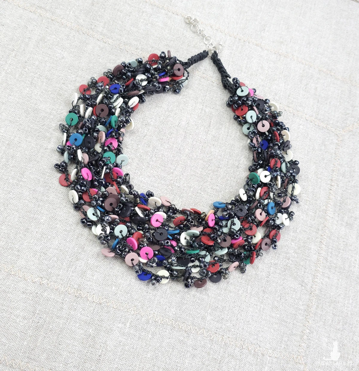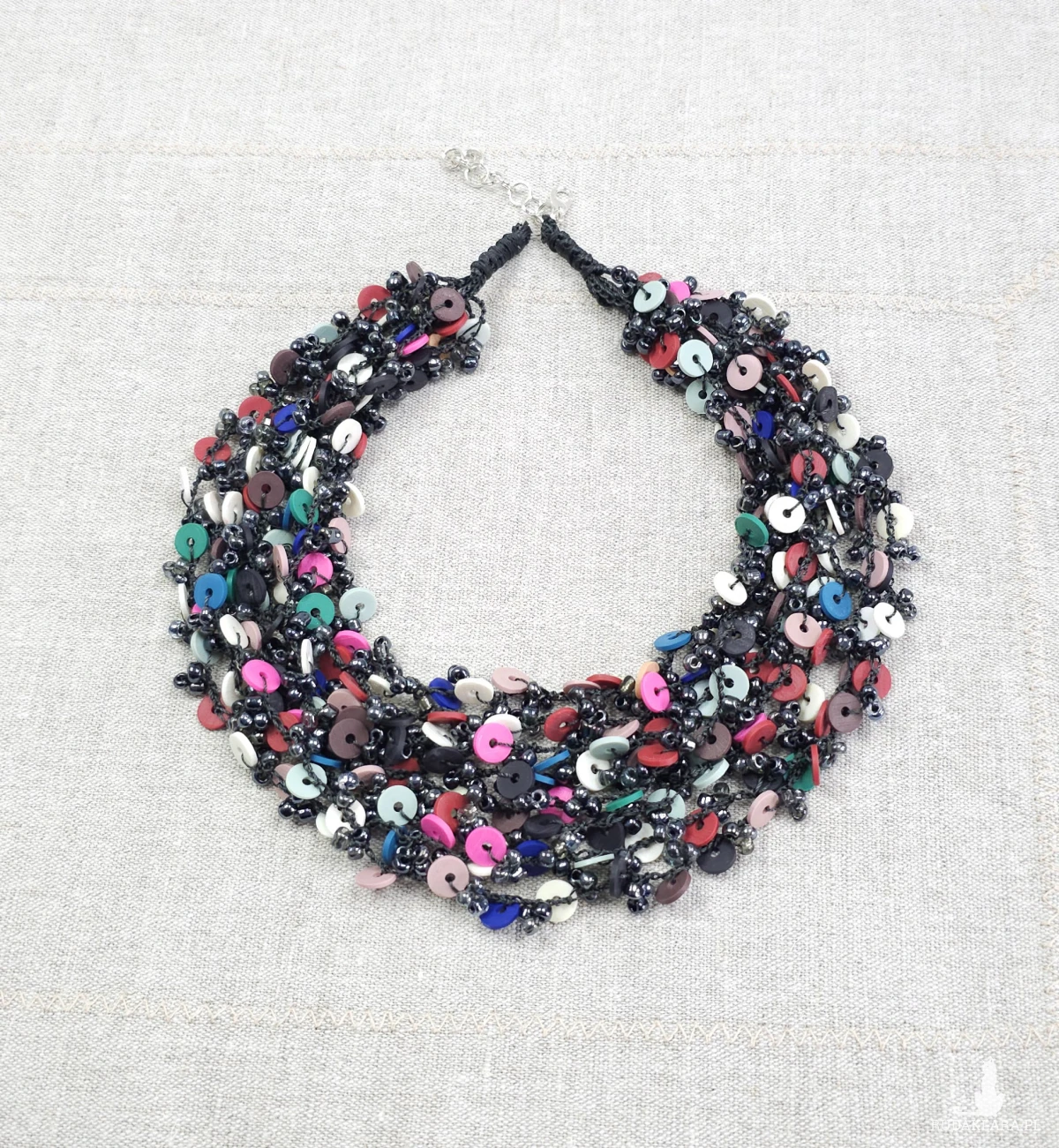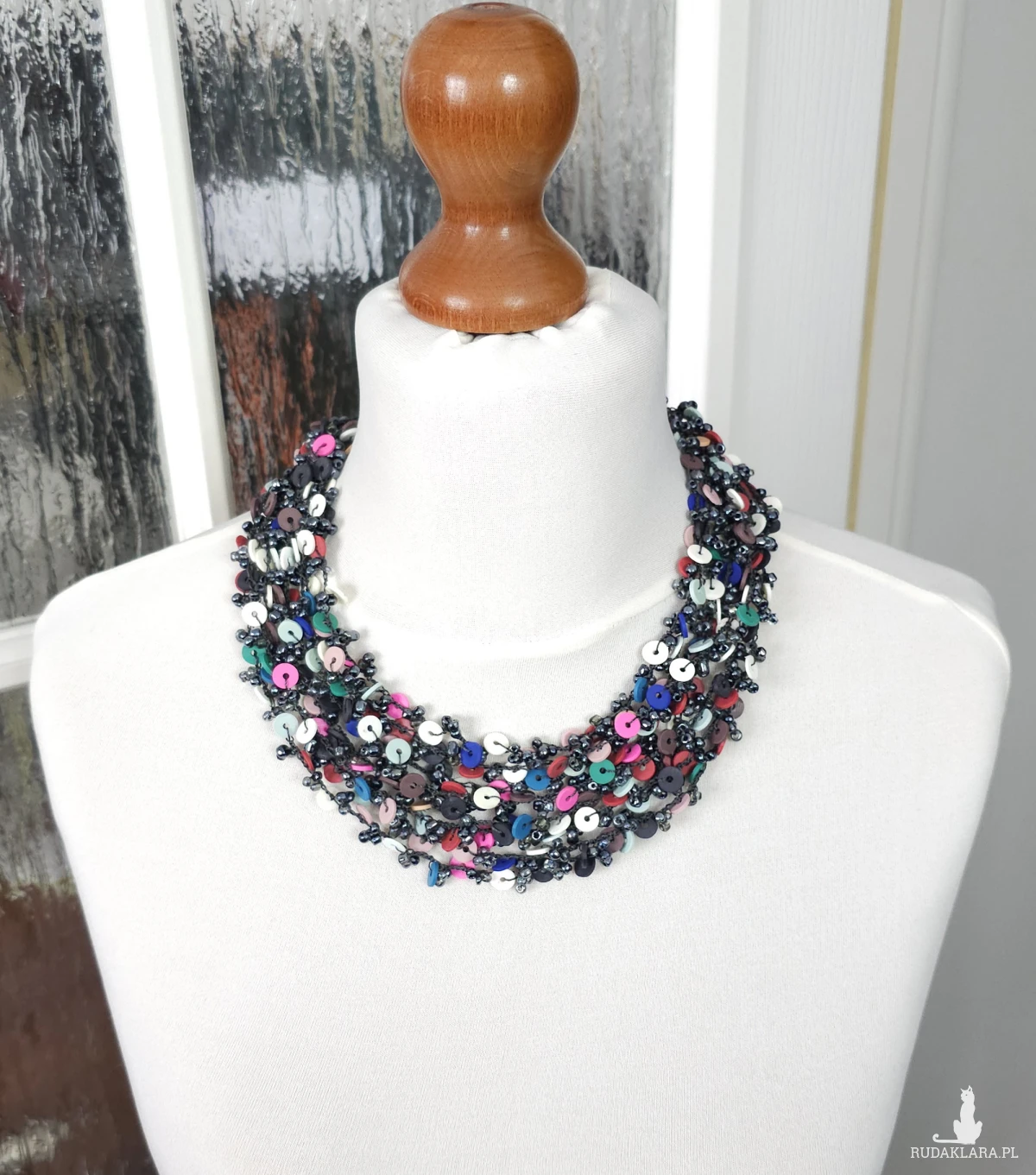 Ręcznie wykonany, bogaty naszyjnik o strukturze wielowarstwowej. Połączenie drobnych, ciemnych koralików szklanych z kolorowymi elementami z masy modelarskiej. Wyrazisty dodatek w stylu etno/boho, który ożywi każdą stylizację.