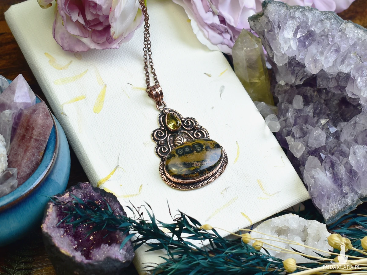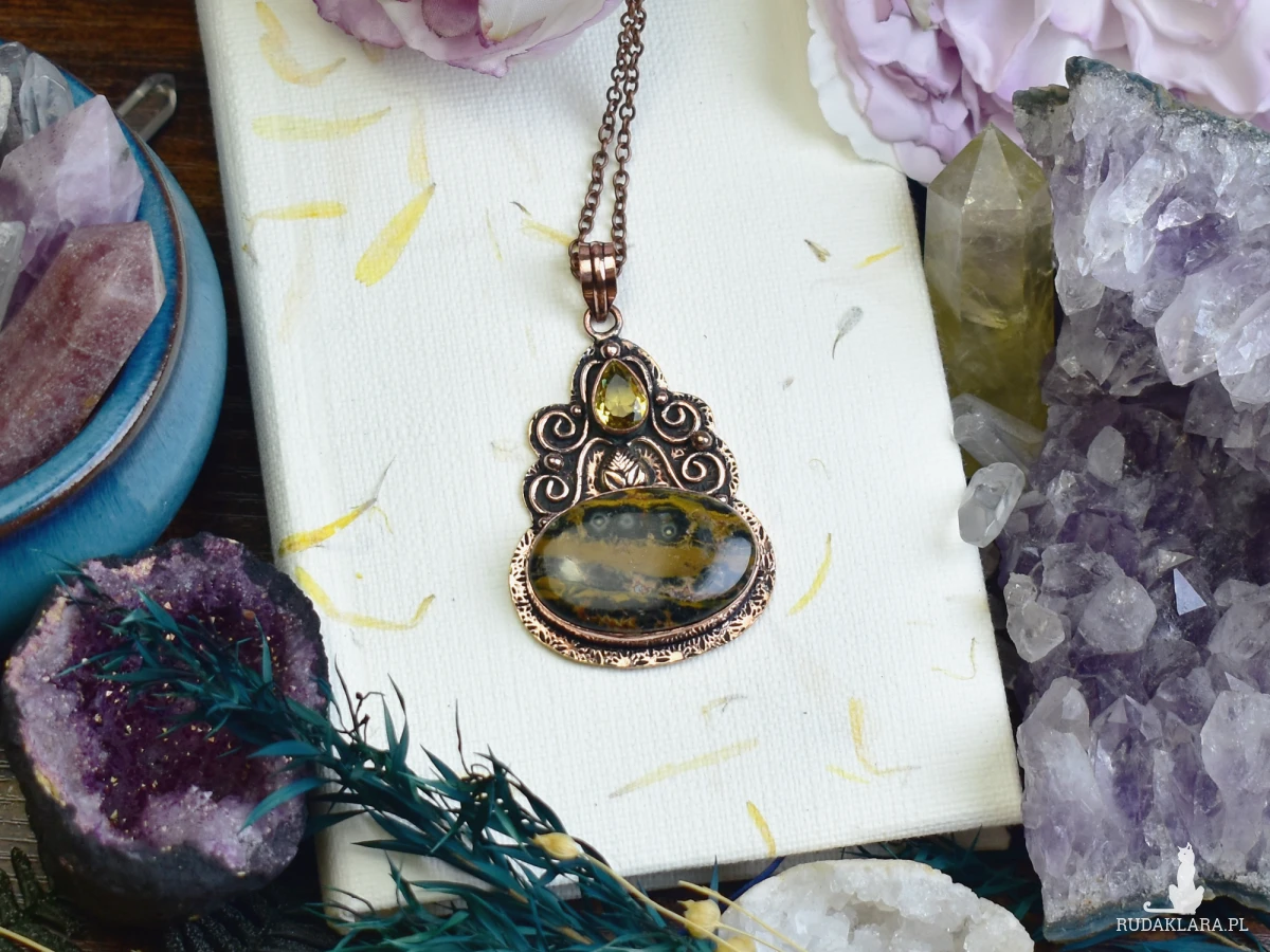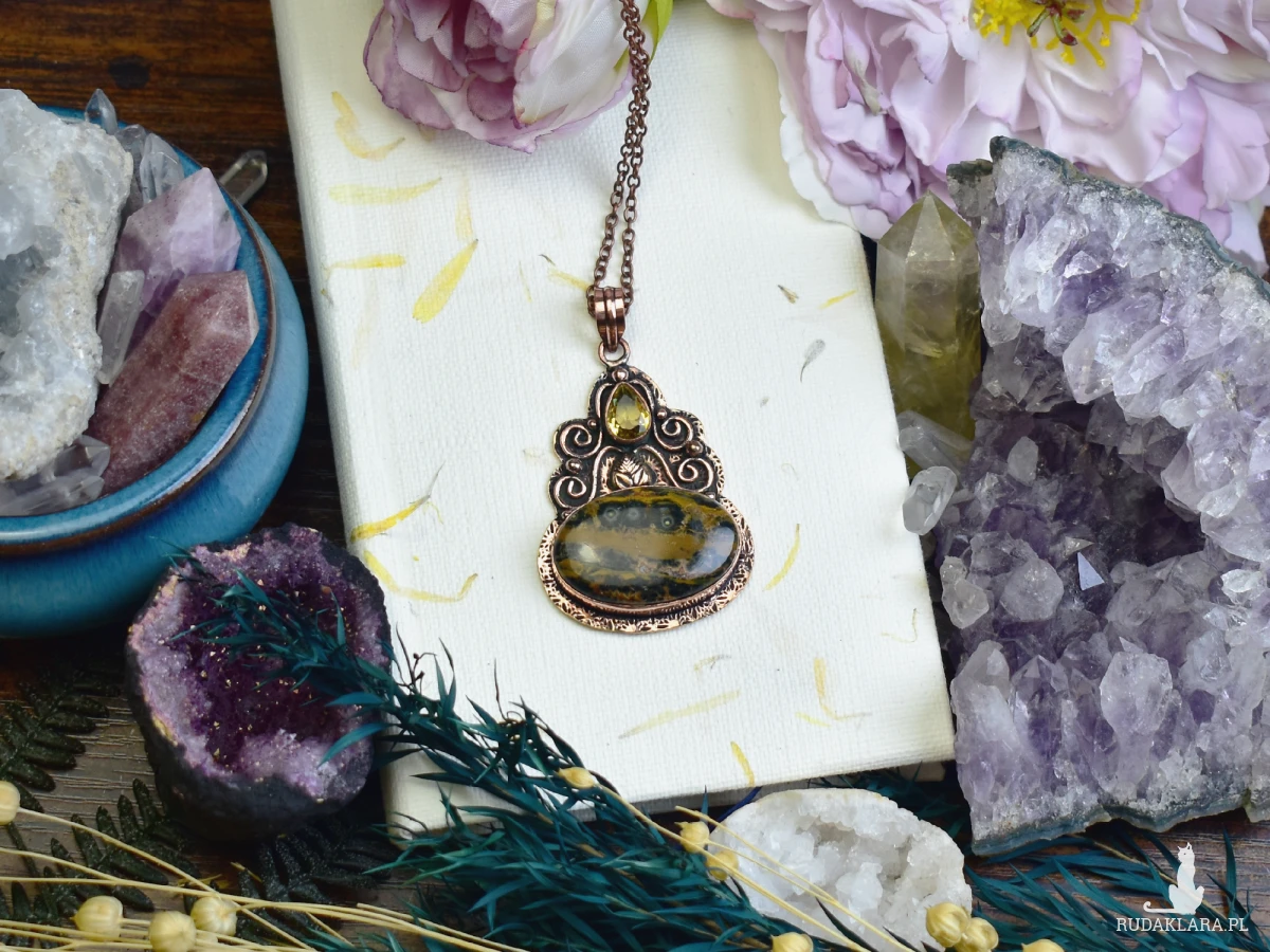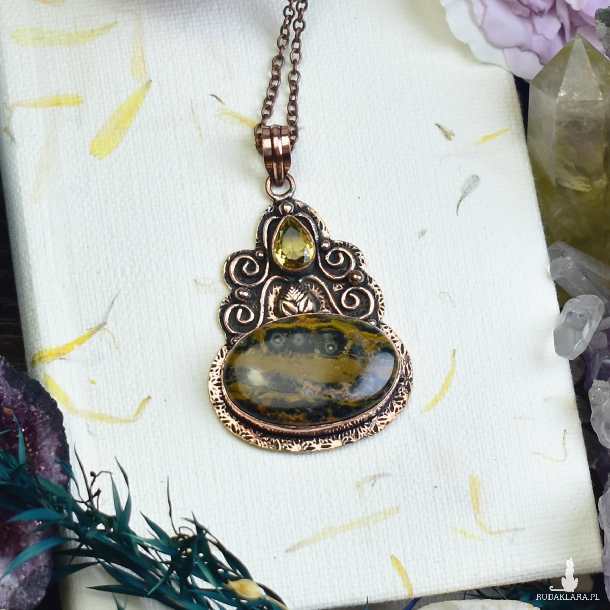 Ręcznie wykonany miedziany wisiorek ozdobiony jaspisem i cytrynem. Jaspis, znany ze swoich ochronnych właściwości, symbolizuje siłę i stabilność, natomiast cytryn od wieków kojarzony jest z energią, radością i dobrobytem. Tradycyjna technika tworzenia podkreśla unikalny charakter biżuterii, łącząc surową estetykę miedzi z naturalnym pięknem kamieni. Ten wyjątkowy amulet wspiera wewnętrzną harmonię, dodaje pewności siebie i przyciąga pozytywną energię.