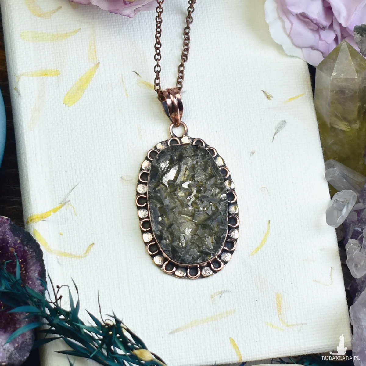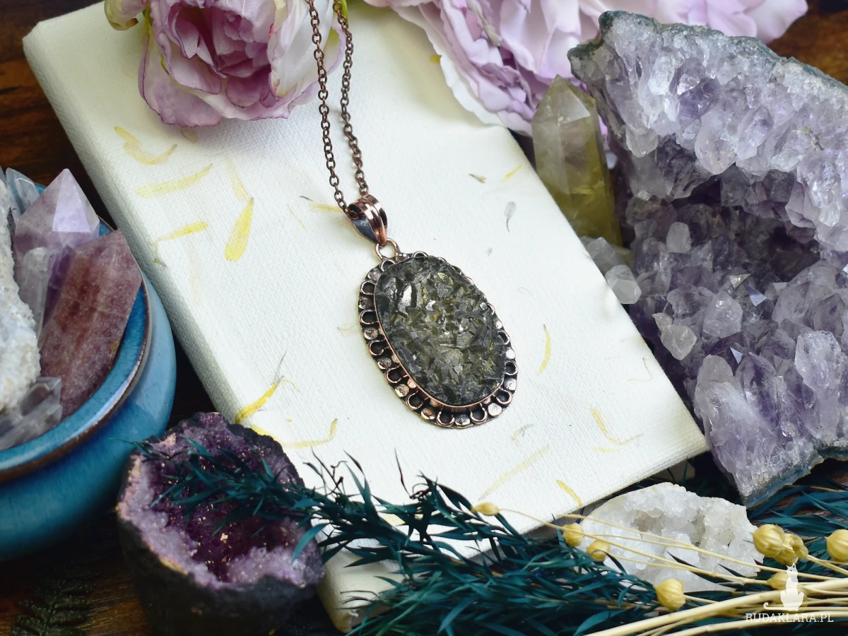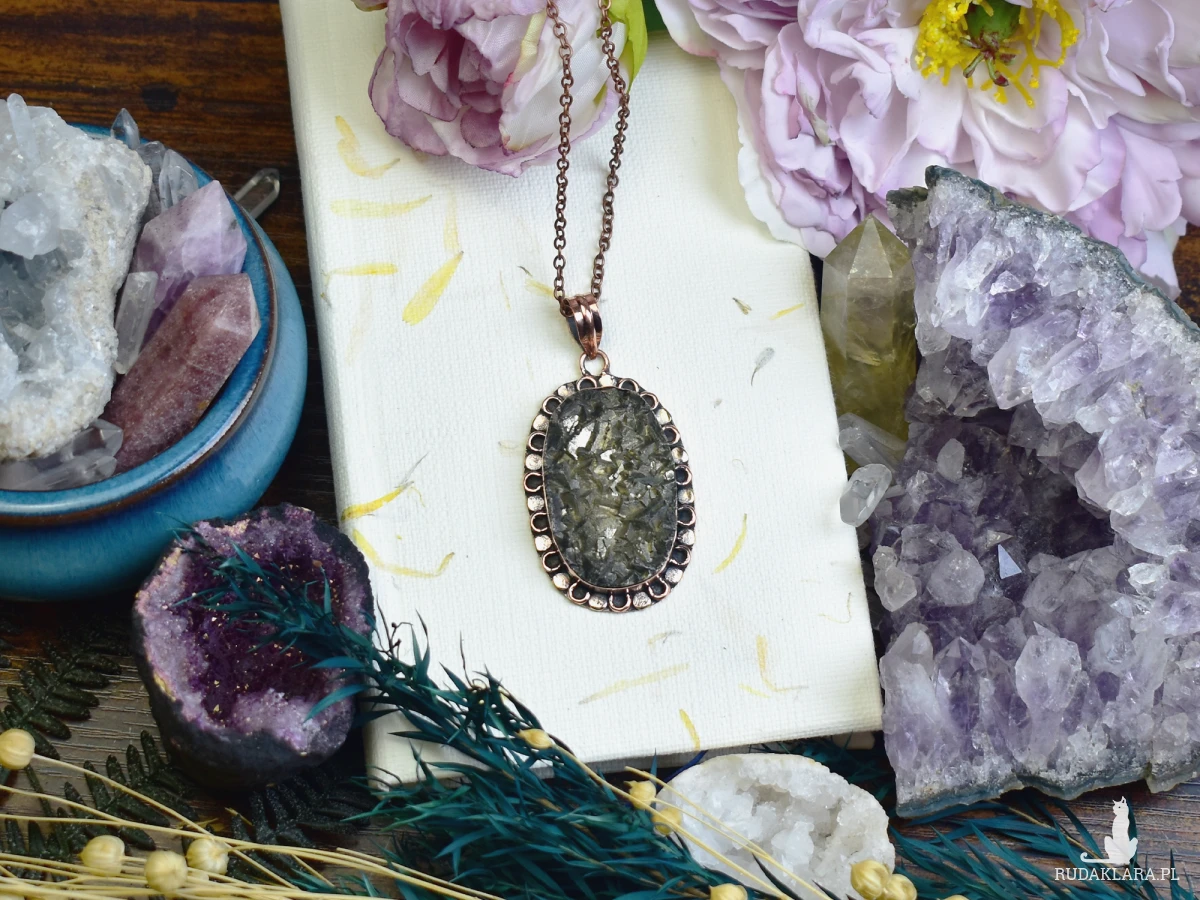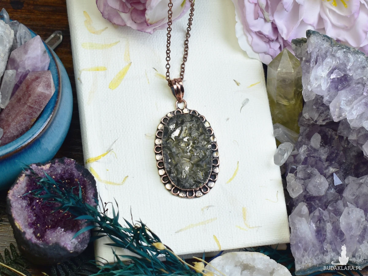 Miedziany wisiorek zdobiony surowym pirytem, wykonany tradycyjnymi technikami jubilerskimi. Piryt, nazywany „kamieniem słońca”, symbolizuje siłę, witalność i dobrobyt. Jego złocisty blask przyciąga pozytywną energię i dodaje pewności siebie. Wisiorek łączy naturalny urok minerału z rzemieślniczym kunsztem, tworząc unikalną ozdobę i osobisty amulet.