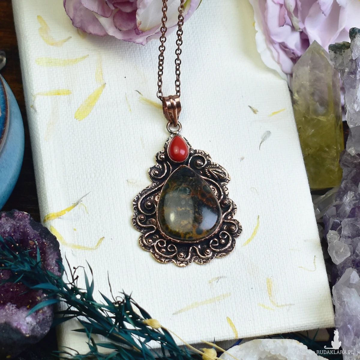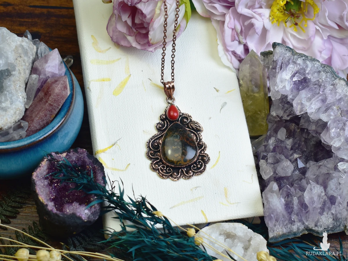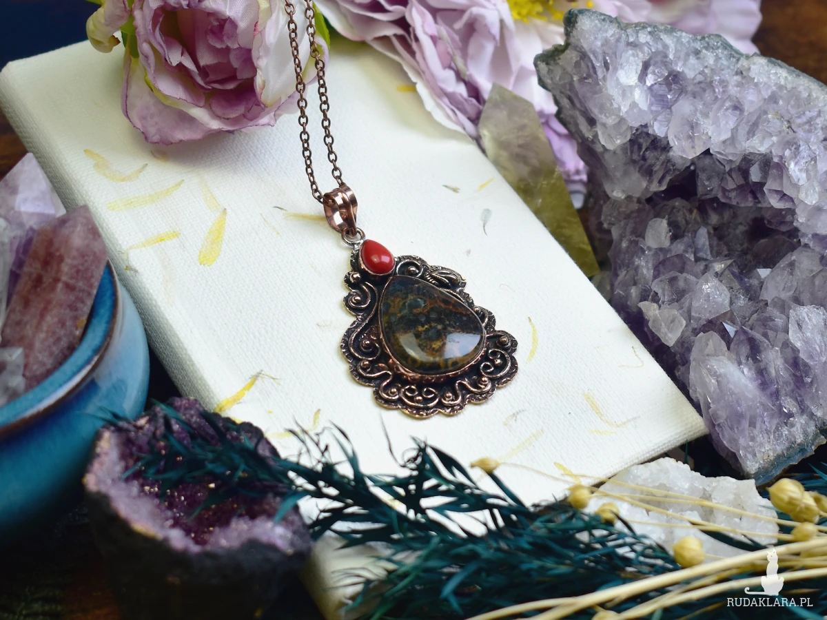 Ozdobny miedziany wisiorek z jaspisem o naturalnym wzorze i niewielkim koralem. Wykonany tradycyjnymi metodami, podkreśla surowe piękno kamieni. Jaspis symbolizuje stabilność i siłę, a koral dodaje energii i ochrony. Harmonijne połączenie naturalnych elementów sprawia, że wisiorek może być zarówno biżuterią, jak i osobistym talizmanem.