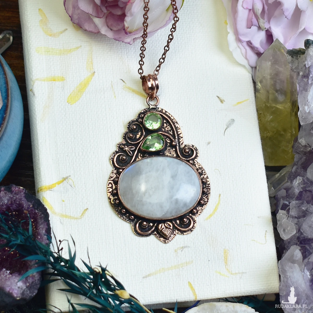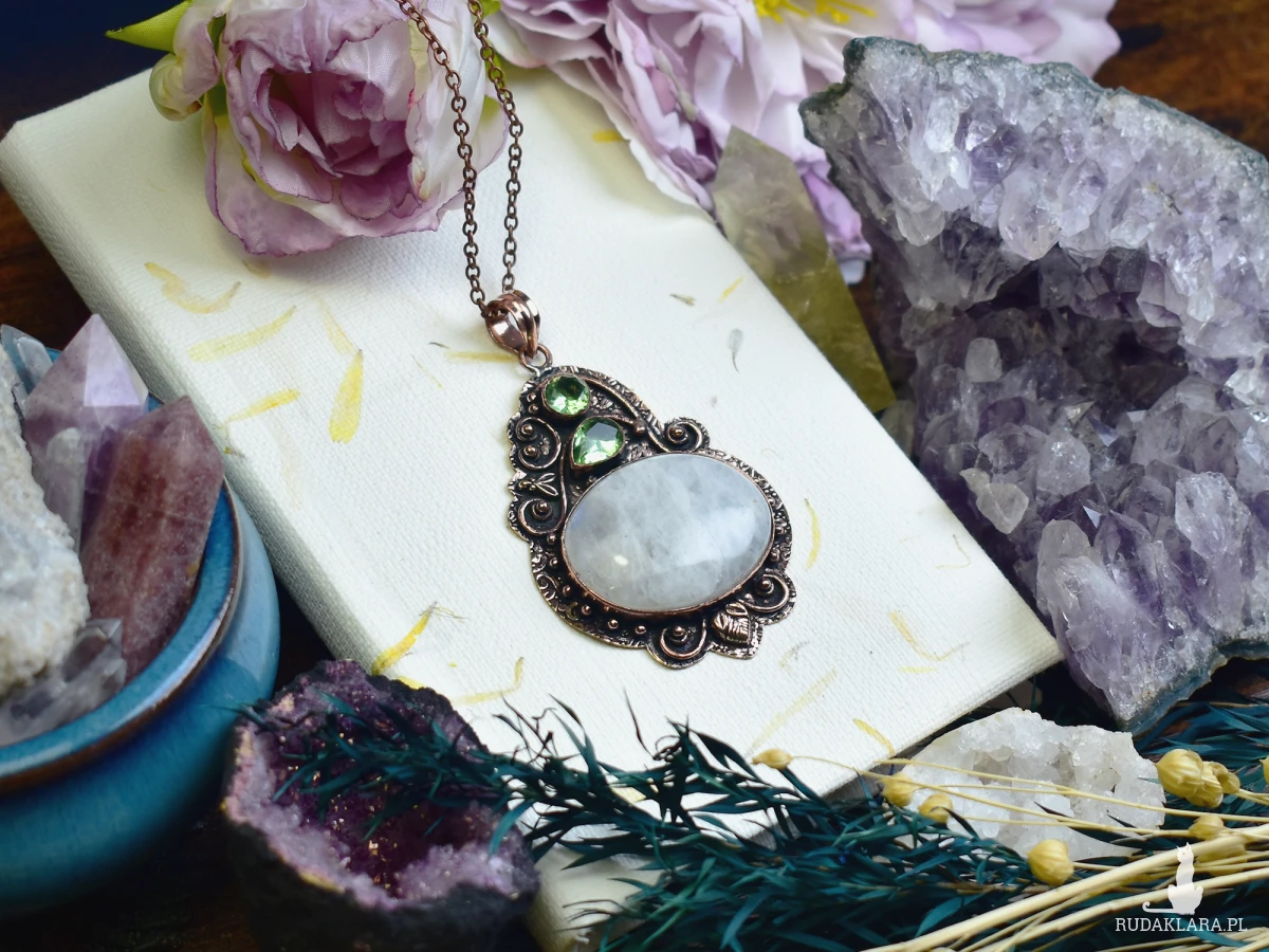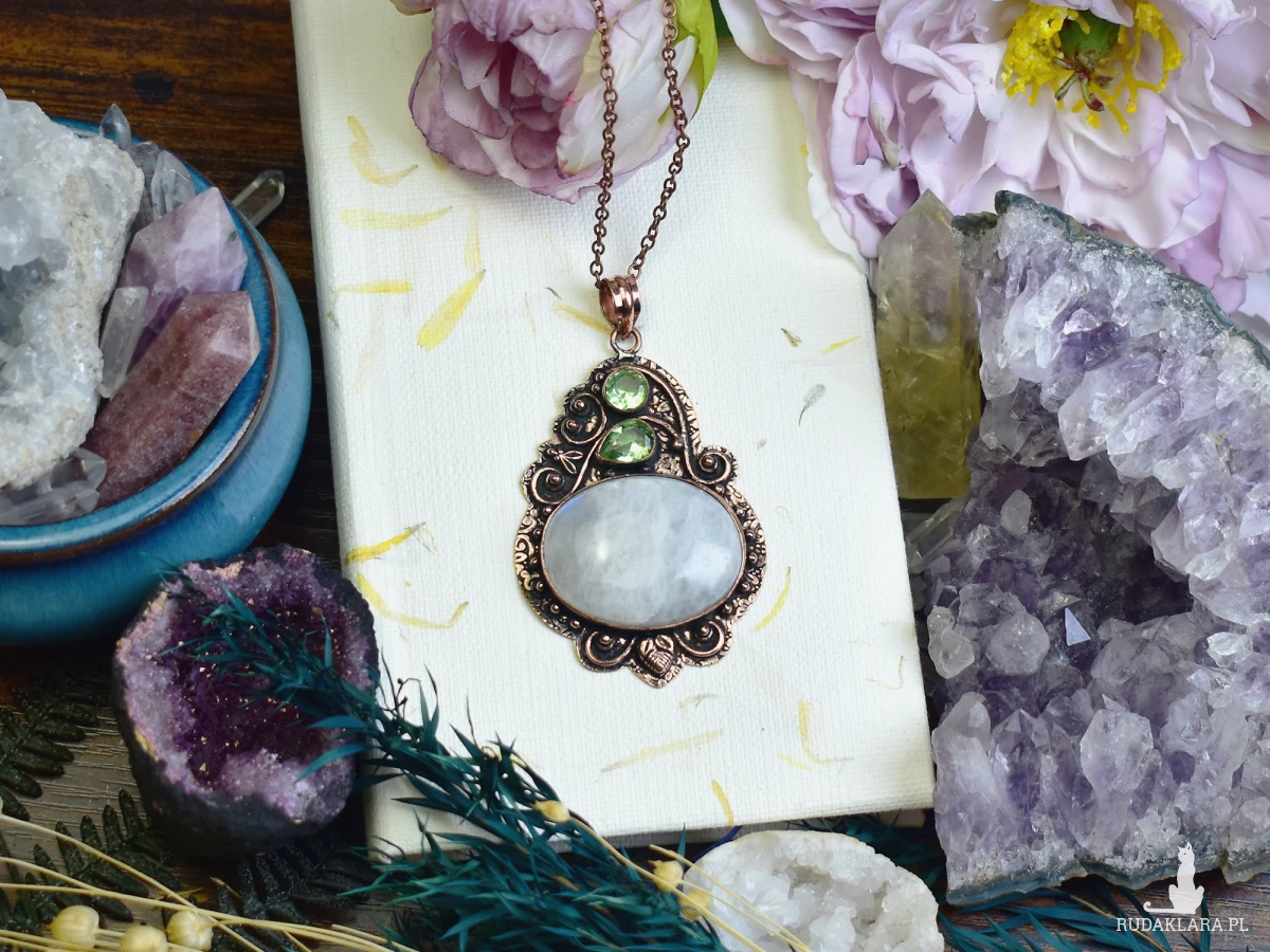 Miedziany wisiorek z kamieniem księżycowym o subtelnej opalizującej poświacie i małym peridotem o intensywnej zieleni. Kamień księżycowy symbolizuje intuicję i wewnętrzny spokój, a peridot przyciąga pozytywną energię. Biżuteria wykonana tradycyjnymi technikami podkreśla naturalne piękno minerałów.