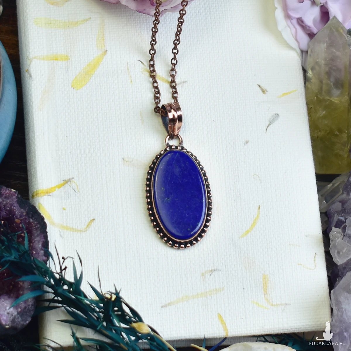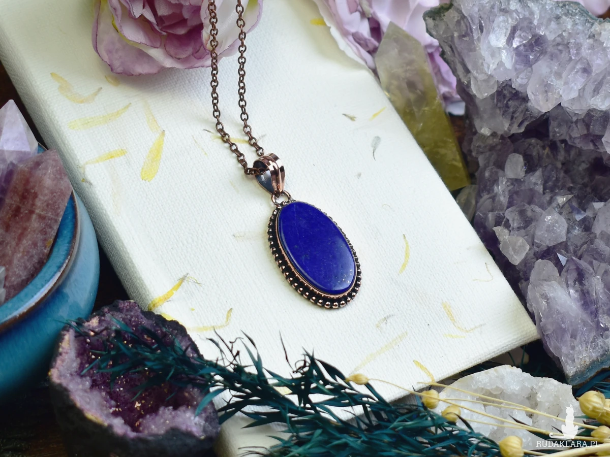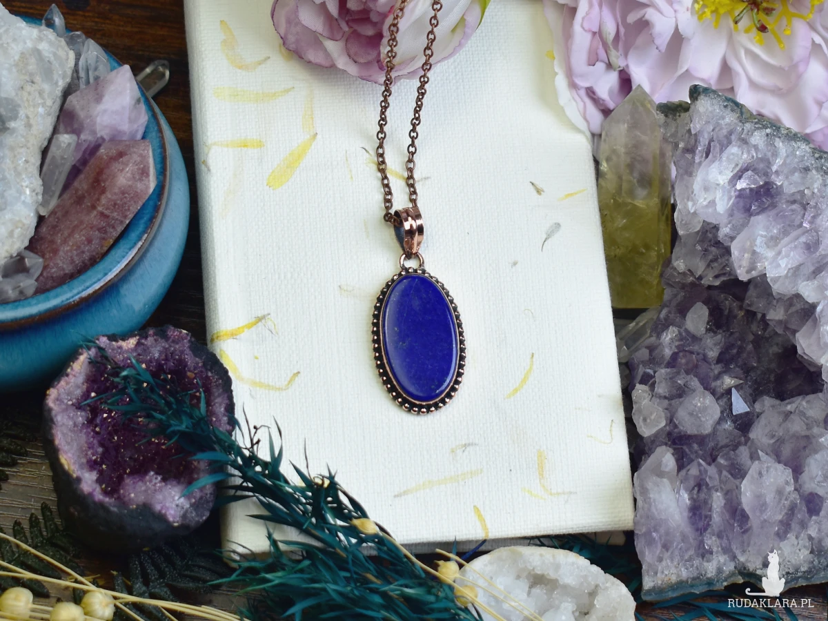 Miedziany wisiorek zdobiony lapisem lazuli – kamieniem o głębokiej, niebieskiej barwie z charakterystycznymi złotawymi refleksami. Lapis lazuli od wieków symbolizuje mądrość, wewnętrzną harmonię i duchową głębię. Wisiorek wykonany tradycyjnymi technikami jubilerskimi łączy artystyczne rzemiosło z naturalnym pięknem kamienia, tworząc niepowtarzalny amulet pełen pozytywnej energii.