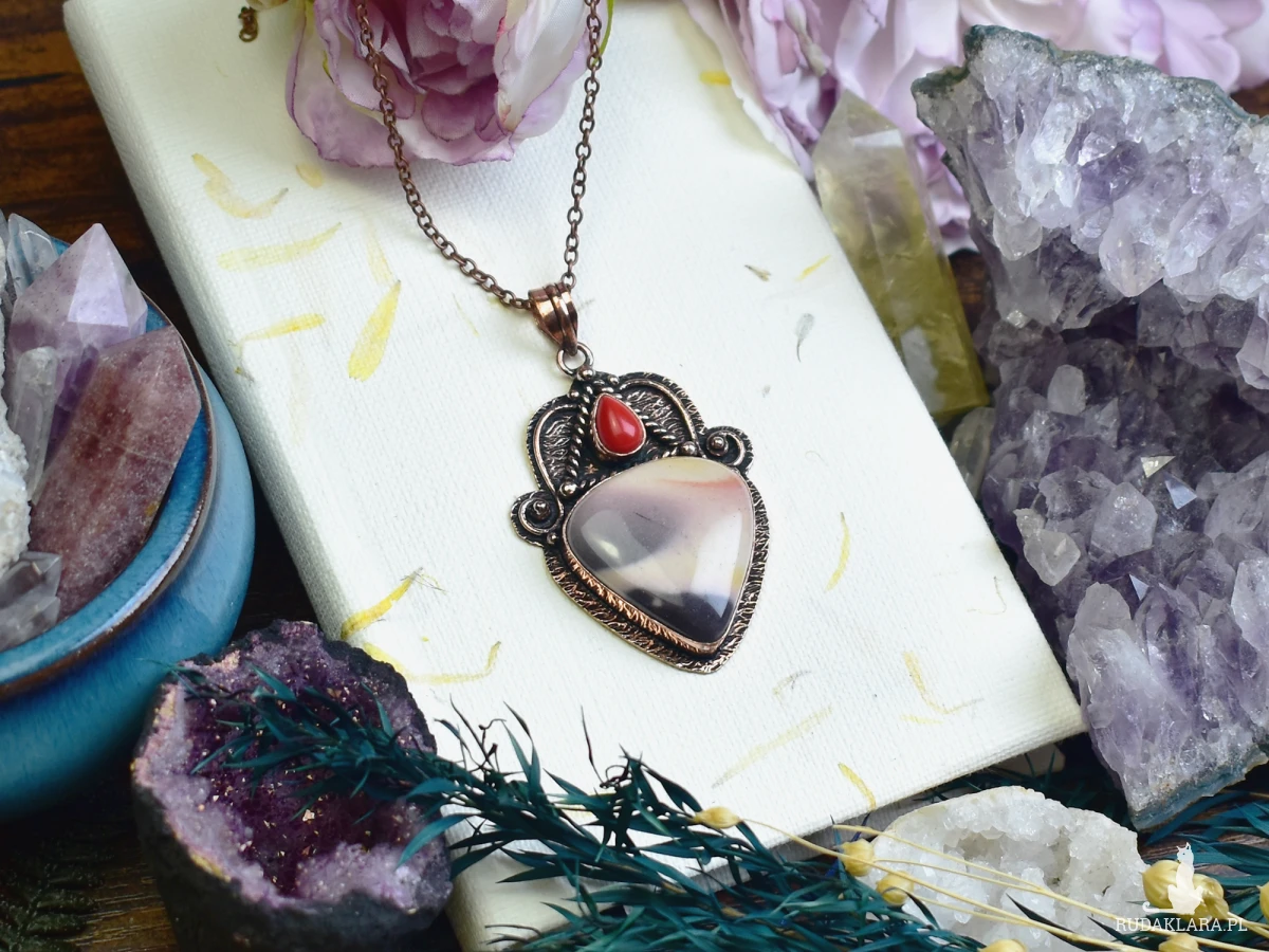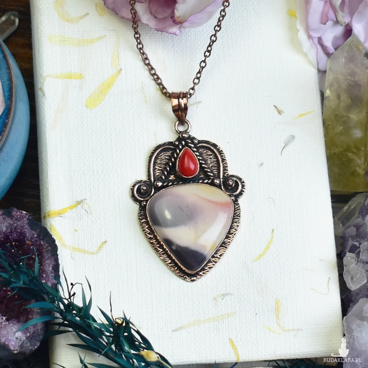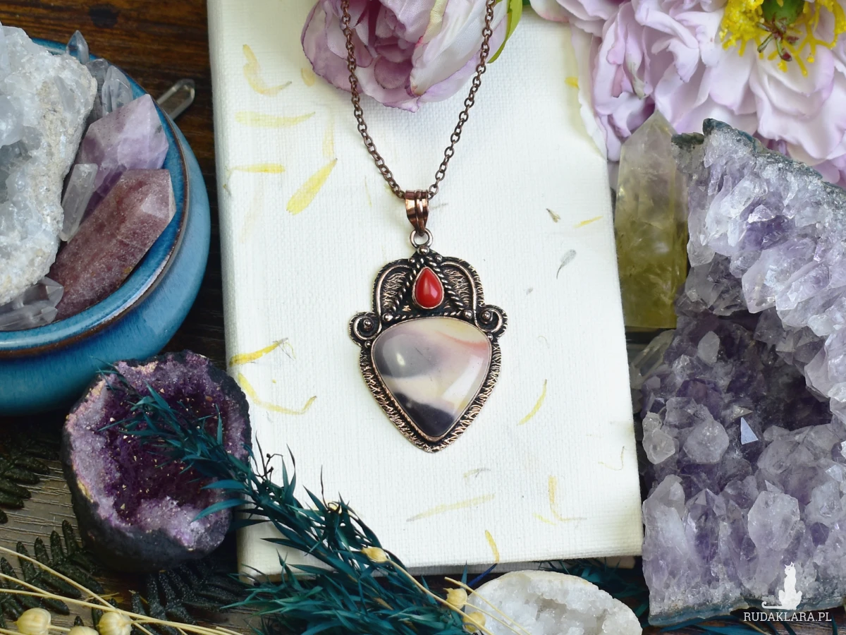 Ozdobny miedziany wisiorek z jaspisem mokaitem i koralem, wykonany tradycyjnymi technikami jubilerskimi. Mokait to kamień ceniony za swoje ciepłe barwy i właściwości wzmacniające wewnętrzną harmonię oraz odwagę. Koral od wieków kojarzony jest z ochroną i pozytywną energią. Połączenie tych minerałów tworzy unikalny talizman, łączący naturalne piękno z symbolicznym znaczeniem. Starannie dopracowany, doskonały dla osób ceniących biżuterię z duszą.