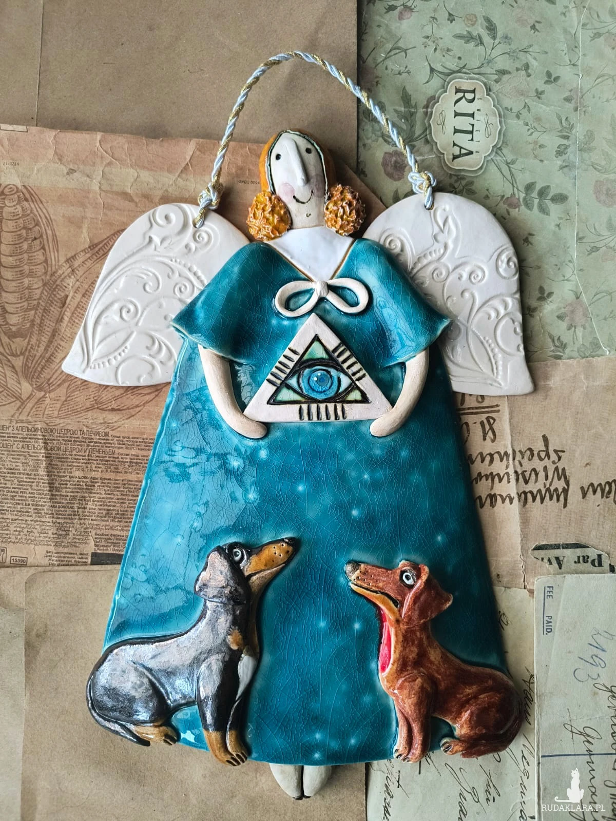 Uroczy aniołek ceramiczny z 2 jamnikami wykonany z gliny szamotowej, wypalony na biskwit, a następnie szkliwiony w temperaturze 1260 stopni C. Wymiary ok 18,5 cm x 24,5 cm. Do powieszenia na ścianie na ozdobnym sznureczku. Idealny jako prezent okolicznościowy lub do ozdoby domu.
