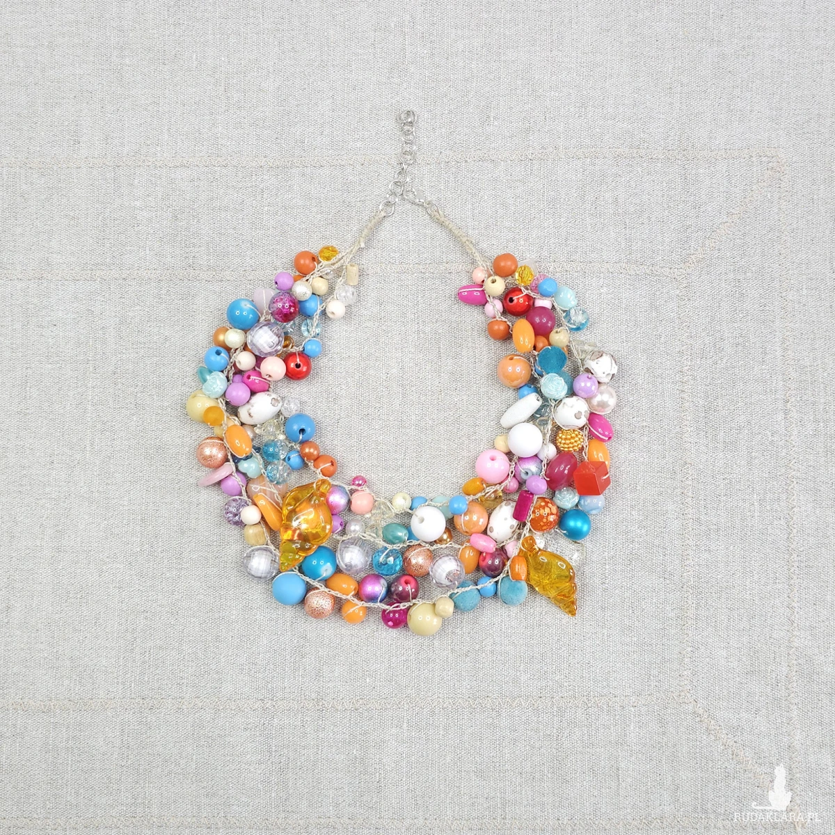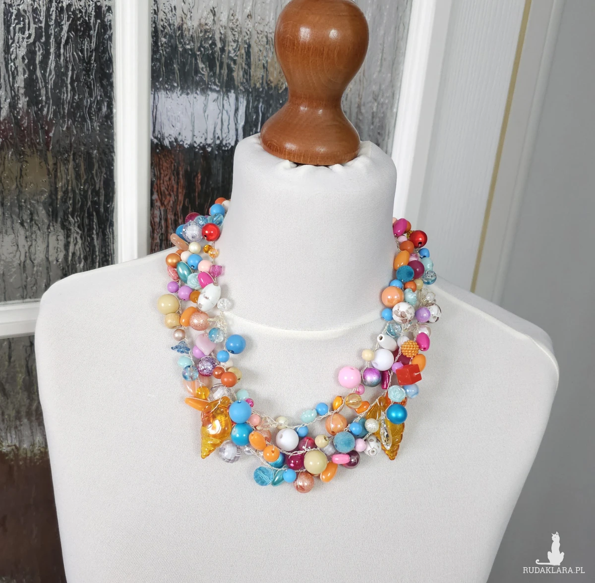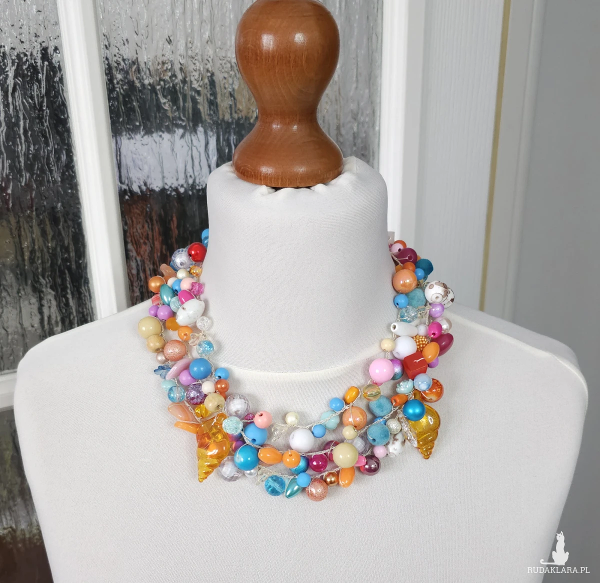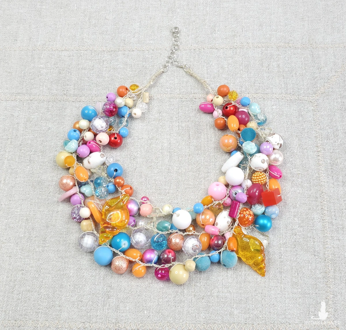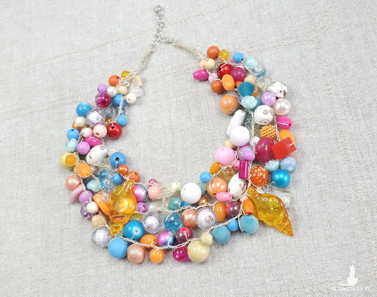 Naszyjnik składa się z różnorodnych koralików w odcieniach błękitu, pomarańczu i różu, uzupełnionych o efektowne zawieszki przypominające bursztynowe muszle.