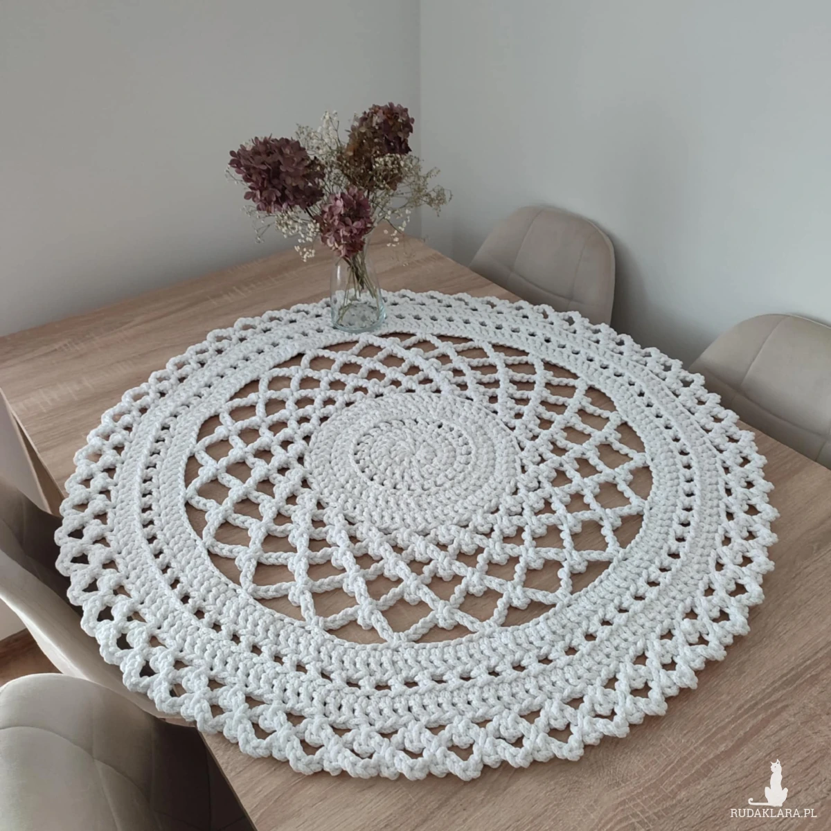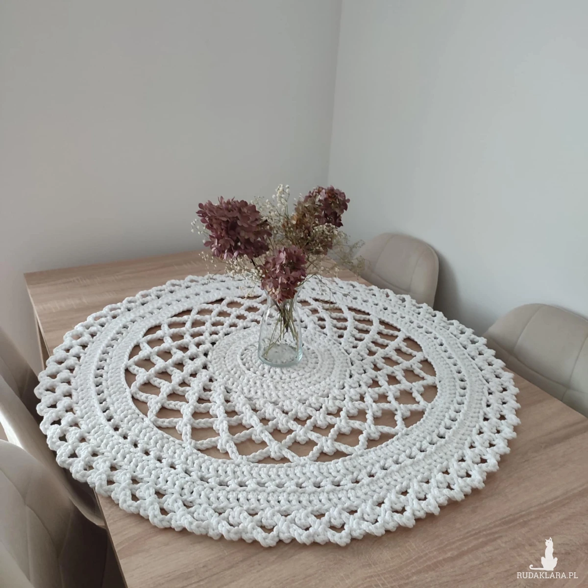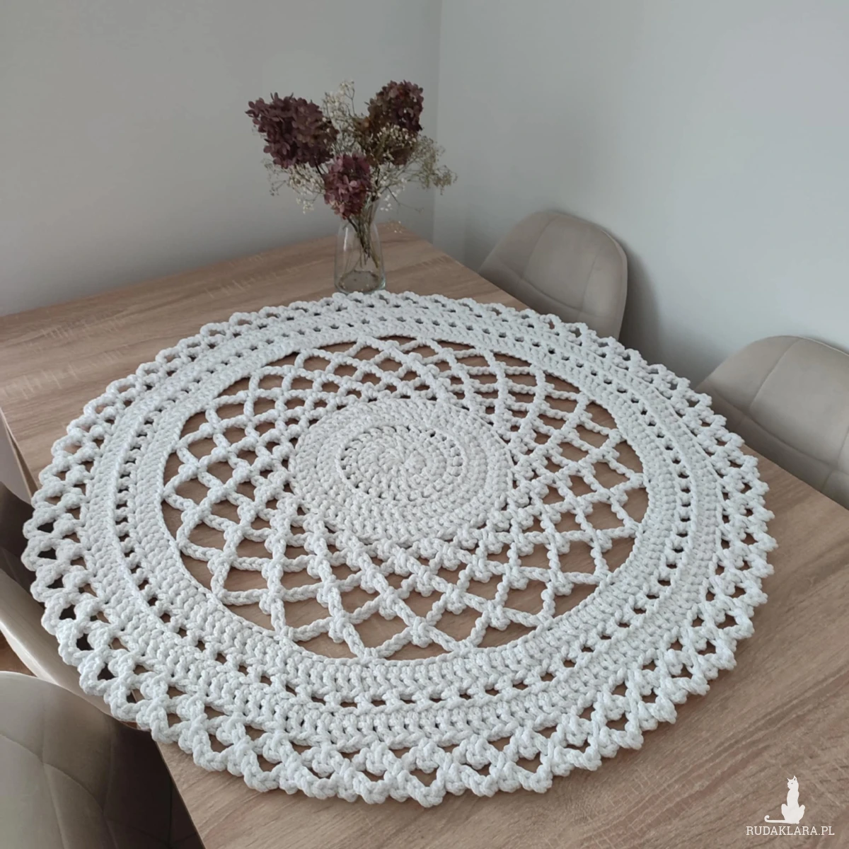 Serweta o średnicy 90cm, wykonana metodą szydełkowania z polskiego sznurka bawełnianego 5mm.