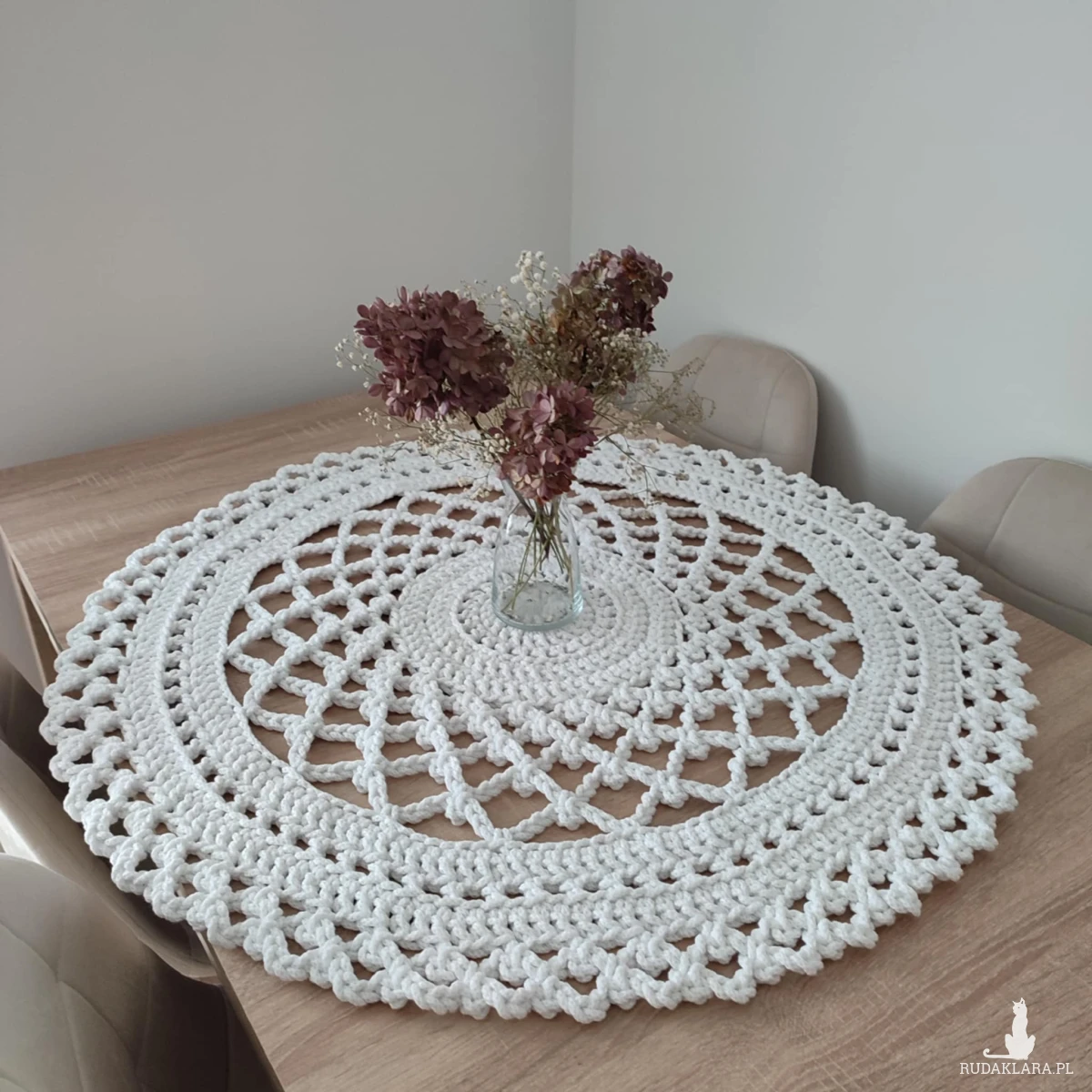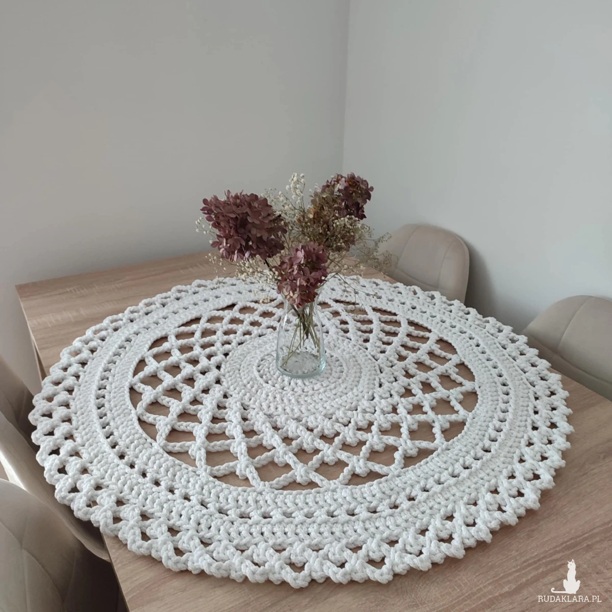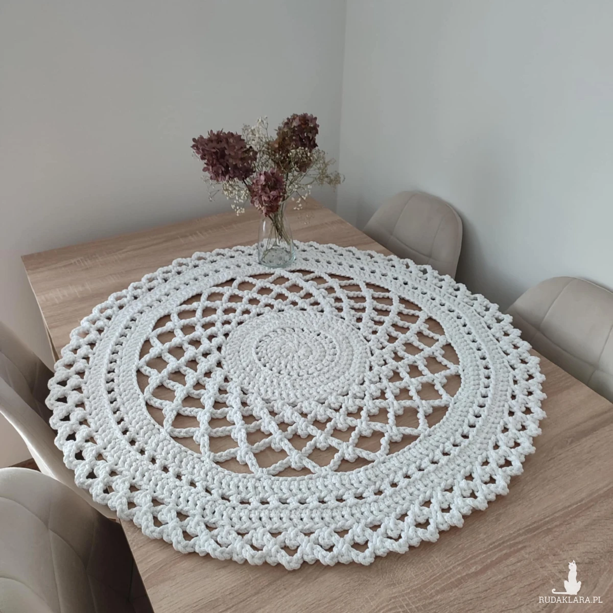 Serweta o średnicy 90cm, wykonana metodą szydełkowania z polskiego sznurka bawełnianego 5mm.