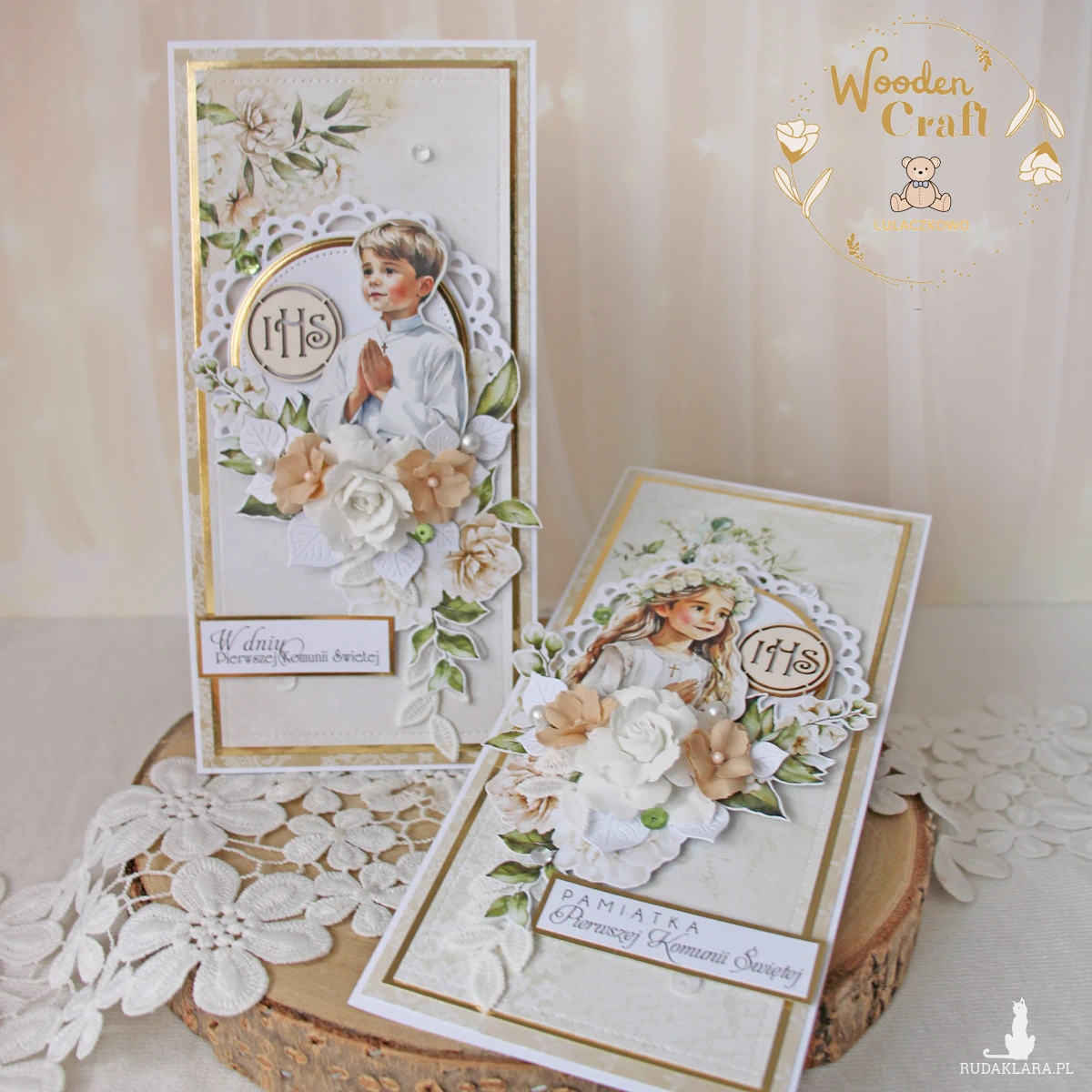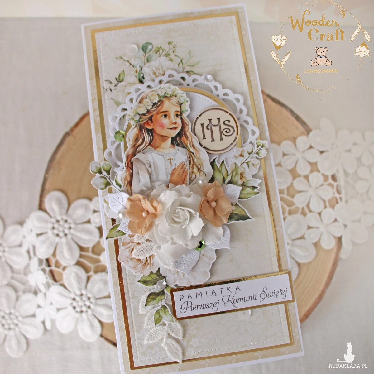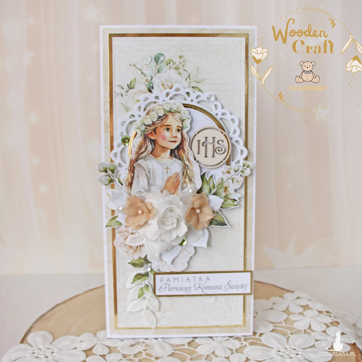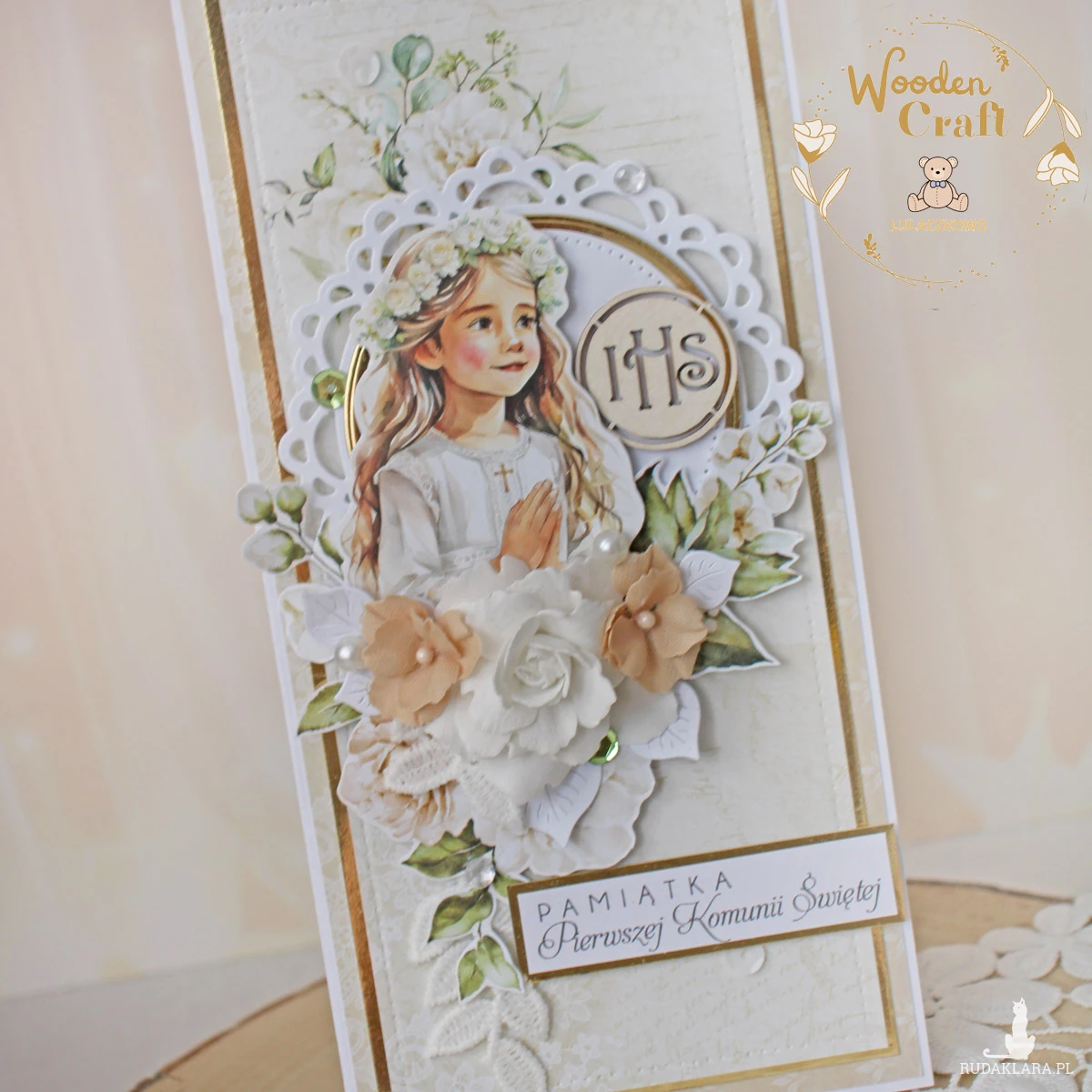 Piękna i elegancka pamiątka Pierwszej Komunii Świętej zamknięta w białym pudełeczku z okienkiem, wykonana ręcznie z najwyższą starannością, z cudownej i delikatnej kolekcji papierów "Simple Story", utrzymana w odcieniach delikatnego beżu, zgaszonej zieleni oraz bieli z dodatkiem złotych, błyszczących akcentów. Na środku kartki umieszona została grafika dziewczynki komunijnej w towarzystwie hostii, ozdobiona kompozycją kwiatową z ręcznie robionymi kwiatami, udekorowana koronką, kryształkami oraz napisem "Pamiątka Pierwszej Komunii Świętej"- do napisu mogę również dodać imię dziecka lub całkowicie zmienić go na inny.