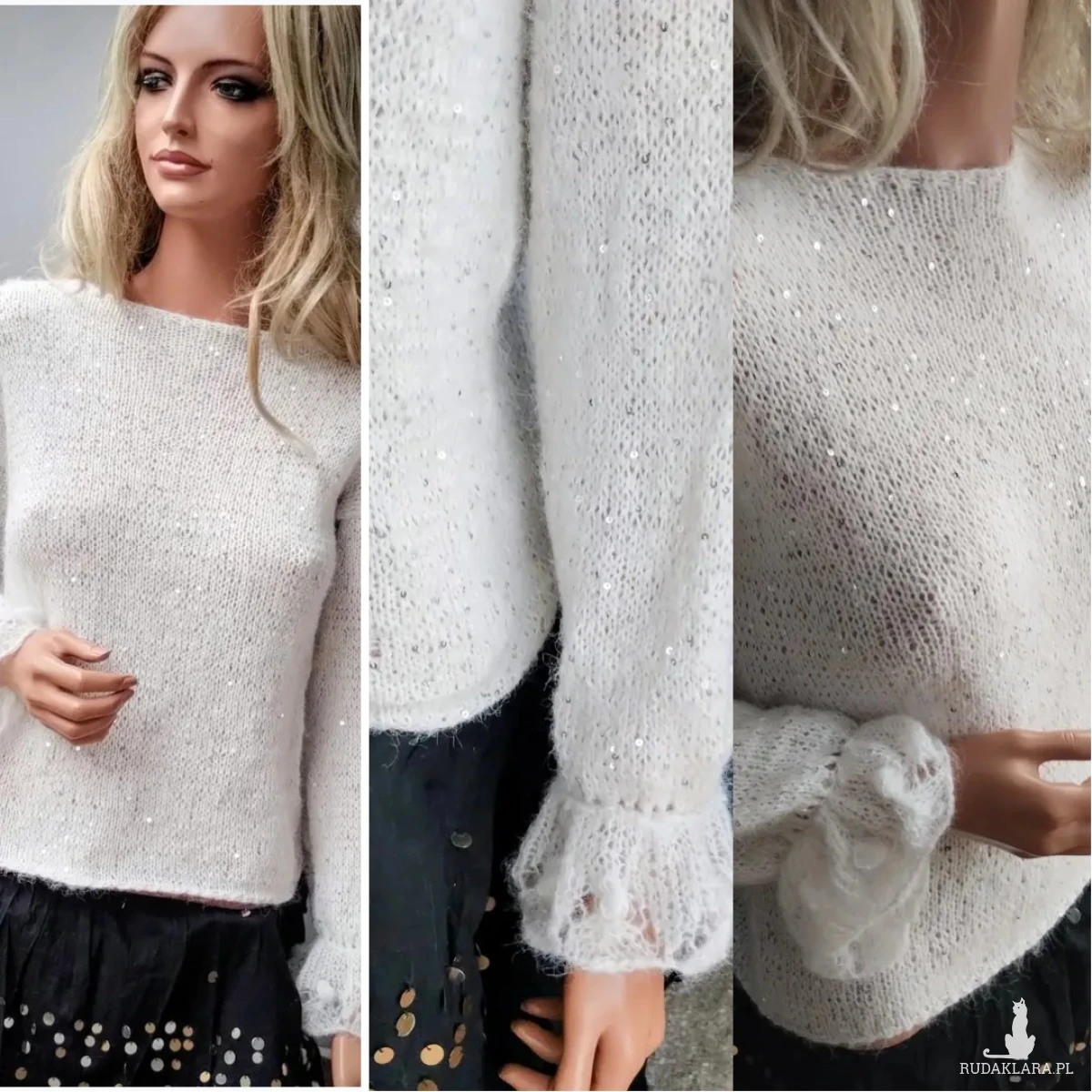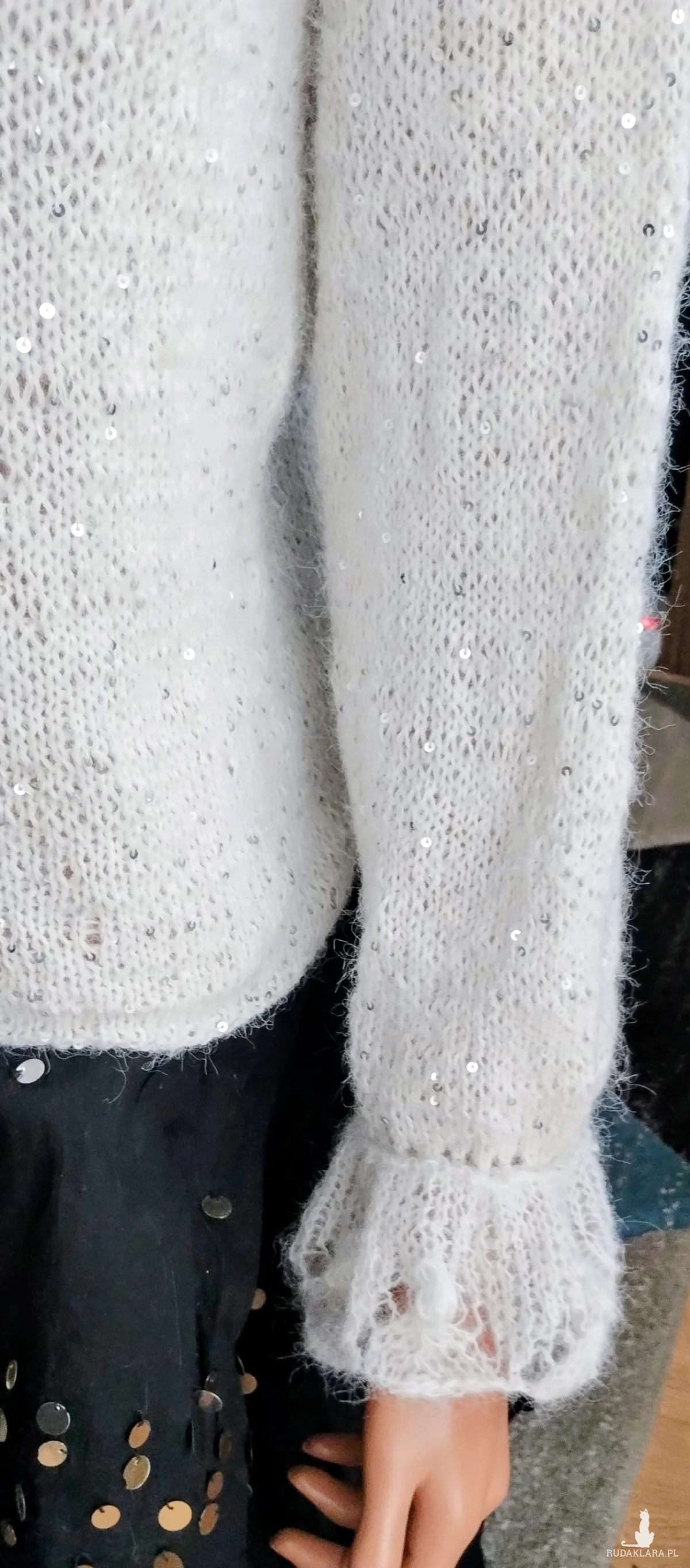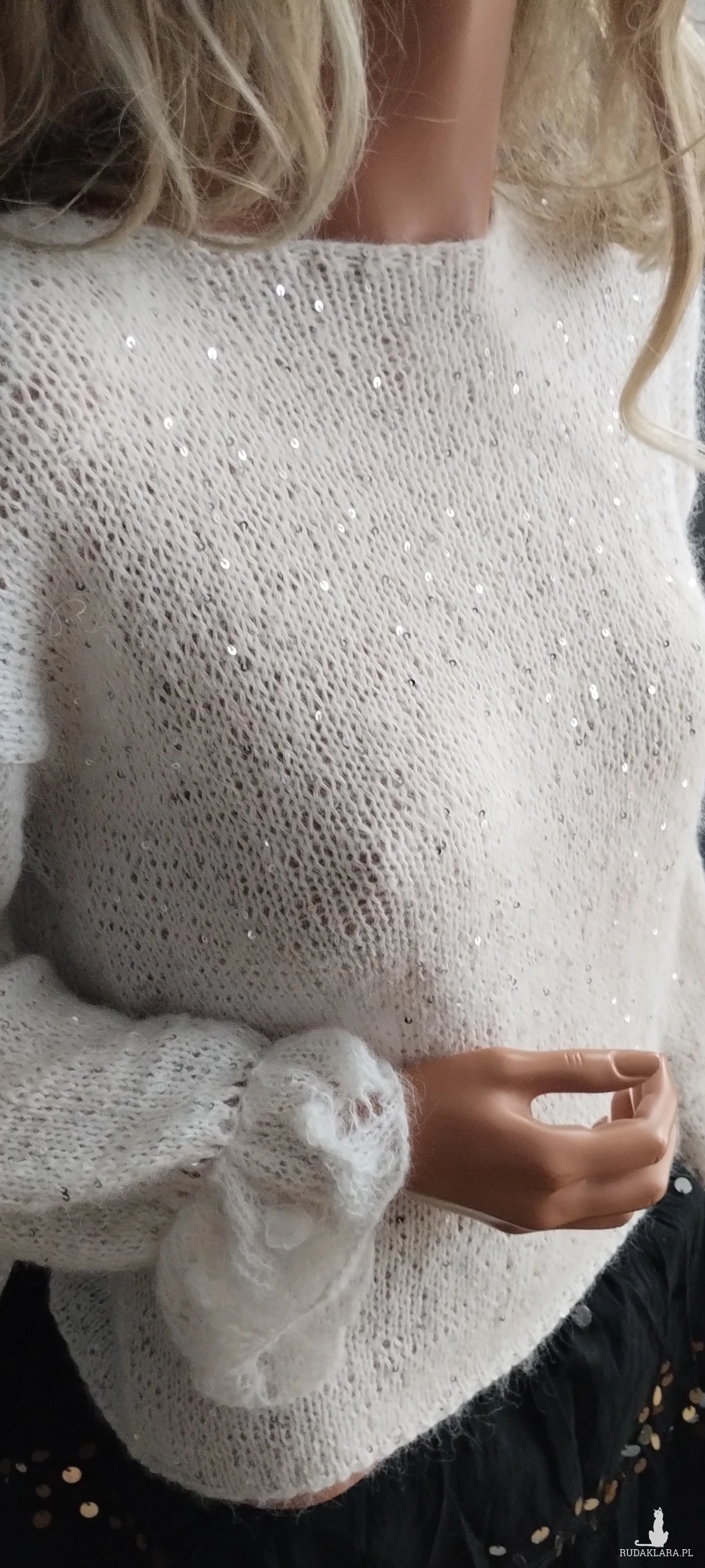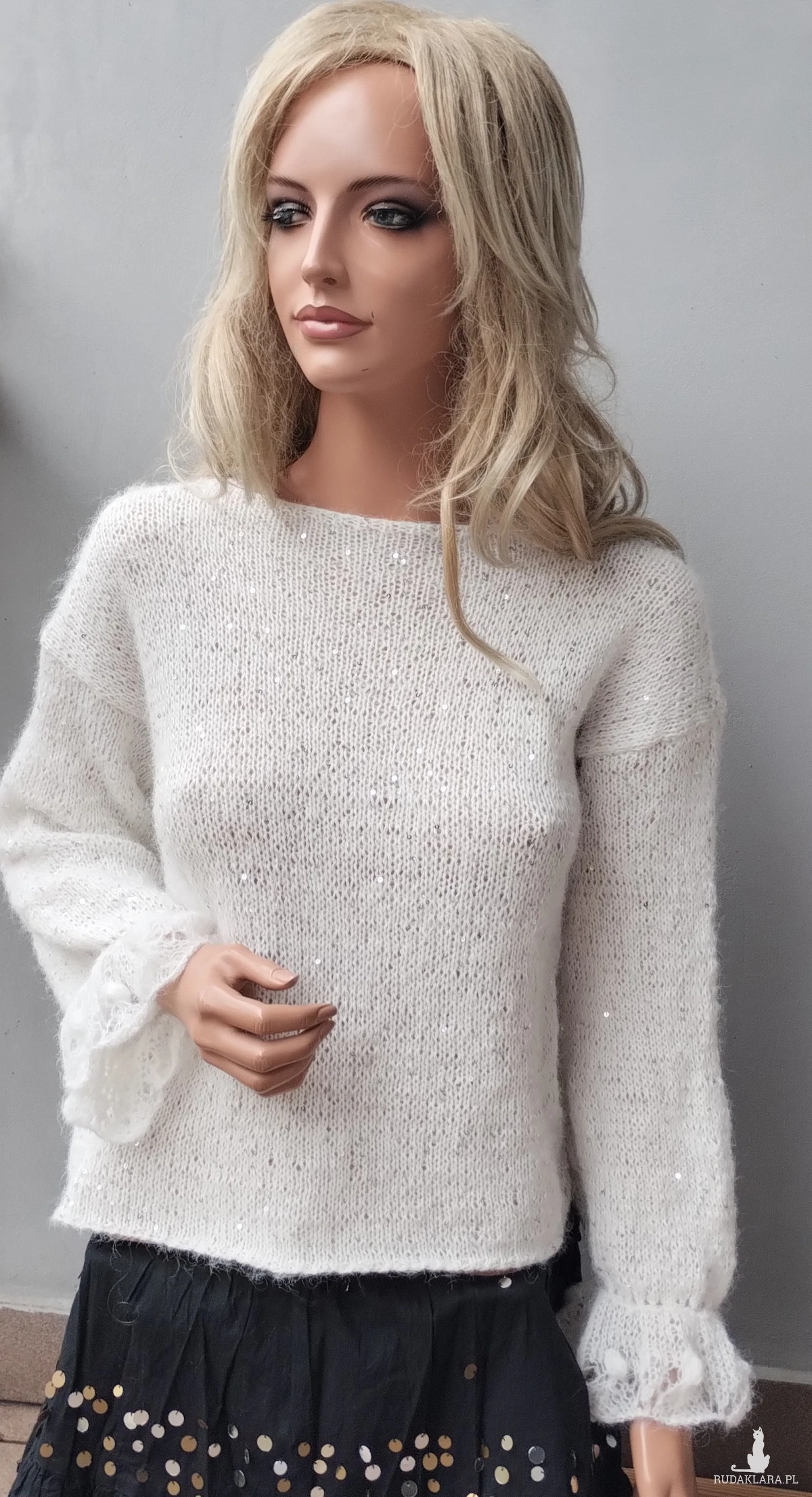 Delikatna bluzecz zrobiona ręcznie na drutach z mieszanki moheru,alpaki i bawełny z cekinami.