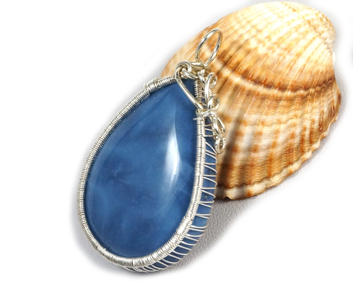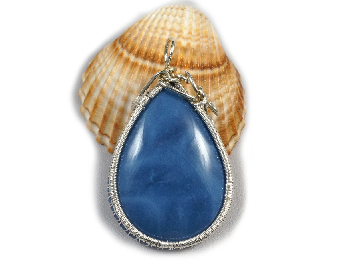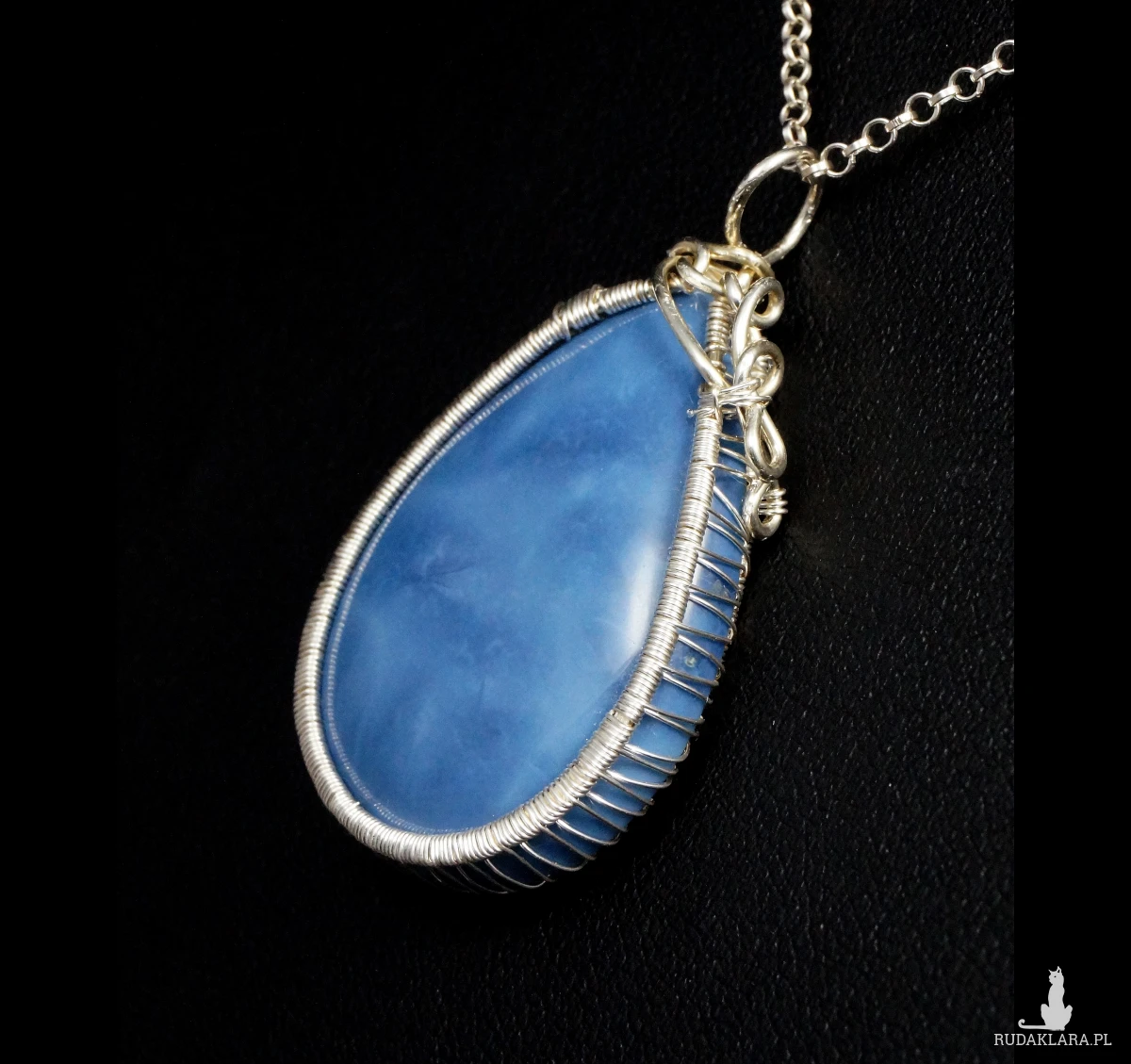 Bajeczny, misternie pleciony wisior z kaboszonem opalu niebieskiego.