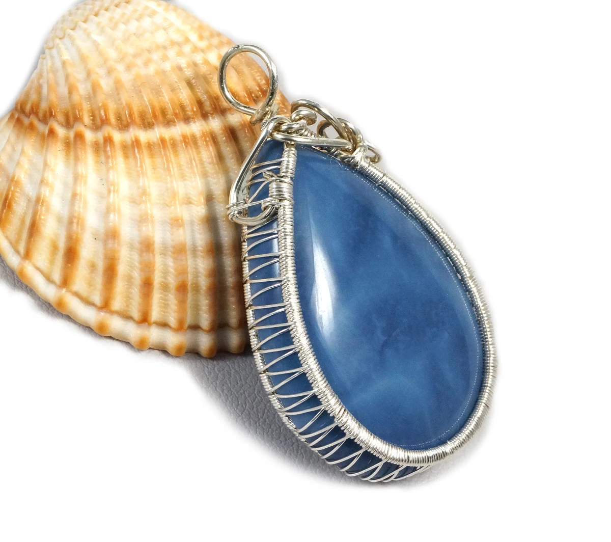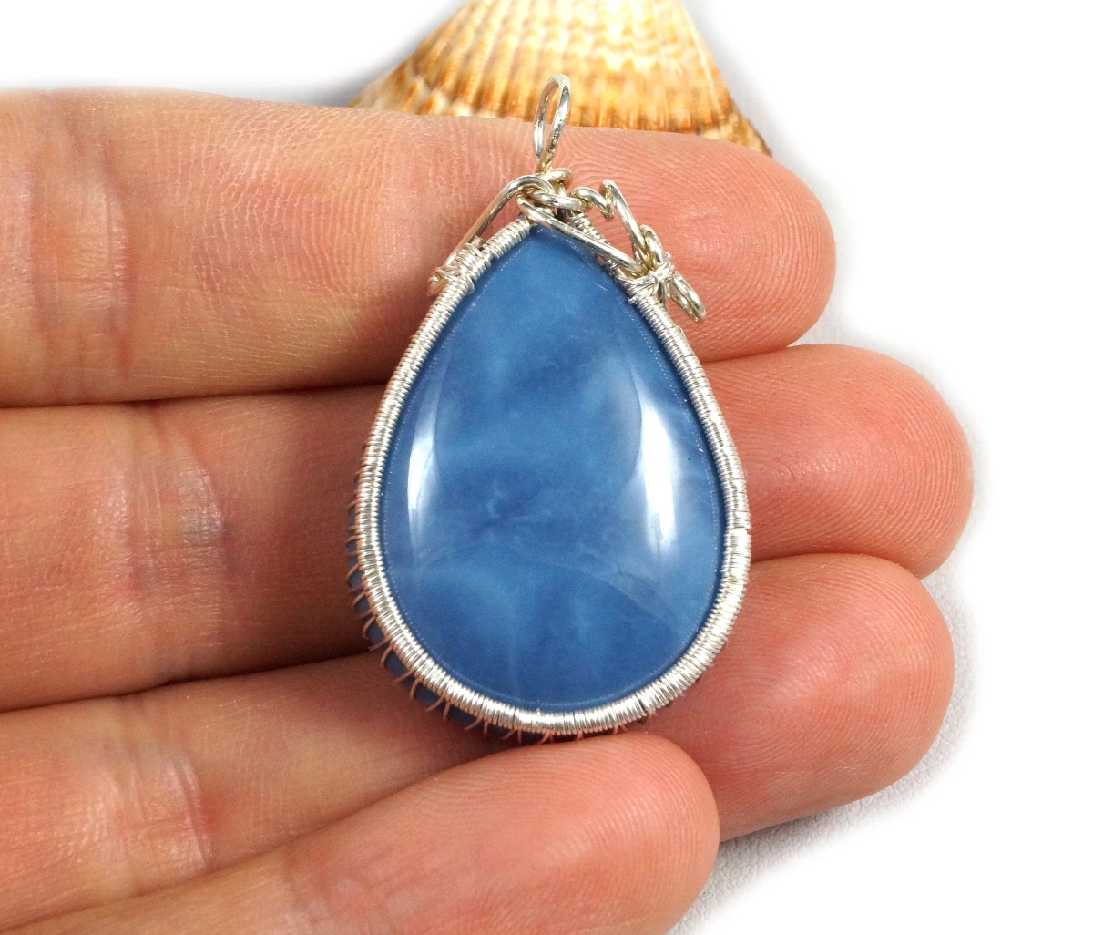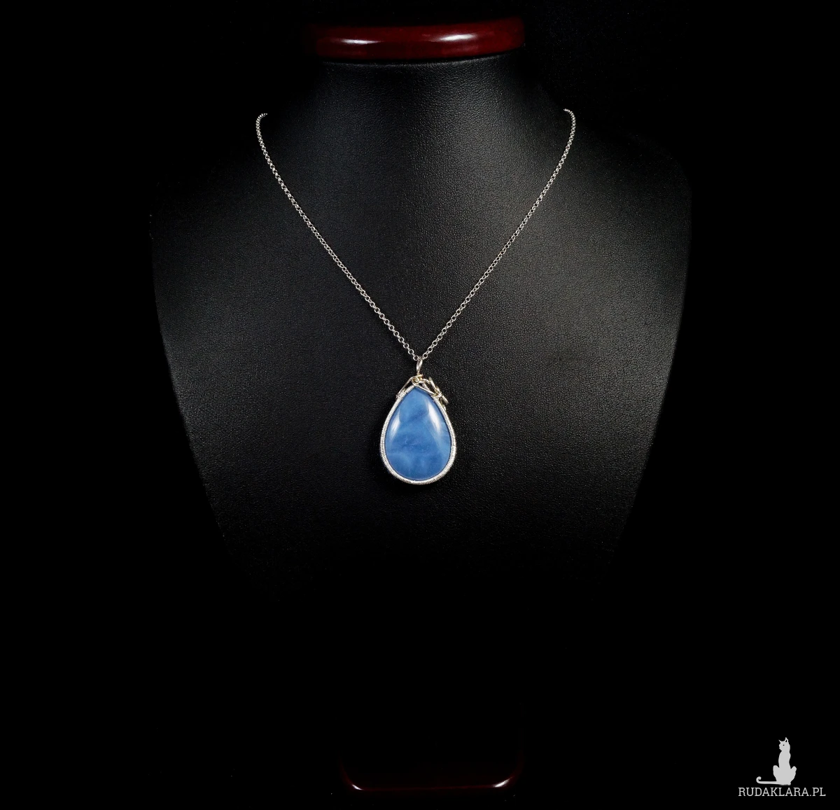 Bajeczny, misternie pleciony wisior z kaboszonem opalu niebieskiego.