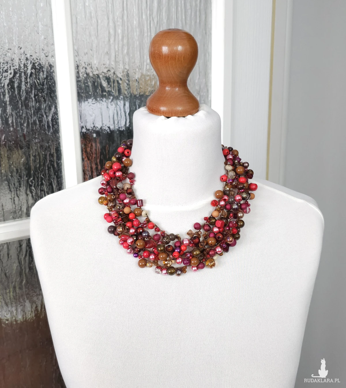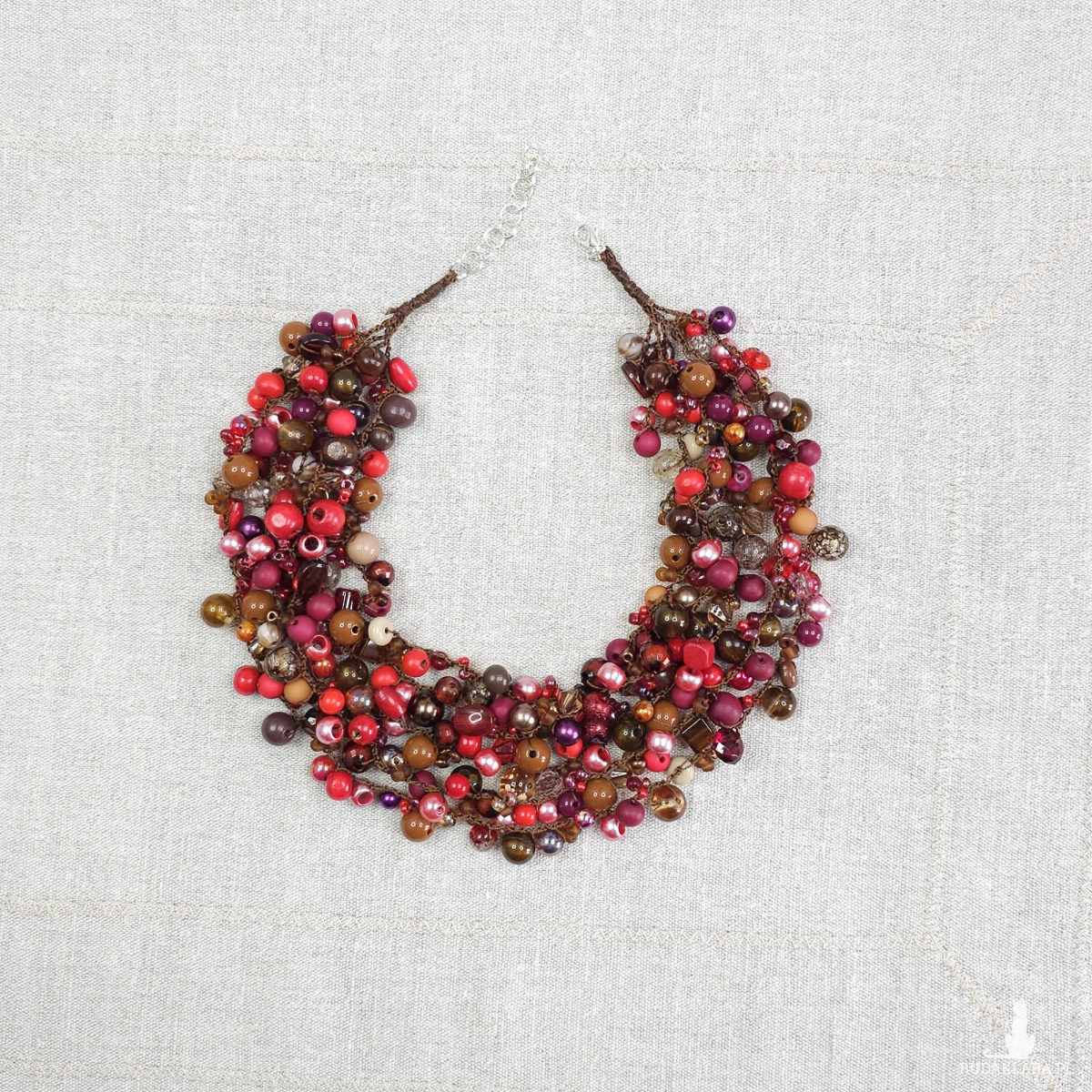 Kompozycja składa się z koralików o różnych kształtach i wykończeniach (matowe, błyszczące, transparentne) w nasyconych kolorach: od krwistej czerwieni i bordo, po ciepłe brązy i odcienie miedzi.