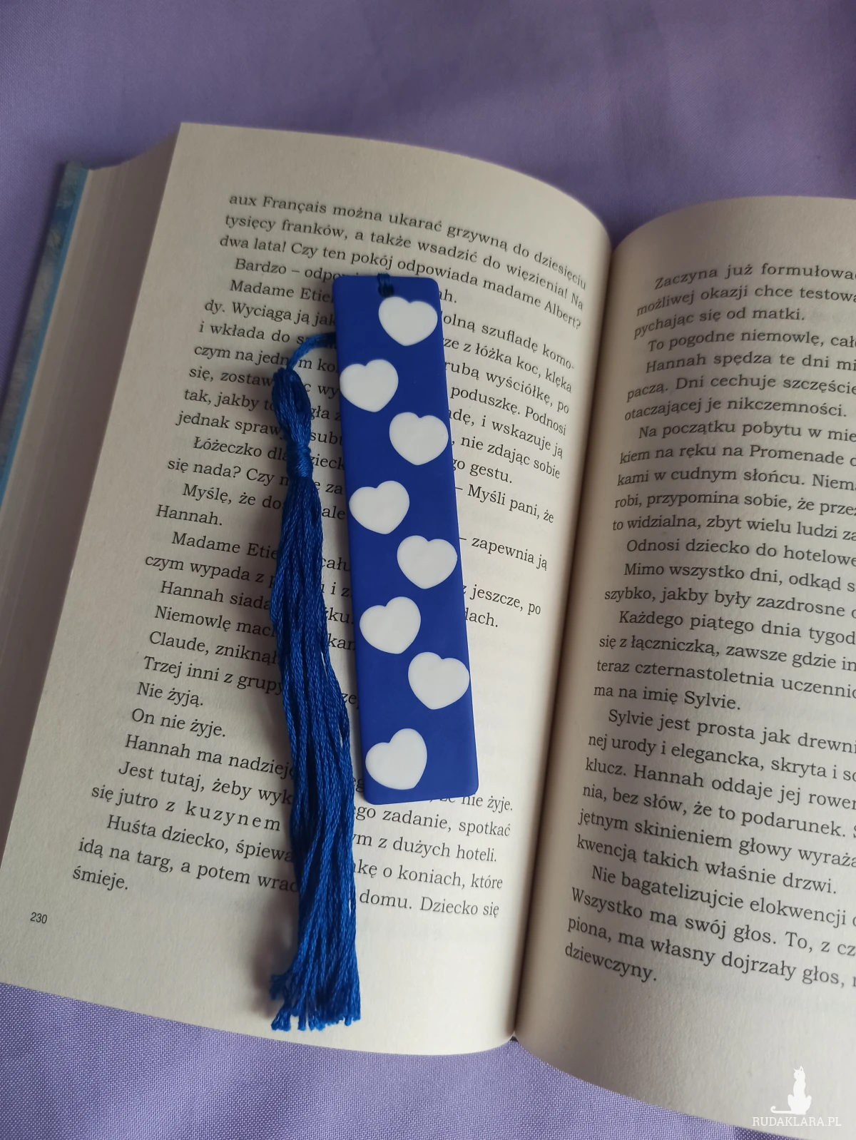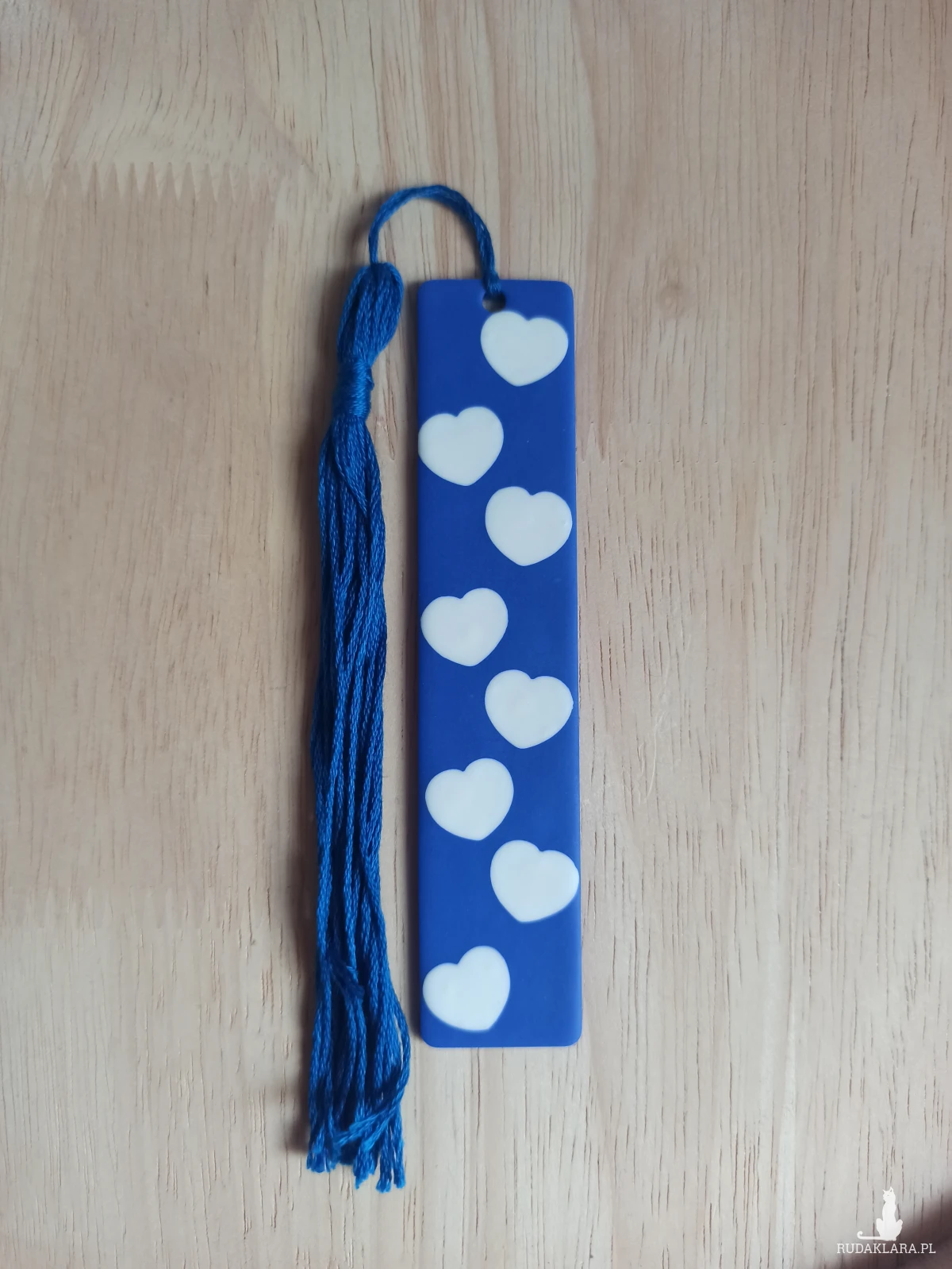 Zakładka do książki wykonana z wysokiej jakości gliny polimerowej w kolorze kobaltowym/ chabrowym z serduszkami w kolorze białym.