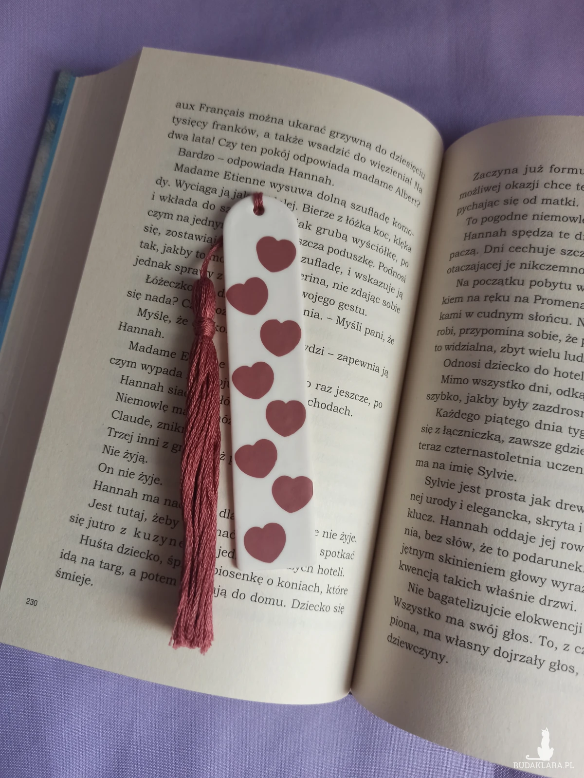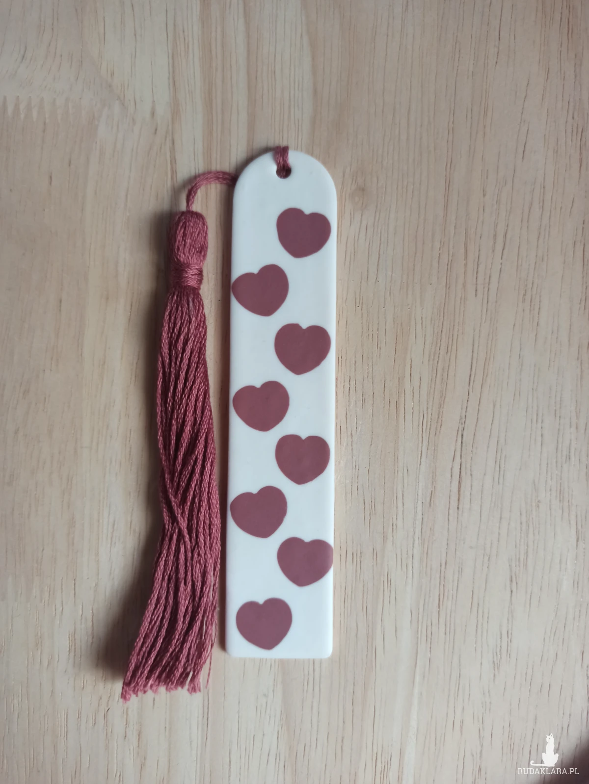 Zakładka do książki wykonana z wysokiej jakości gliny polimerowej w kolorze białym z serduszkami w kolorze brudnego różu.