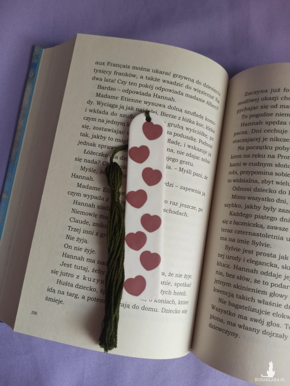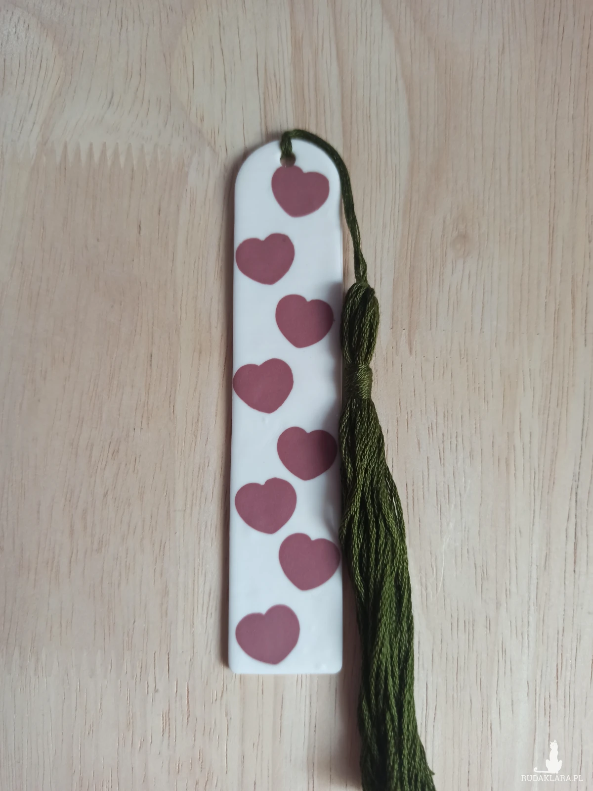 Zakładka do książki wykonana z wysokiej jakości gliny polimerowej w kolorze białym z serduszkami w kolorze brudnego różu.