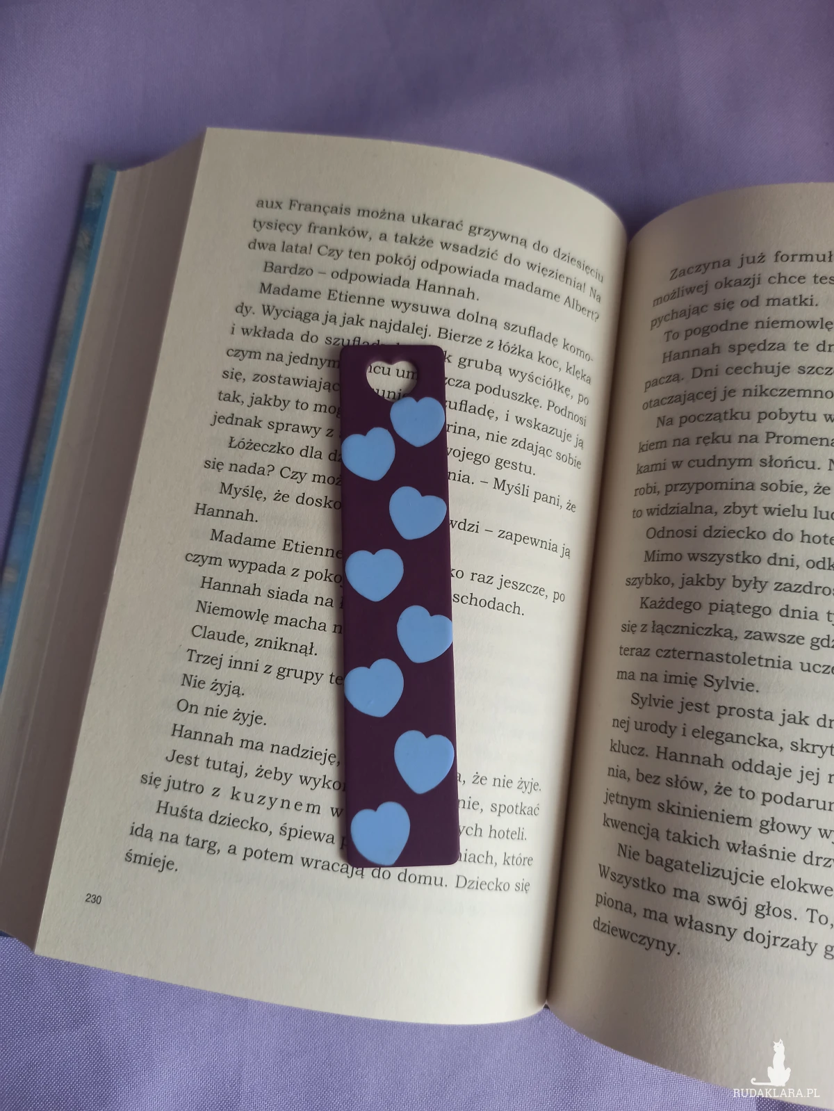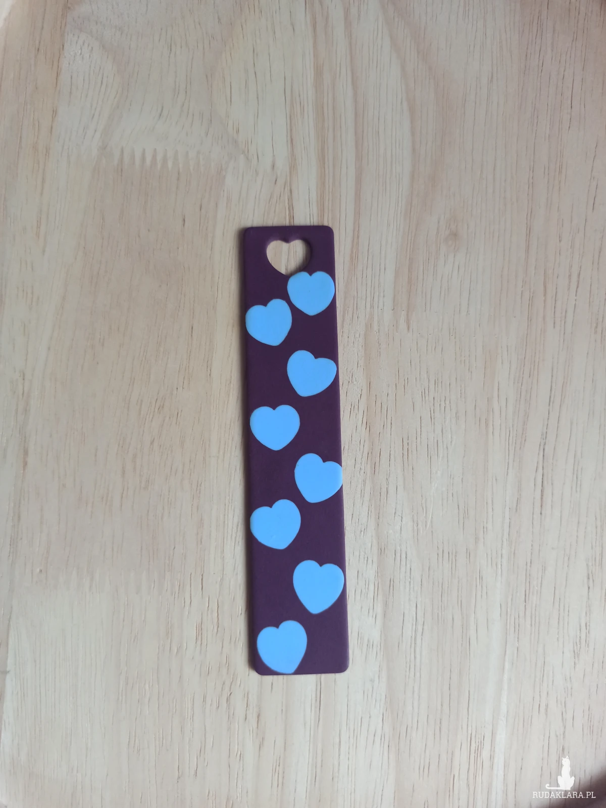 Zakładka do książki wykonana z wysokiej jakości gliny polimerowej w kolorze ciemnego fioletu z serduszkami w kolorze błękitnym.