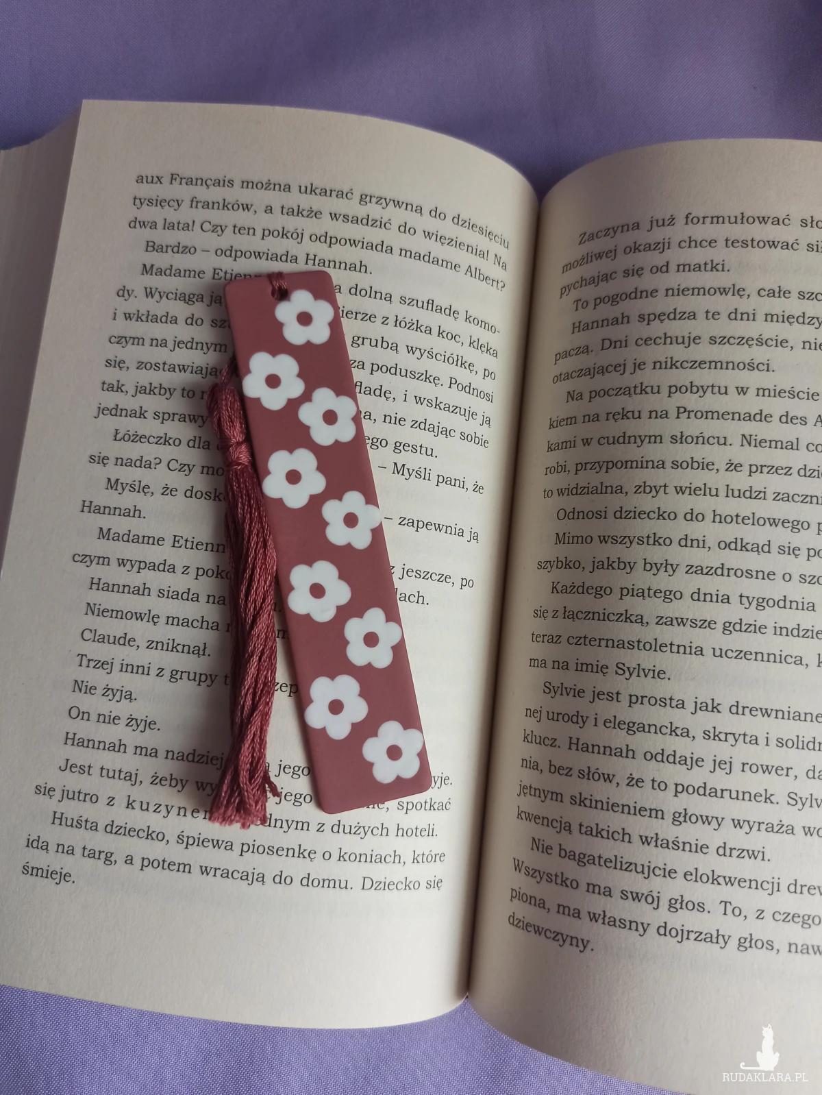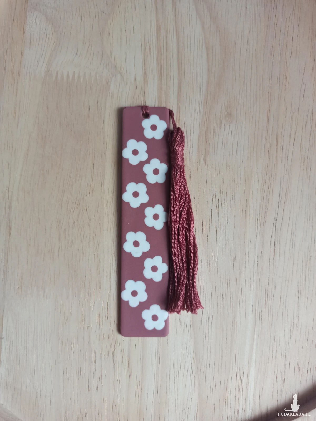 Zakładka do książki wykonana z wysokiej jakości gliny polimerowej w kolorze brudnego różu z kwiatkami w kolorze białym.