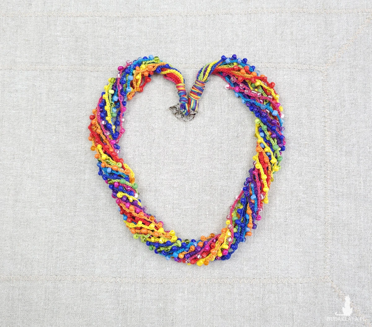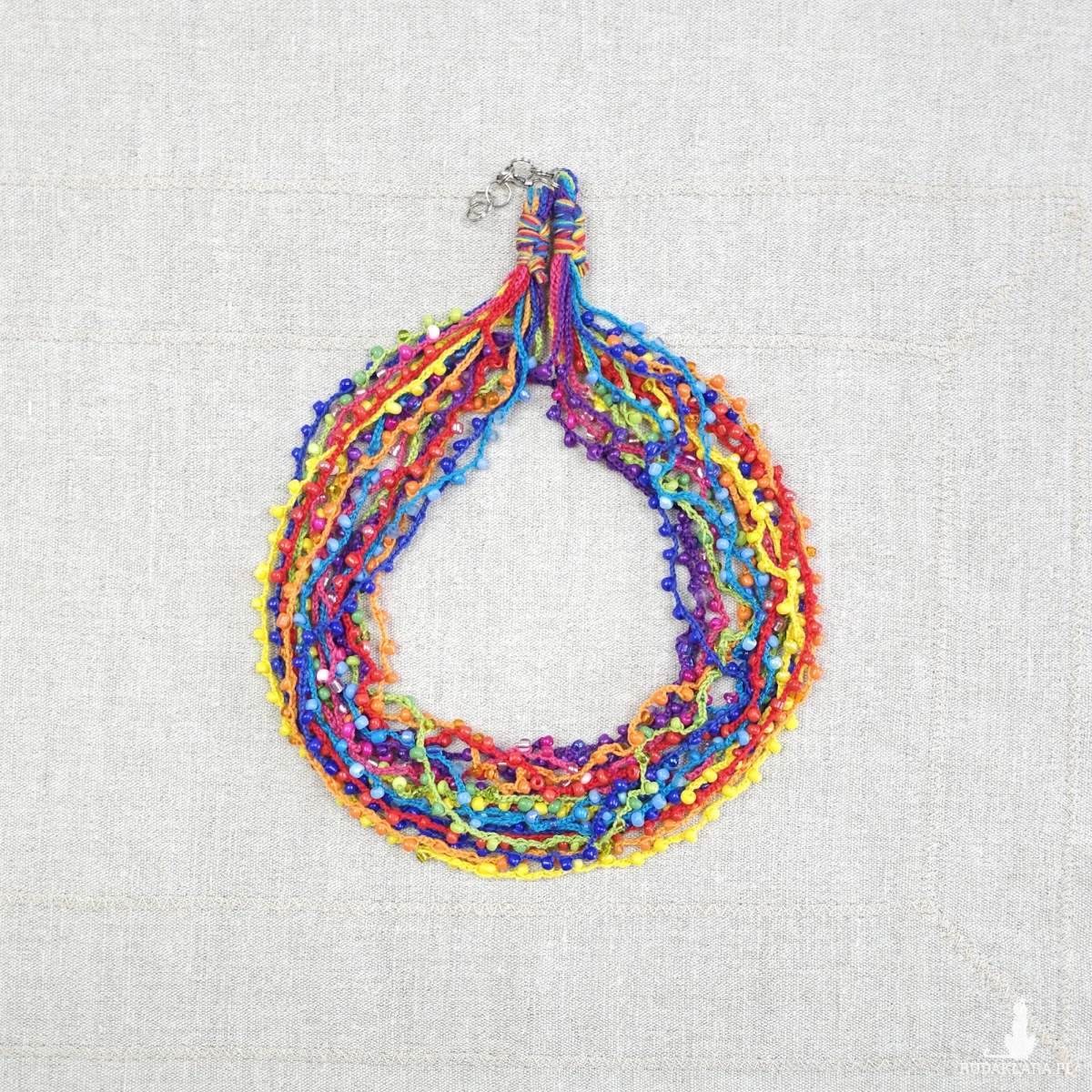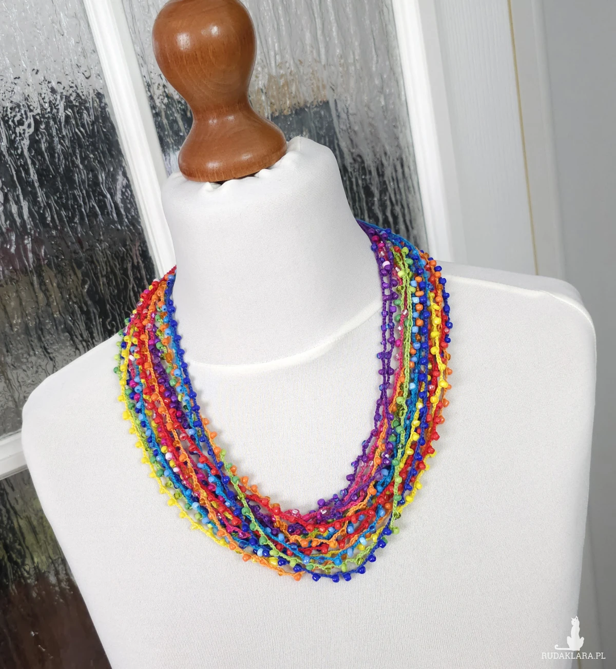 Wielobarwny naszyjnik wykonany ręcznie techniką szydełkową. Składa się z wielu cienkich sznurków z subtelnie wplecionymi szklanymi koralikami. Można go nosić luźno (warstwowo) lub zapleść w gruby, efektowny sznur.