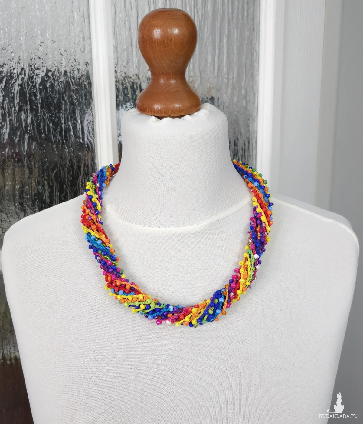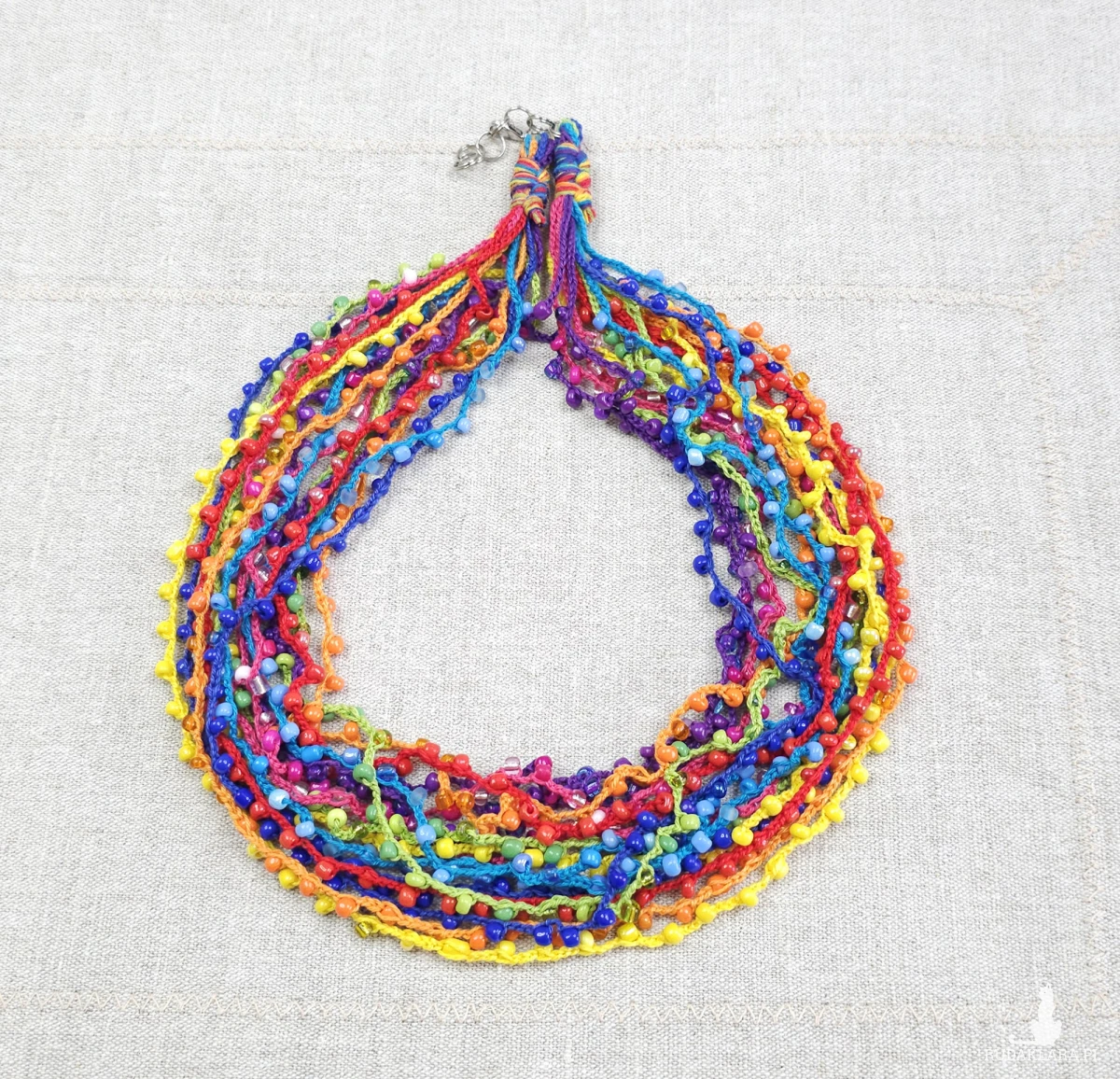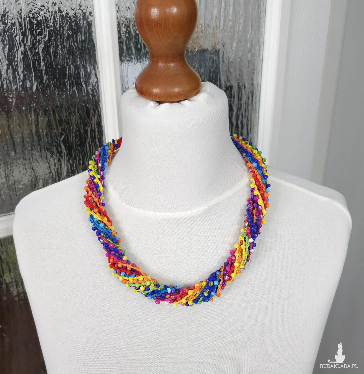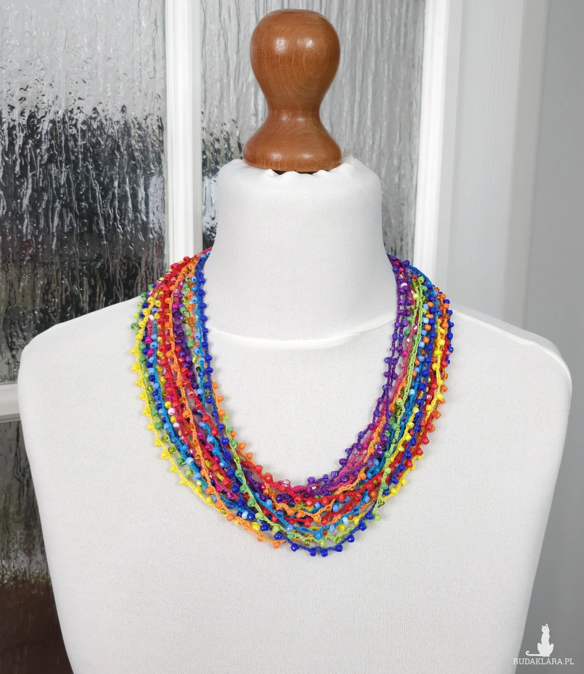 Wielobarwny naszyjnik wykonany ręcznie techniką szydełkową. Składa się z wielu cienkich sznurków z subtelnie wplecionymi szklanymi koralikami. Można go nosić luźno (warstwowo) lub zapleść w gruby, efektowny sznur.