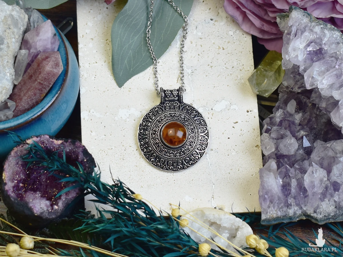 Wisiorek z bursztynem, wykonany z miedzi, która została posrebrzona tradycyjnymi technikami jubilerskimi. Bursztyn, z jego ciepłymi, złocistymi odcieniami, doskonale komponuje się z elegancką oprawą, tworząc harmonijną całość. Kamień ten od wieków uchodzi za symbol zdrowia, ochrony oraz energii. Biżuteria nie tylko ozdabia, ale i dodaje pewności siebie, będąc doskonałym wyborem na wyjątkowe okazje.