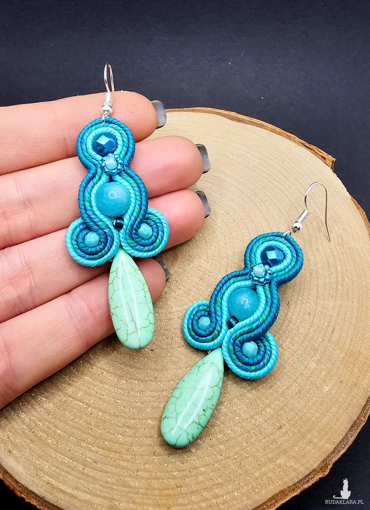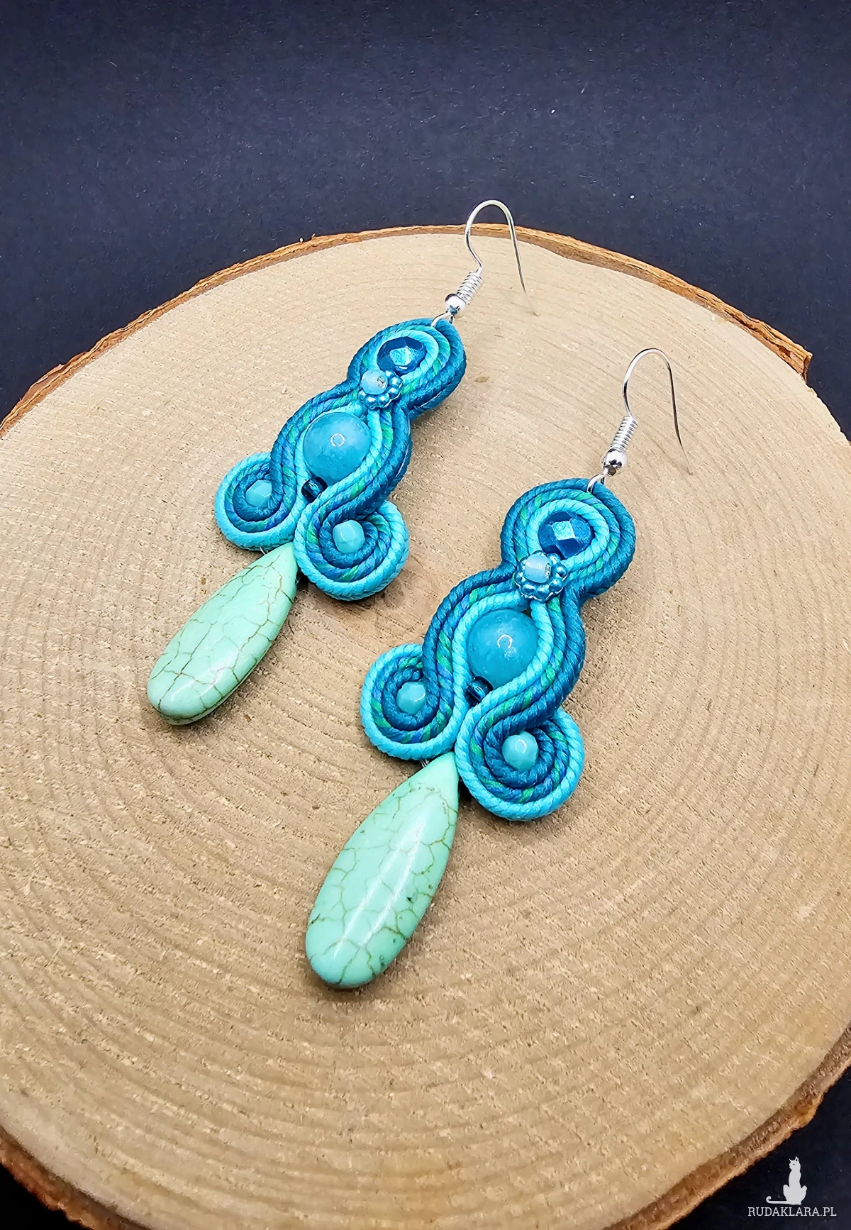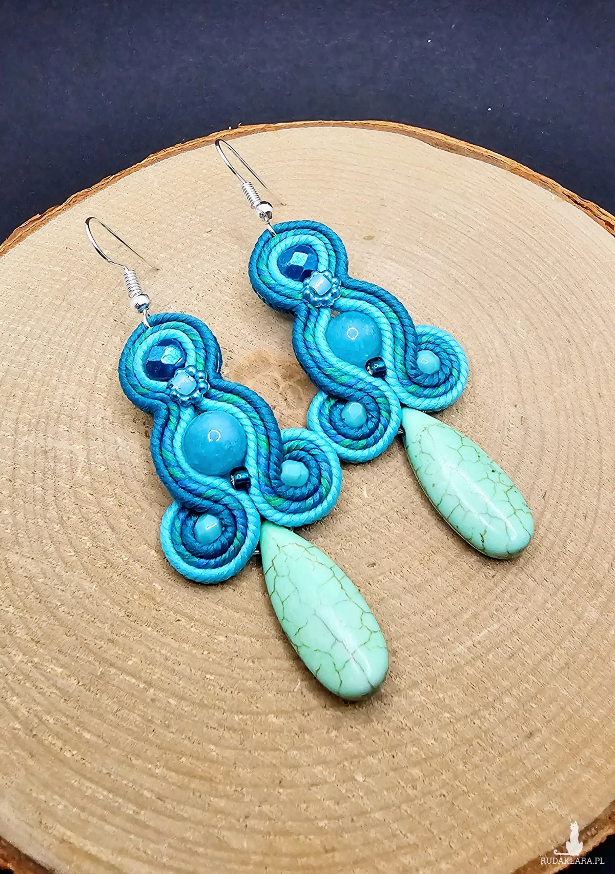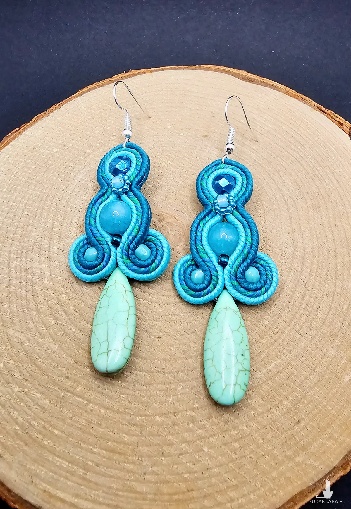 Turkusowe kulki jadeitu otoczone polskimi sznurkami sutasz oraz szklanymi czeskimi i japońskimi koralikami o rożnych kształtach i wielkościach. Dół kolczyków zdobi howlit w kształcie łezki. Kolory w kolczykach: turkusowy, niebieski, zielony. Kolczyki zawieszone na klasycznych otwartych biglach w kolorze srebrnym.