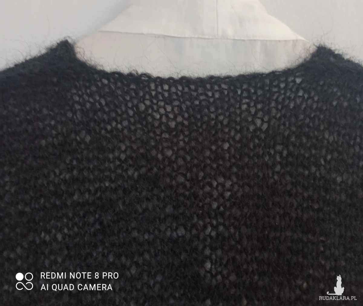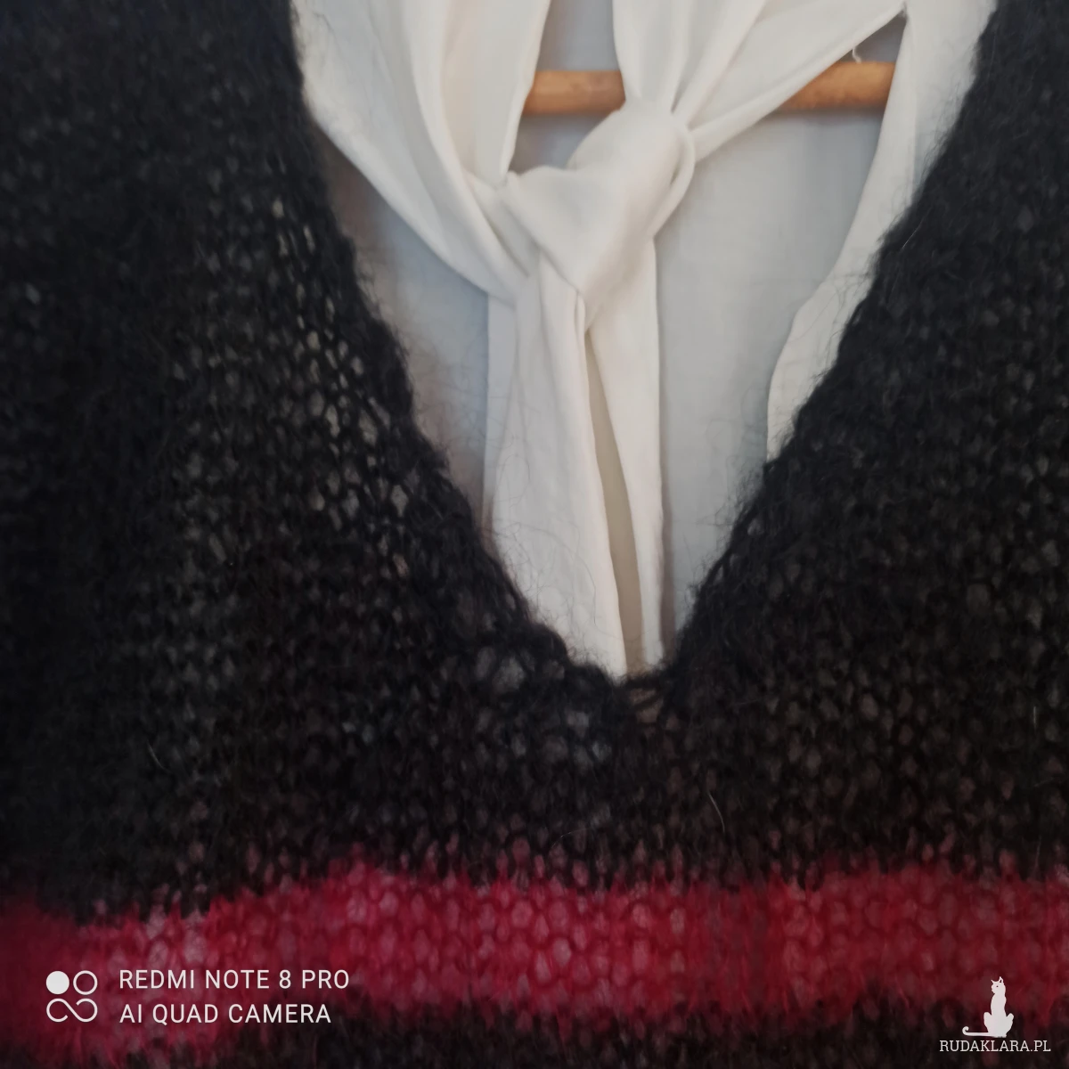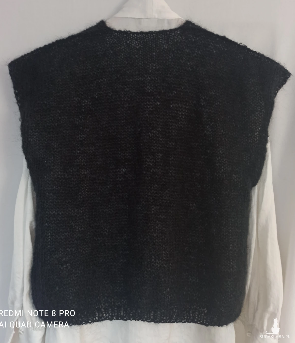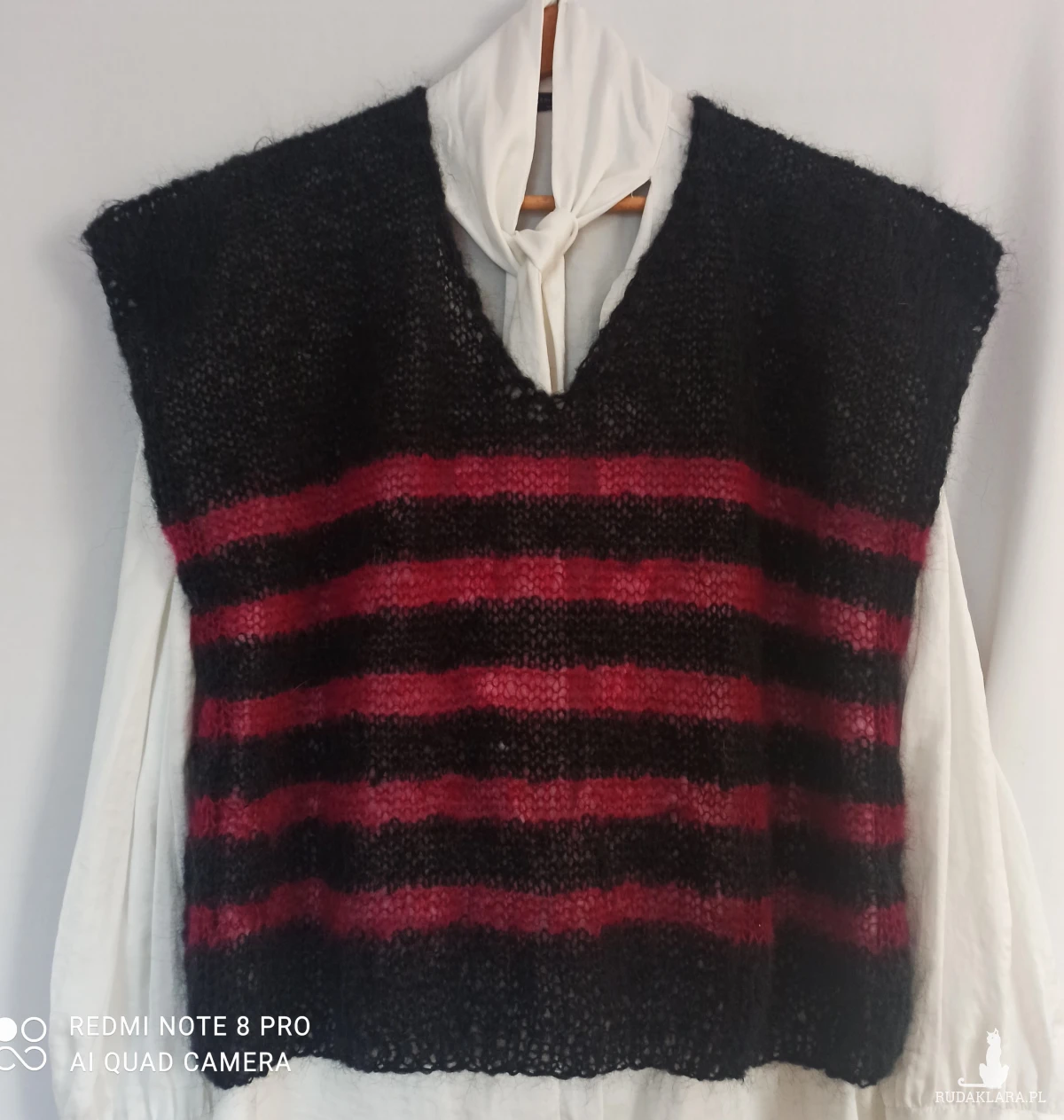 Moherowy w serek pulower, bezrękawnik czarny /jak sadza/w buraczkowe paski na przodzie. Paski w kolorze buraczkowym. Wykonany wzorem pończoszniczym czyli same oczka prawe na prawej stronie. Pliską jest efektowne wykończenie w trakcie roboty stosując specjalne przeciąganie nici, powoduje efekt lekkości. Ściągacz u dołu oczko lewe, oczko prawe. Ramiona szerokie lekko opadające. W całości bardzo elegancko wygląda, można nosić także bez spodu samodzielnie. Jest bardzo leciutki, przemiły w dotyku. Nić 100% moher cieniutki.