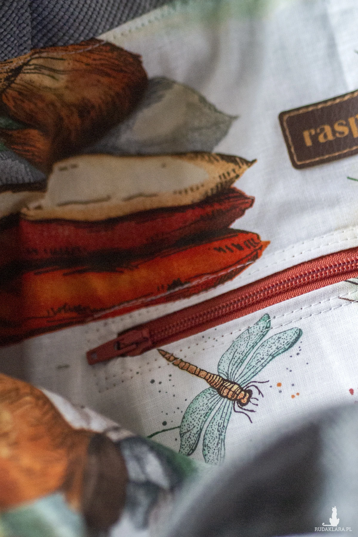 Torebka posiada bawełnianą podszewkę w kapibary, a w środku kieszeń zapinaną na suwak. Z tyłu torby znajduje się dodatkowa kieszonka zapinana na suwak.