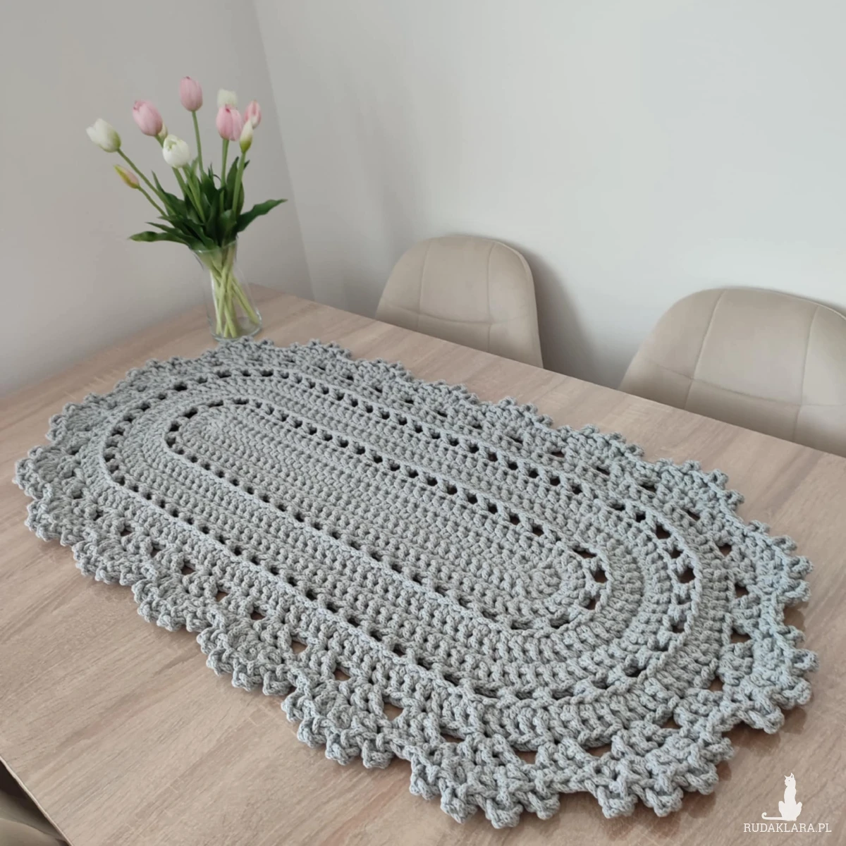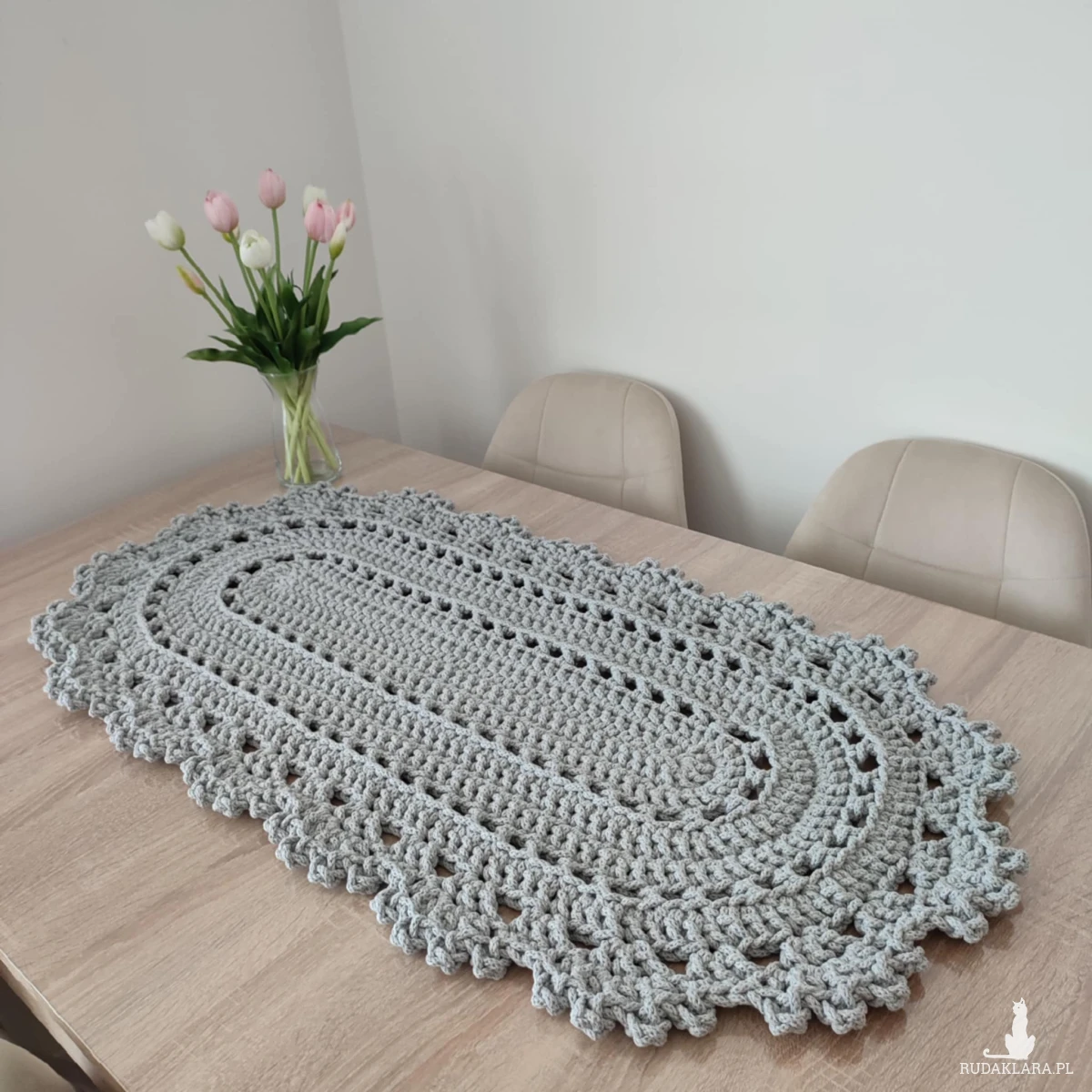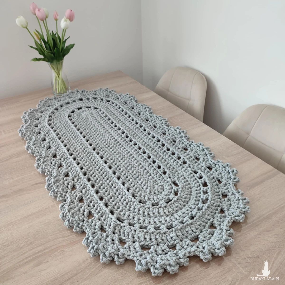 Bieżnik o wymiarach 50cmx100cm, wykonany metodą szydełkowania z polskiego sznurka bawełnianego 5mm.