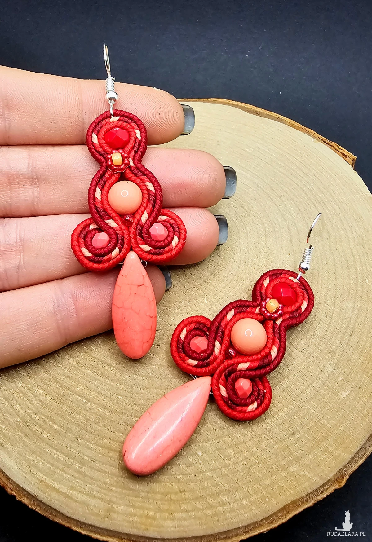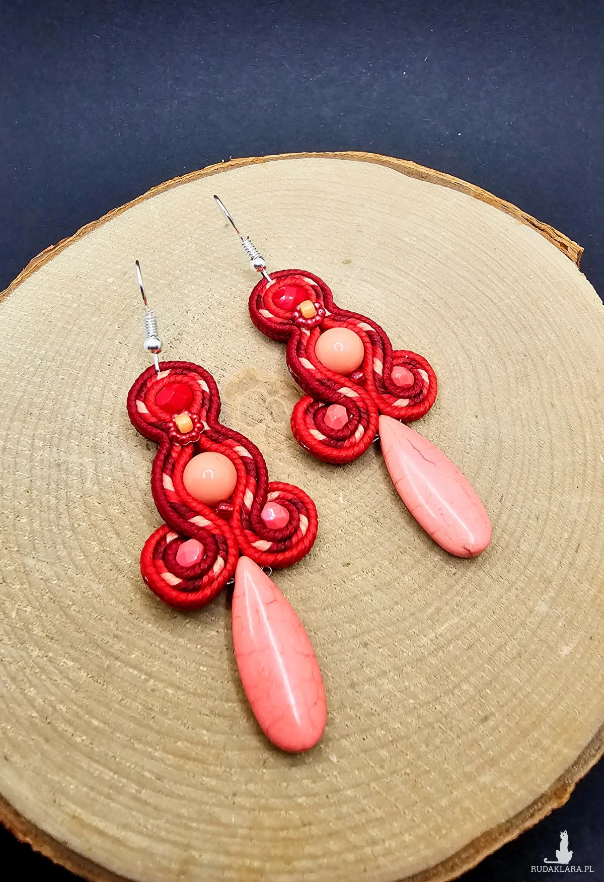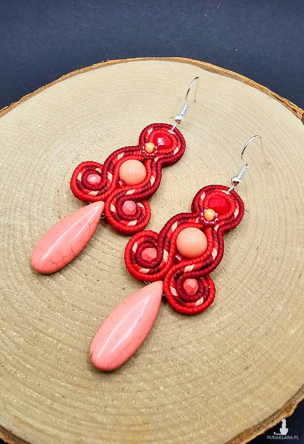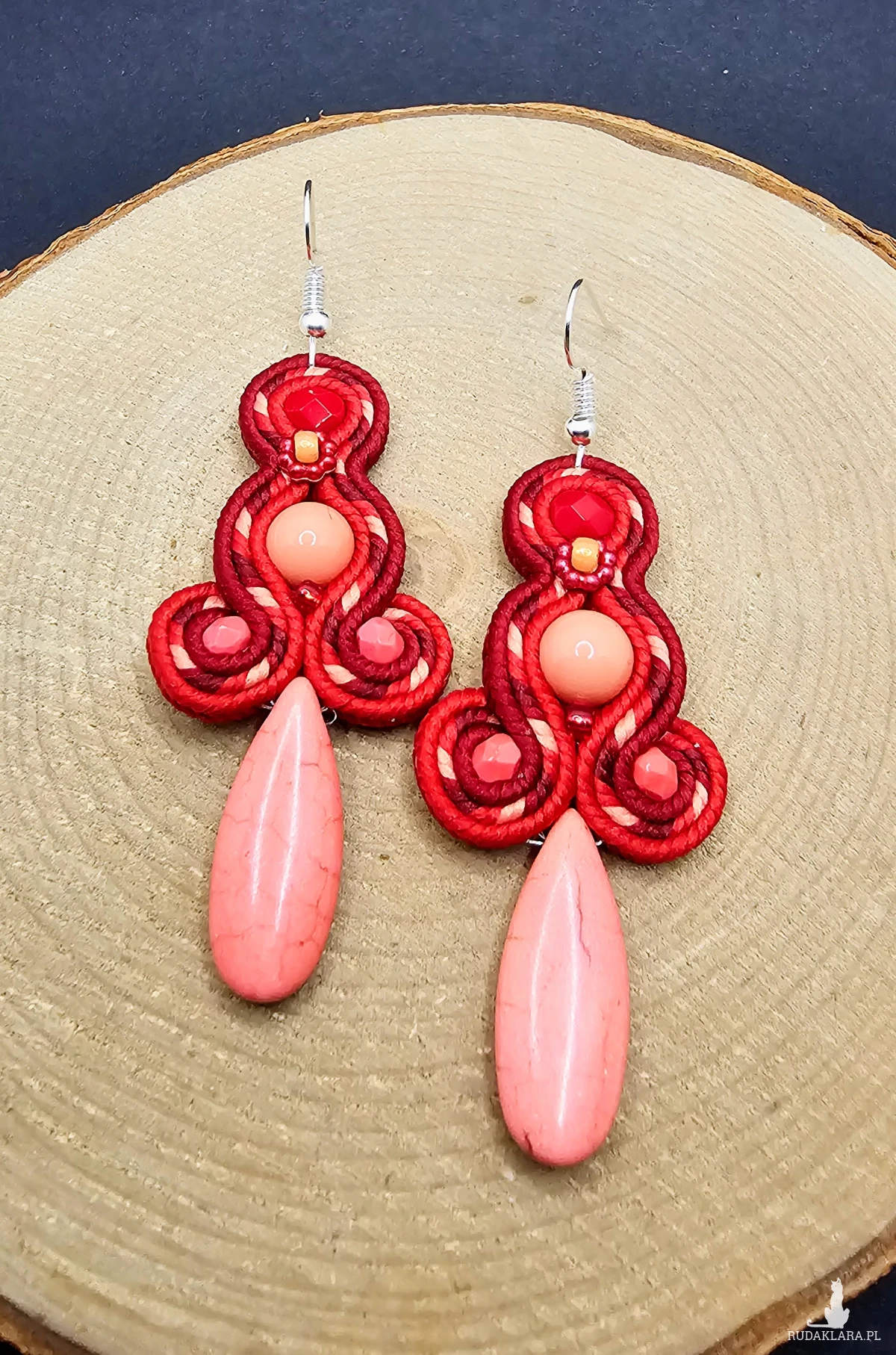 Koralowe szklane perły otoczone polskimi sznurkami sutasz oraz szklanymi czeskimi i japońskimi koralikami o rożnych kształtach i wielkościach. Dół kolczyków zdobi howlit w kształcie łezki. Kolory w kolczykach: koralowy, czerwony, bordowy. Kolczyki zawieszone na klasycznych otwartych biglach w kolorze srebrnym.
