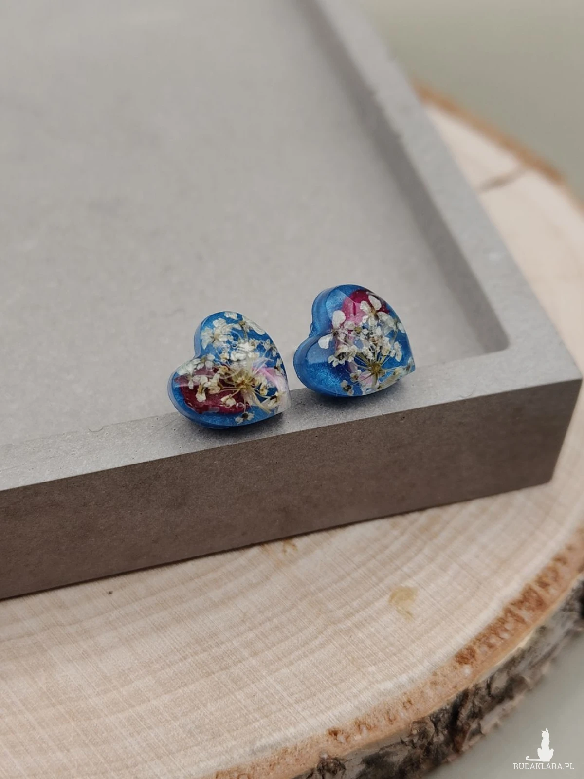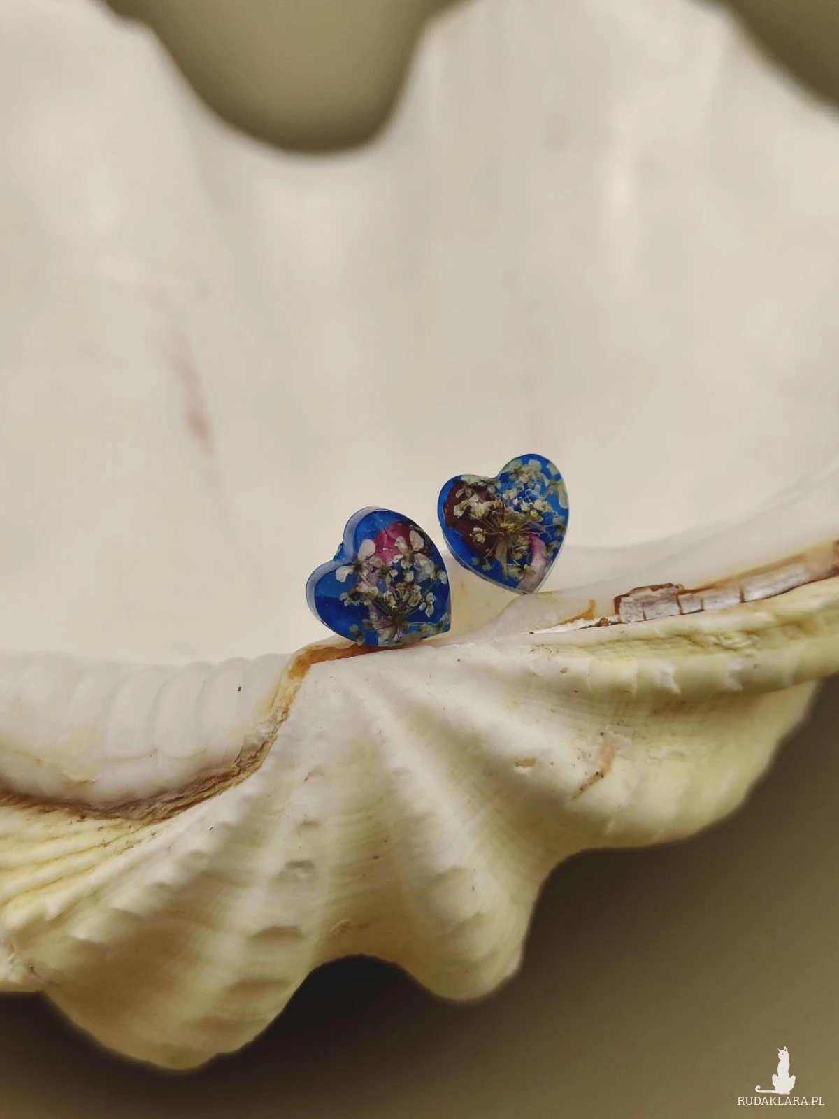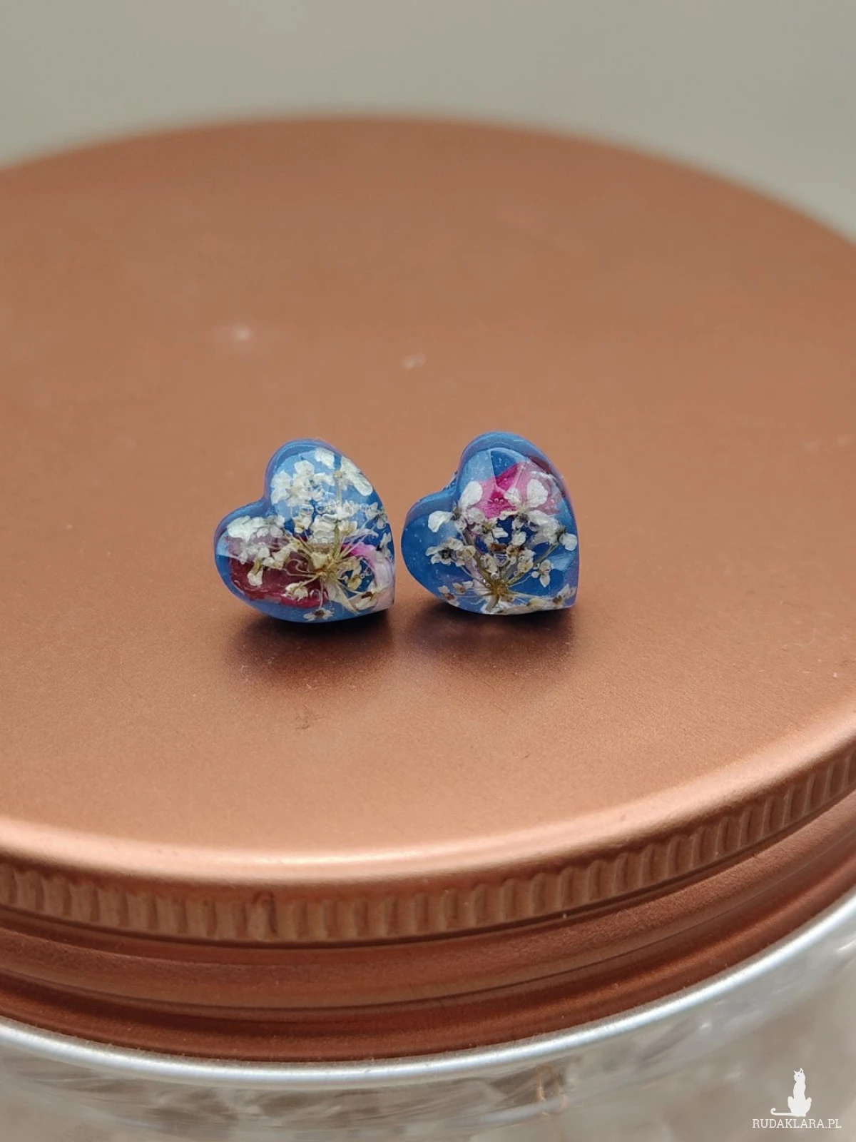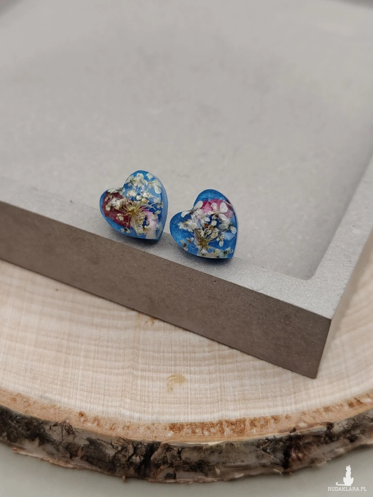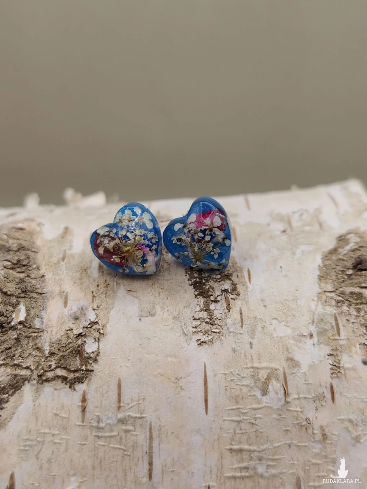 Romantyczne kolczyki w kształcie serc, wykonane z przejrzystej żywicy, w której zatopiono delikatne, prawdziwe kwiaty. Ich subtelna kompozycja w odcieniach błękitu, bieli i różu przywodzi na myśl letnią łąkę skąpaną w słońcu. To wyjątkowa biżuteria, która łączy naturalne piękno z rękodzielniczą precyzją — idealna dla osób ceniących oryginalność i lekkość stylu. Doskonale sprawdzą się zarówno na co dzień, jak i jako romantyczny akcent do eleganckich stylizacji.