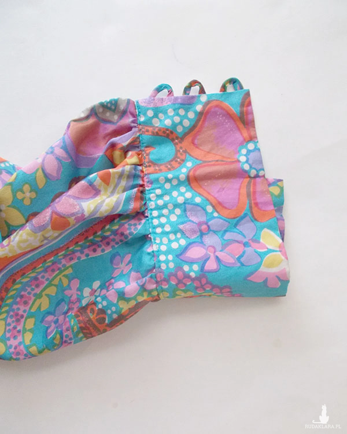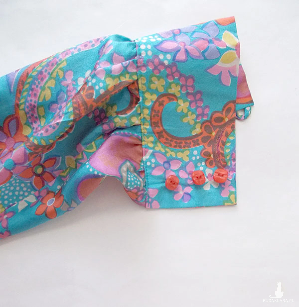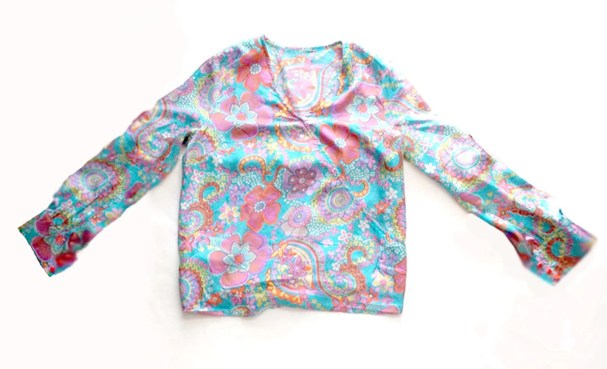 Ubranie jest lekkie i przewiewne. Z tyłu gumka u dołu, przód dekolt na zakładkę. Wkładana przez głowę. Mankiety na 3 guziczki.