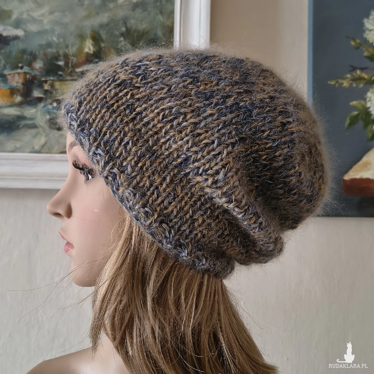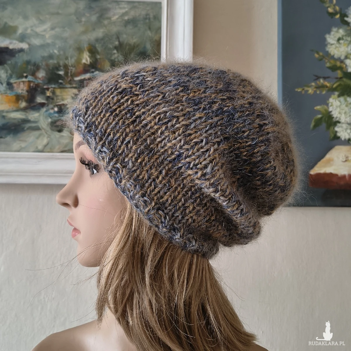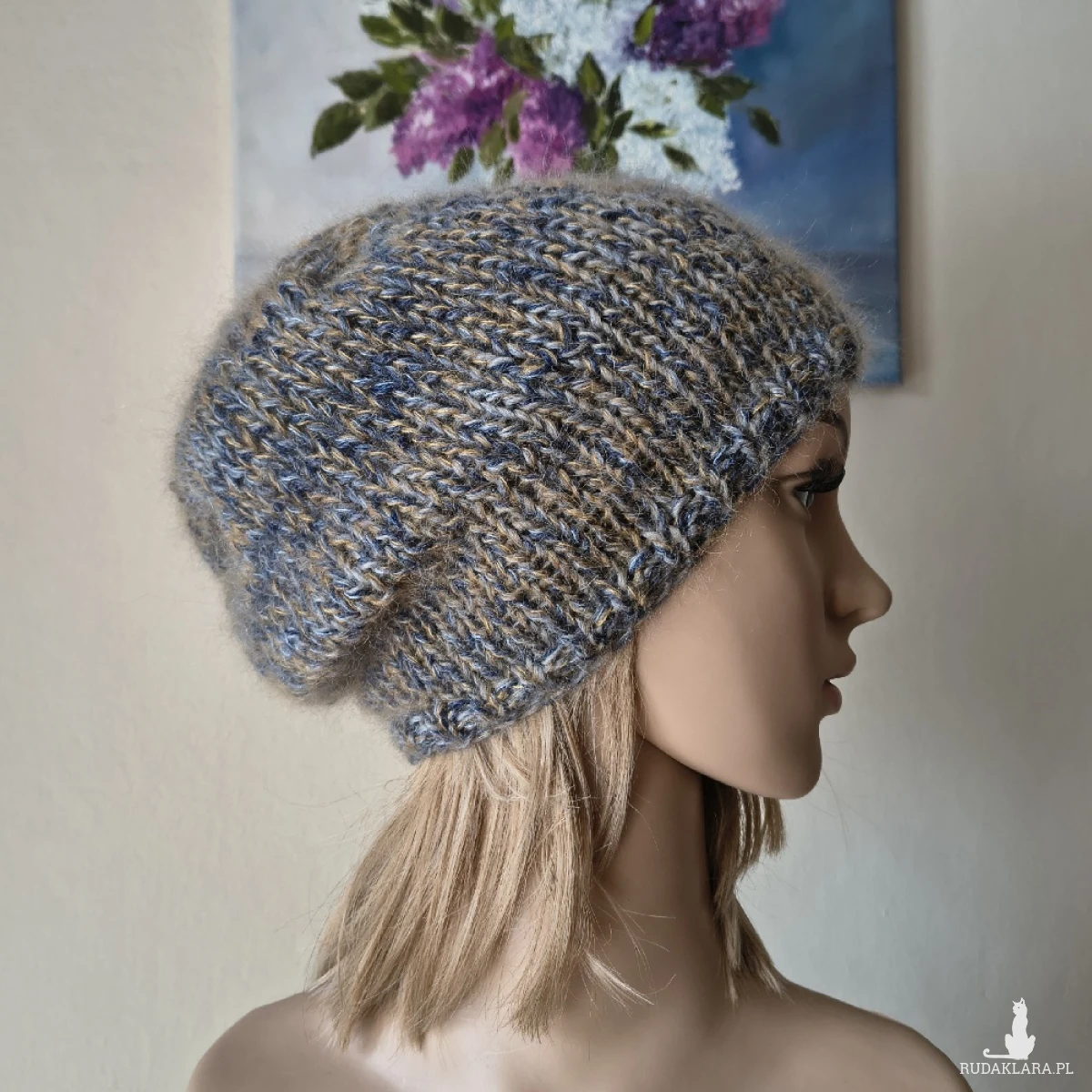 Miła, bezszwowa czapka, wykonana ręcznie na drutach poczwórną nitką z indywidualnie dobranych włóczek najwyższej jakości, o składzie: dwie z nich, to najdelikatniejsze, cieńsze od włosa australijskie włóczki moherowo-jedwabne (70% moher, 30% jedwab), trzecia to hiszpańska szlachetna włóczka, o składzie: 30% alpaka, 25% jedwab, 25% virgin wool i 20% akryl), czwarta to hiszpańska wełenka merino 100%. Czapka jest lekka, puchata i bardzo ciepła, a efekt kolorystyczny subtelny i niezwykle twarzowy. Niestety zdjęcia nie oddają miękkości i puszystości włóczek. Polecam dla obwodów głowy 55-58 cm. Dł. czapki - 26 cm. Brak klasycznego ściągacza nie grozi rozciągnięciem czapki Pranie - jak w przypadku wszystkich moich wyrobów - wyłącznie ręczne.
