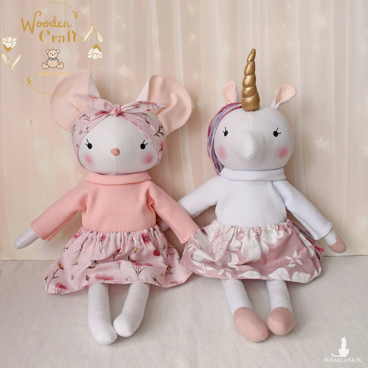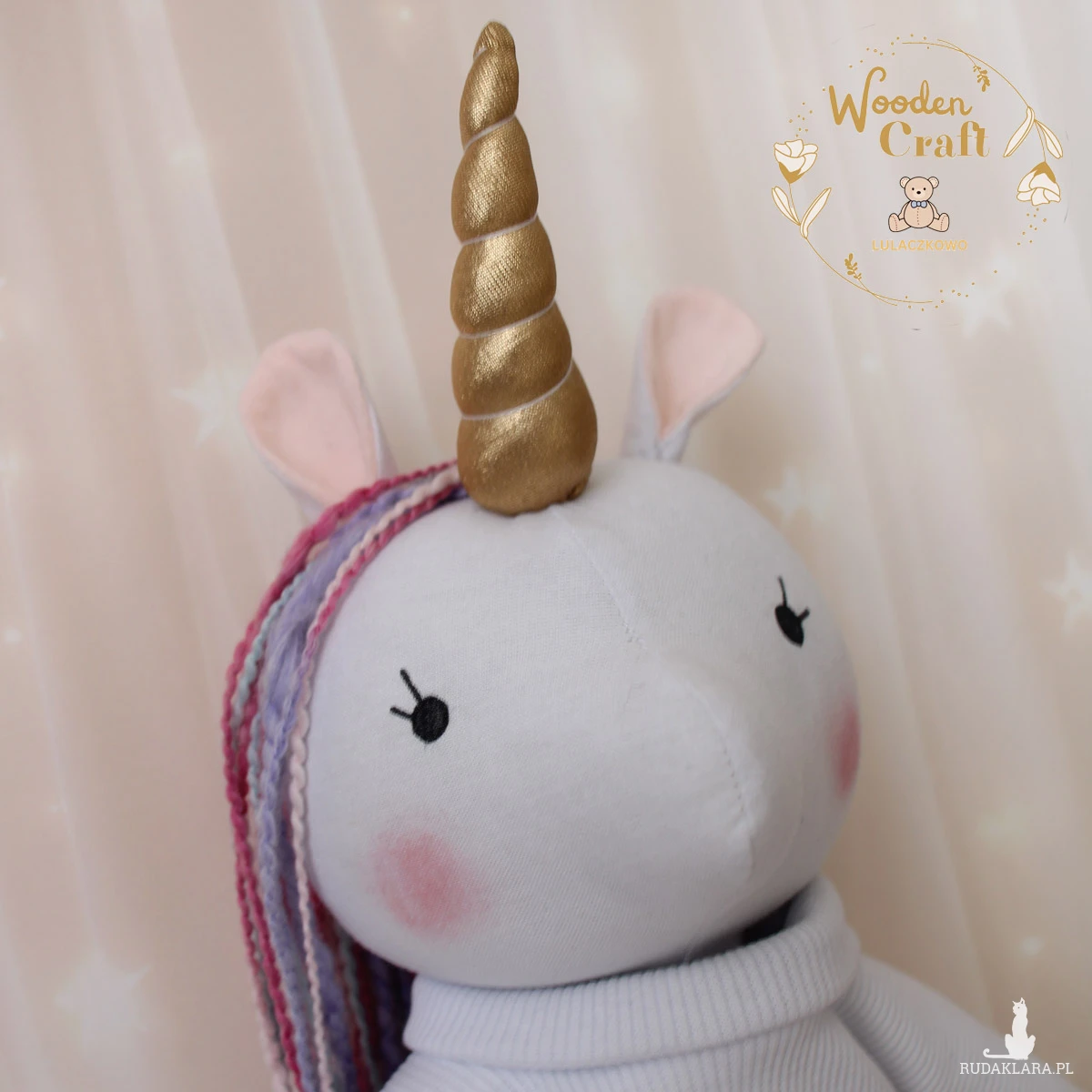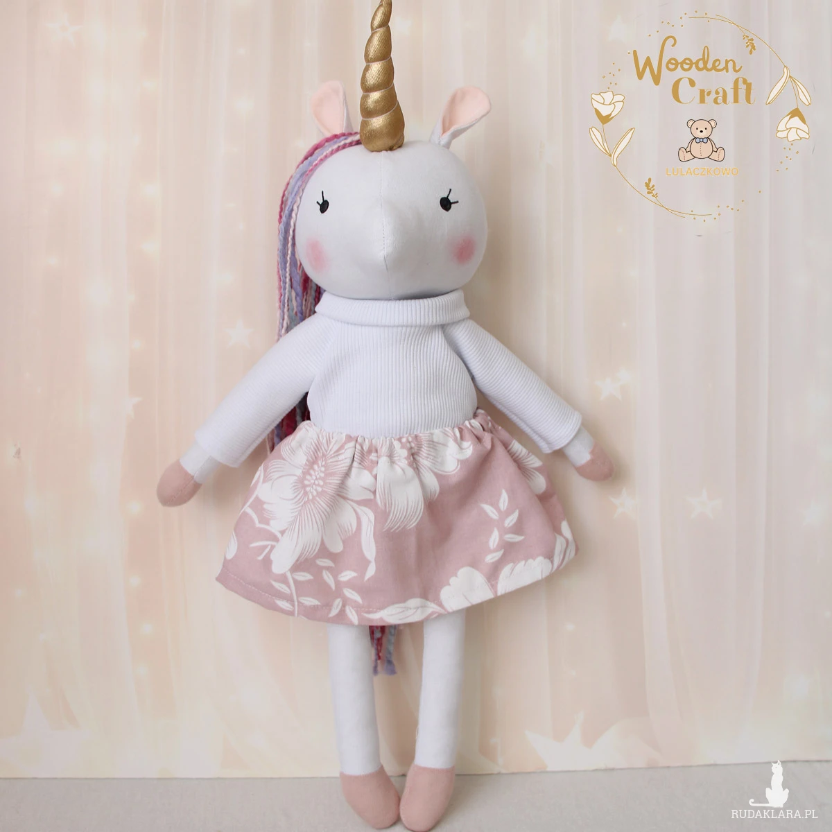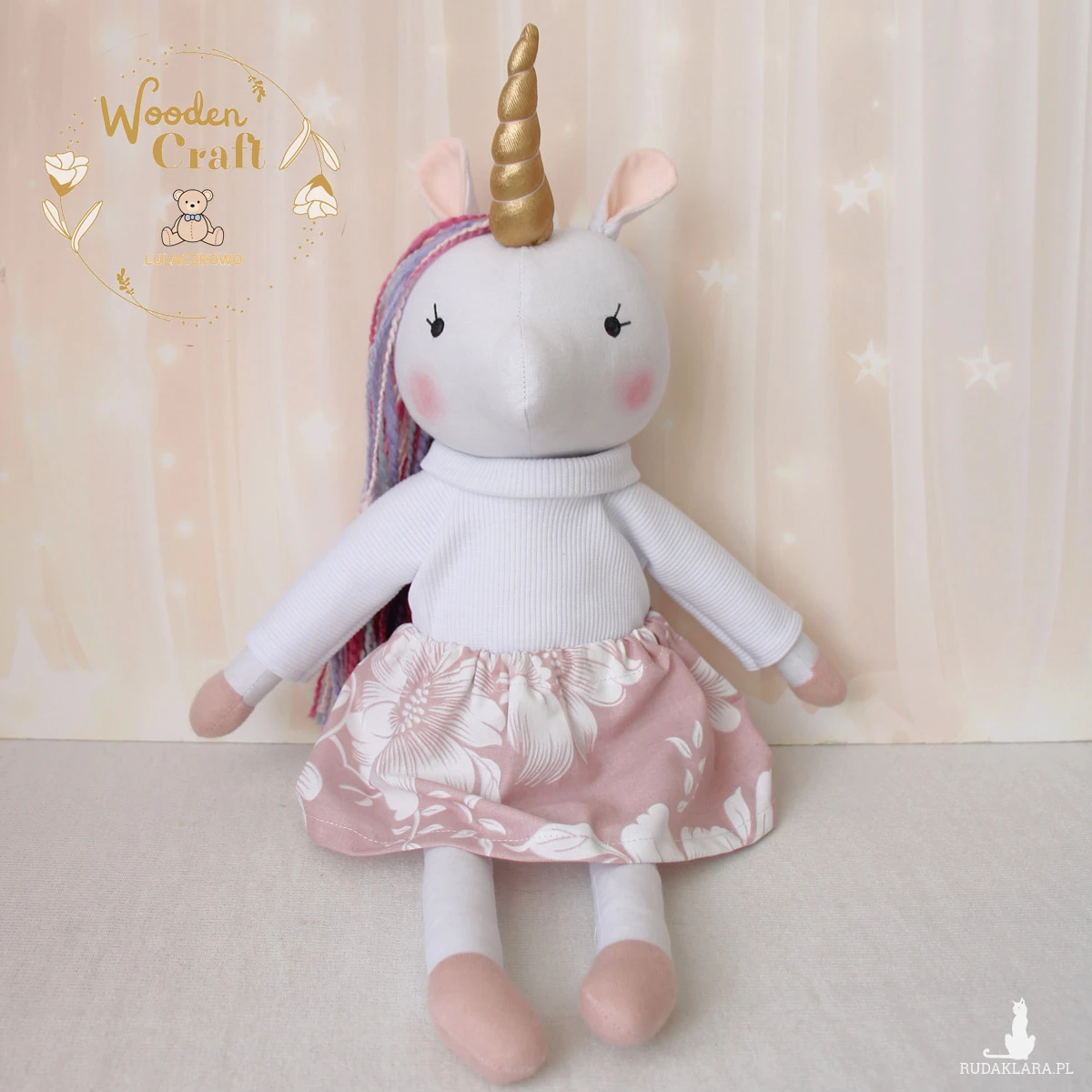 Przeurocza przytulanka, jednorożec, uszyty ręcznie z najwyższą starannością, ubrany w biały sweterek i różową spódniczkę. Wykonany ze 100% bawełny, wypełniony antyalergiczną kulką silikonową. Oczka malowane wodoodpornym markerem, włosy z cieniowanej włóczki, róg uszyty w miękkiej połyskującej tkaniny. Spódniczkę, sweterek i opaskę można swobodnie zdejmować, posiadają gumeczki. Górne i dolne łapki układają się luźno, jednorożec siedzi z podparciem.