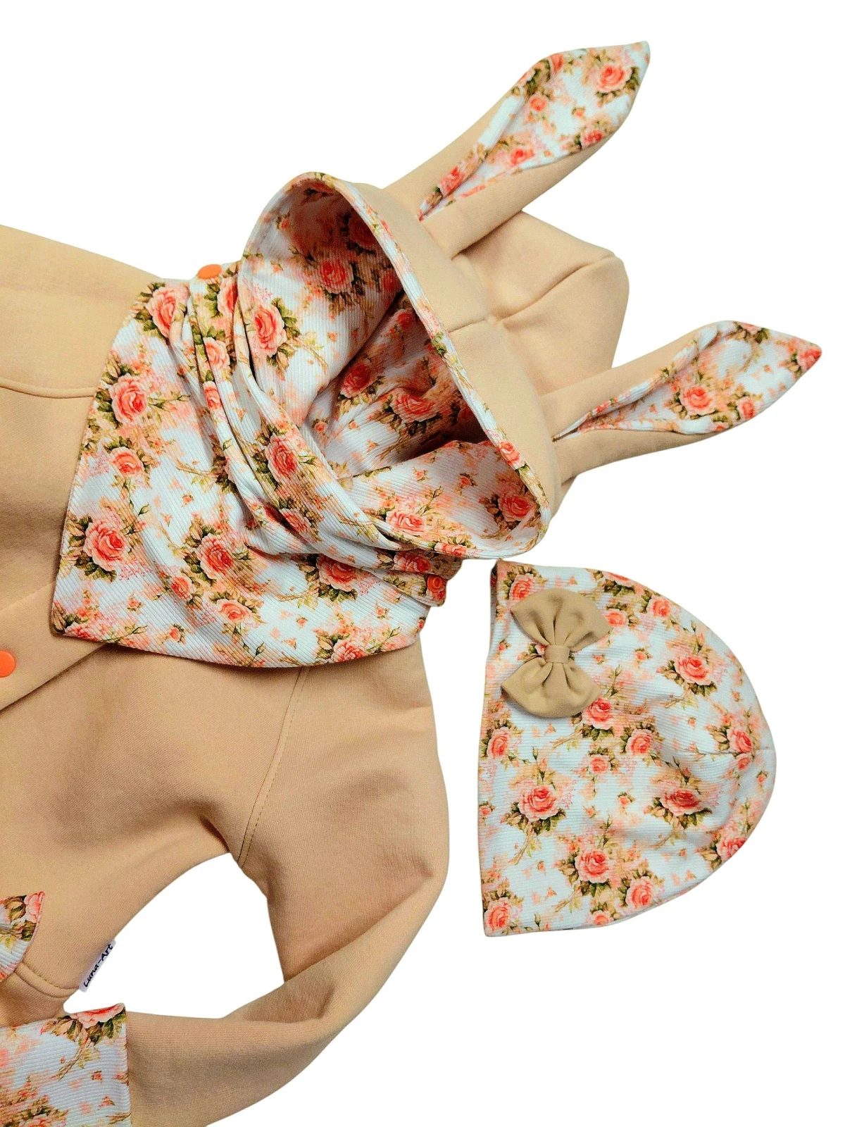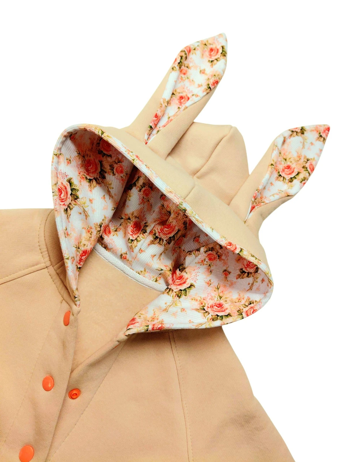 Płaszczyk uszyty z dresówki drapanej, z kapturem i uszami w kolorze beżowo-morelowym.