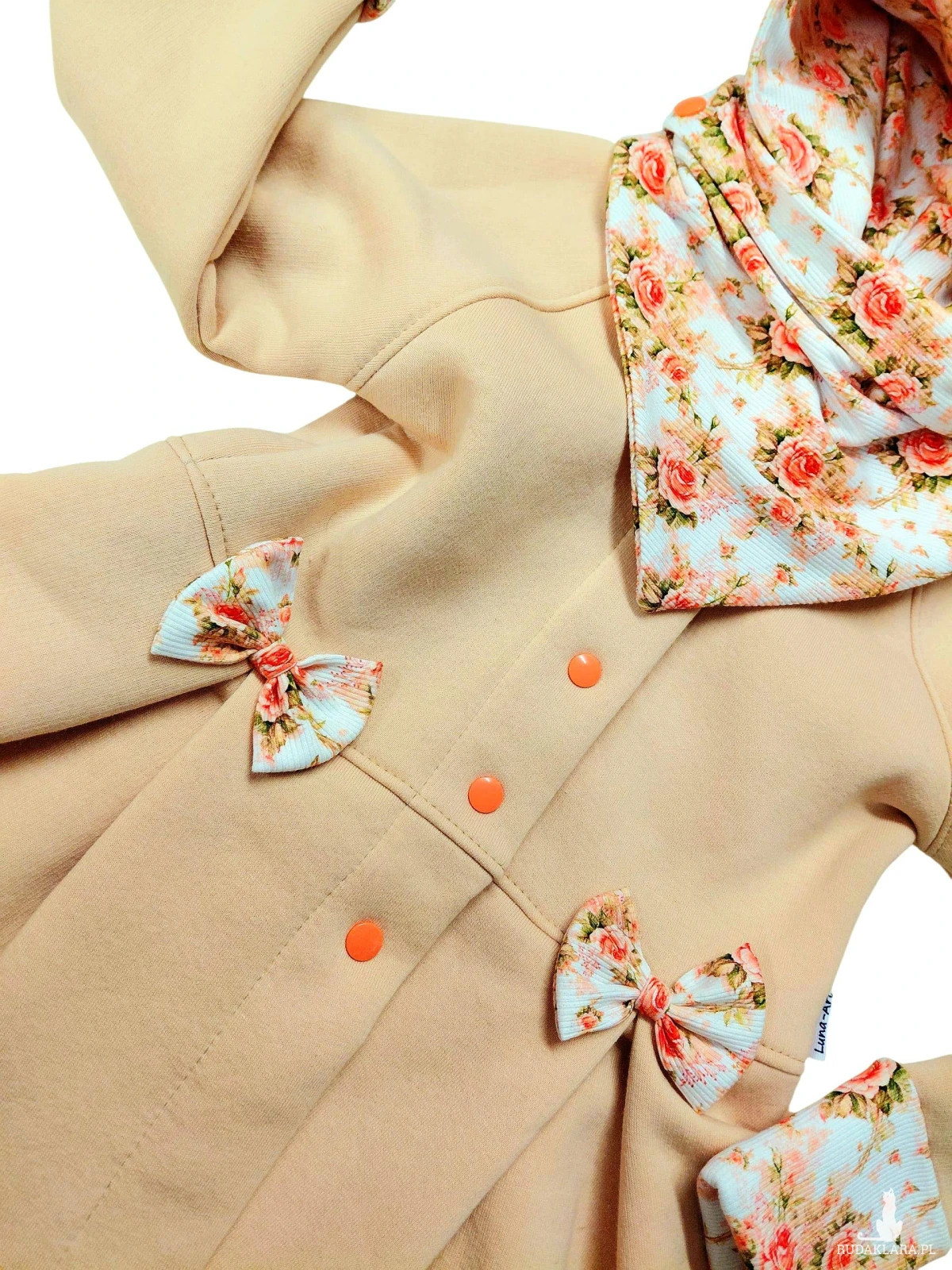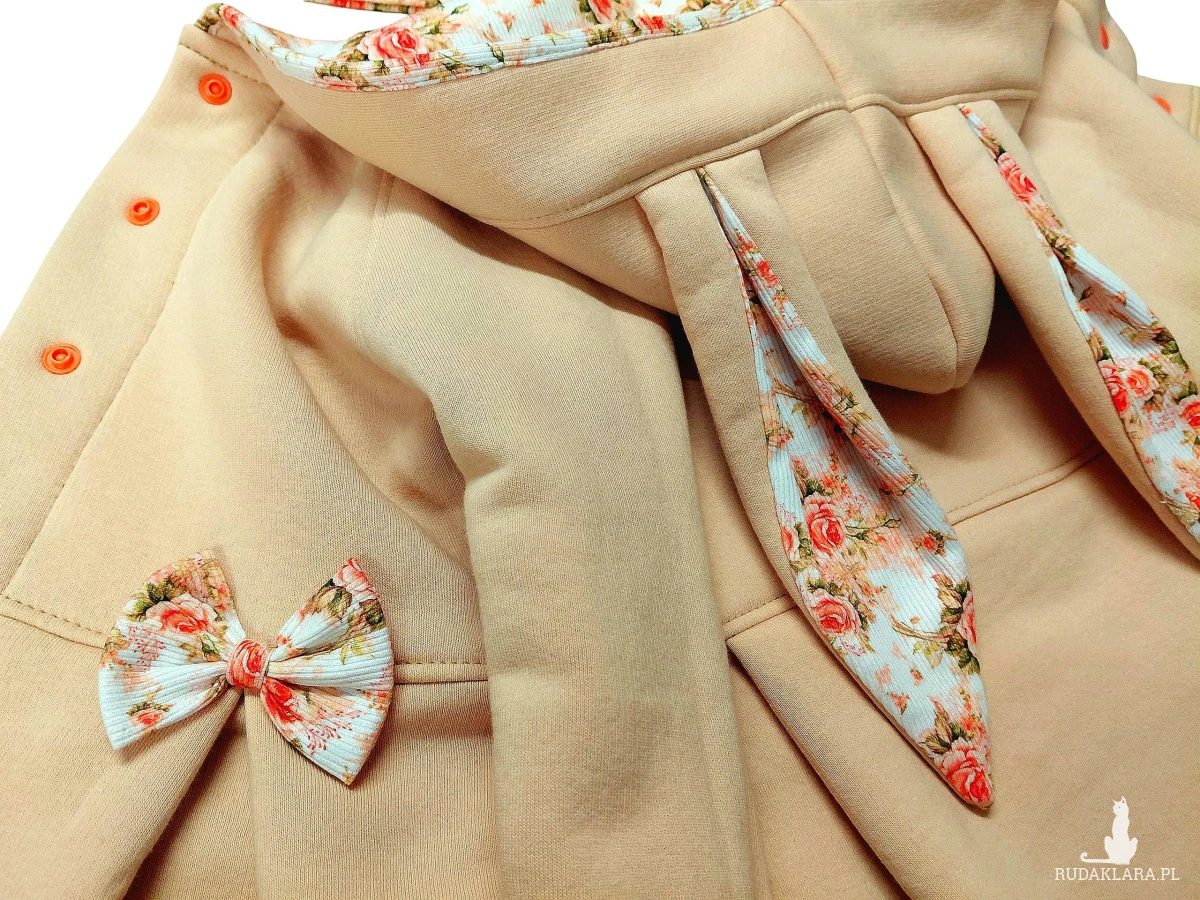 W kapturze, uszach, na końcówkach rękawów oraz ozdobne kokardki to dzianina prążkowana w kwiatki wzór cyfrowy.