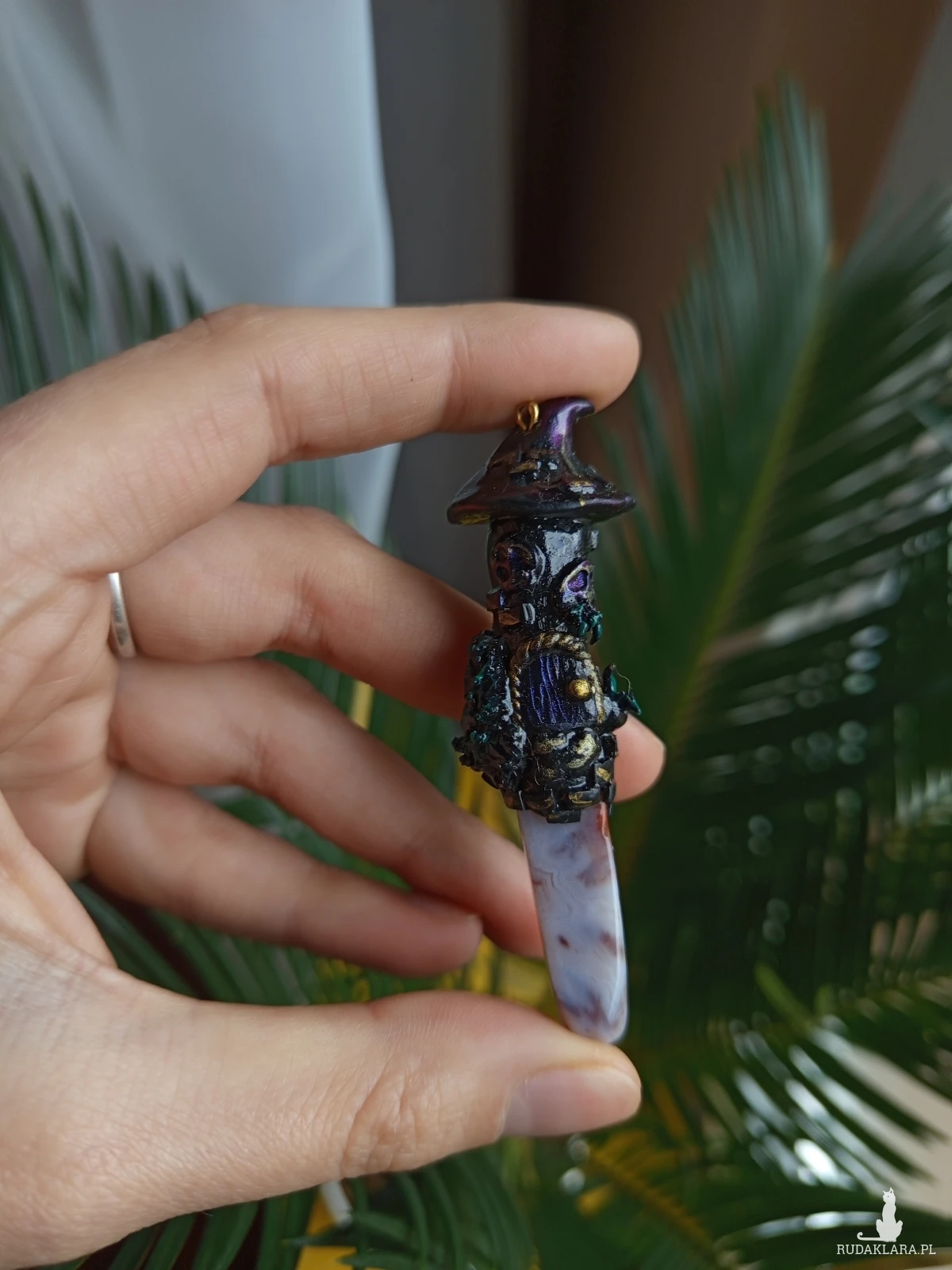 W centralnej części osadzony jest agat – kamień kojarzony z ochroną, równowagą i stabilnością, który dopełnia całość niczym serce zaklętej budowli. Połączenie surowej formy wieży z naturalnym minerałem tworzy wyjątkowy talizman inspirowany światem czarownic i dawnych legend.