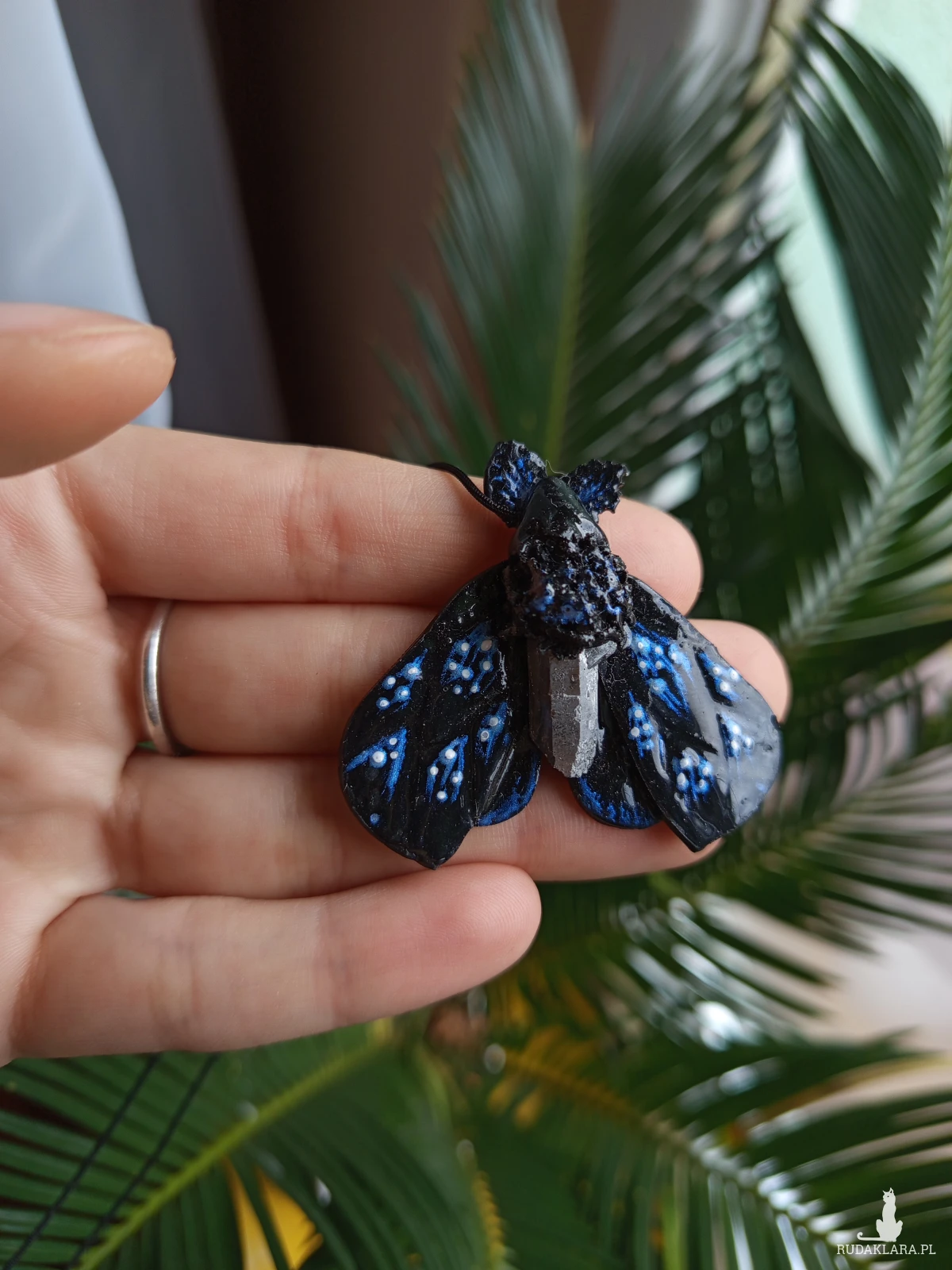 Ten tajemniczy naszyjnik z motywem ćmy zachwyca mroczną elegancją i magicznym blaskiem kamienia. Rzeźba została ręcznie wykonana z glinki polimerowej i utrzymana w głębokiej, czarnej kolorystyce, podkreślającej nocny, mistyczny charakter motywu.