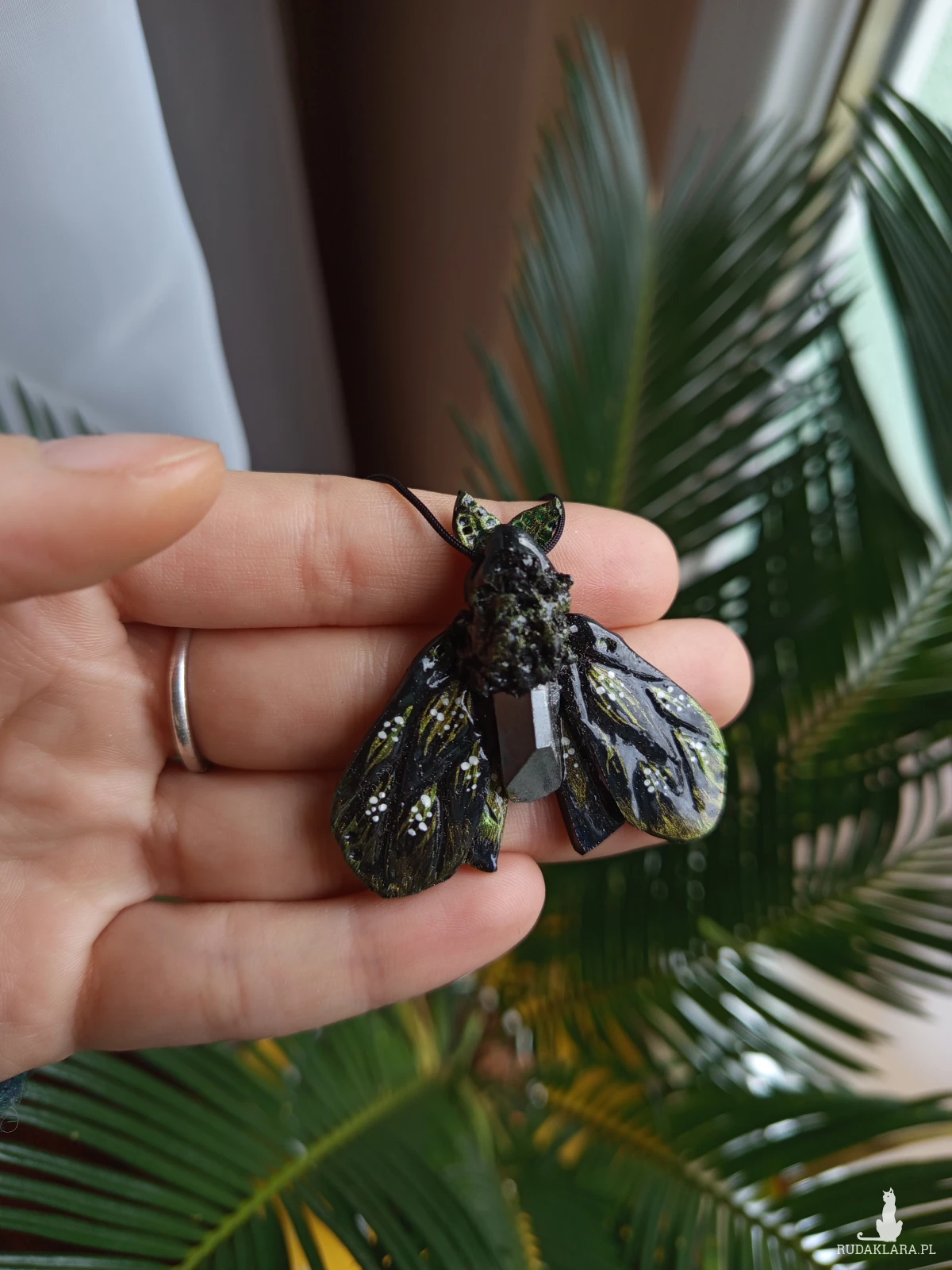 Ten tajemniczy naszyjnik z motywem ćmy zachwyca mroczną elegancją i magicznym blaskiem kamienia. Rzeźba została ręcznie wykonana z glinki polimerowej i utrzymana w głębokiej, czarnej kolorystyce, podkreślającej nocny, mistyczny charakter motywu.