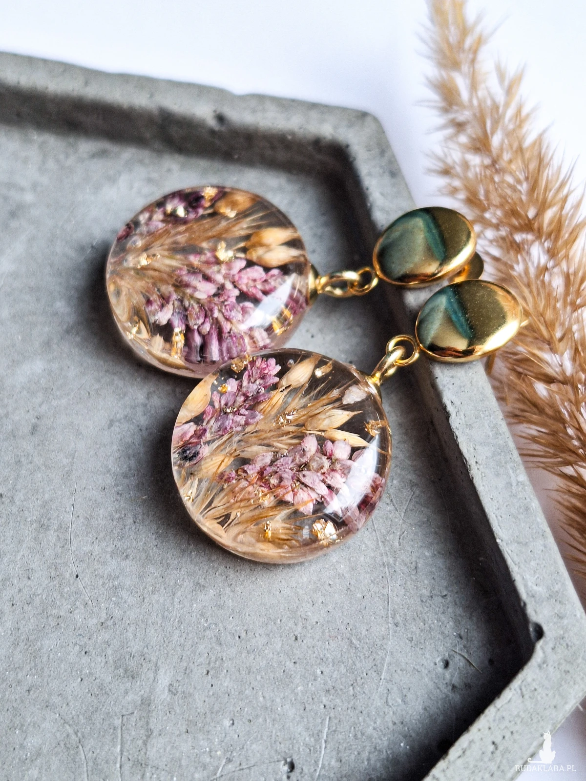 Urocze kolczyki z zatopionymi polnymi kwiatami i płatkami złota. Wykonane z wysokiej klasy żywicy, która nie zmienia koloru pod wpływem promieniowania UV oraz wysokiej jakości stali chirurgicznej.