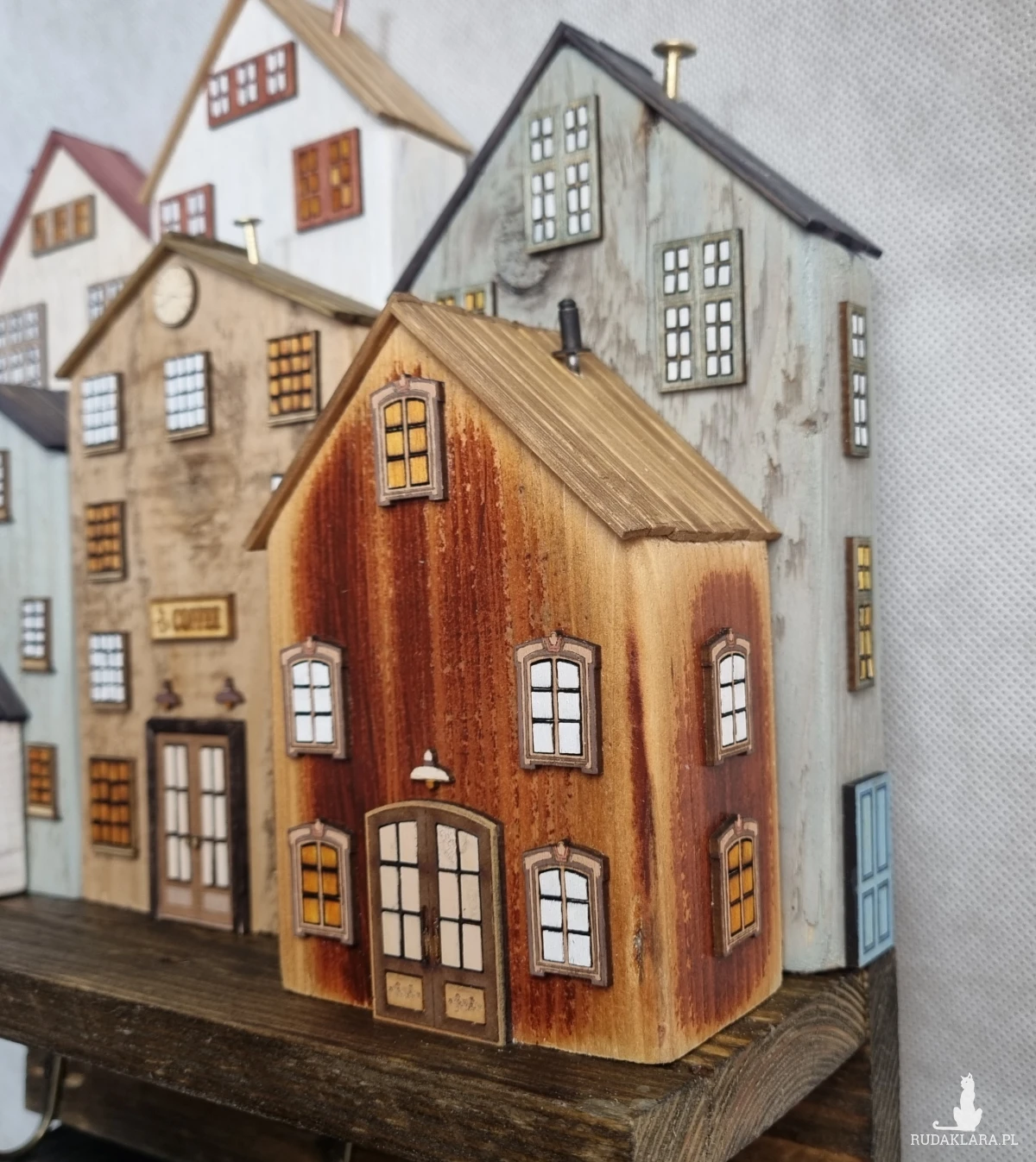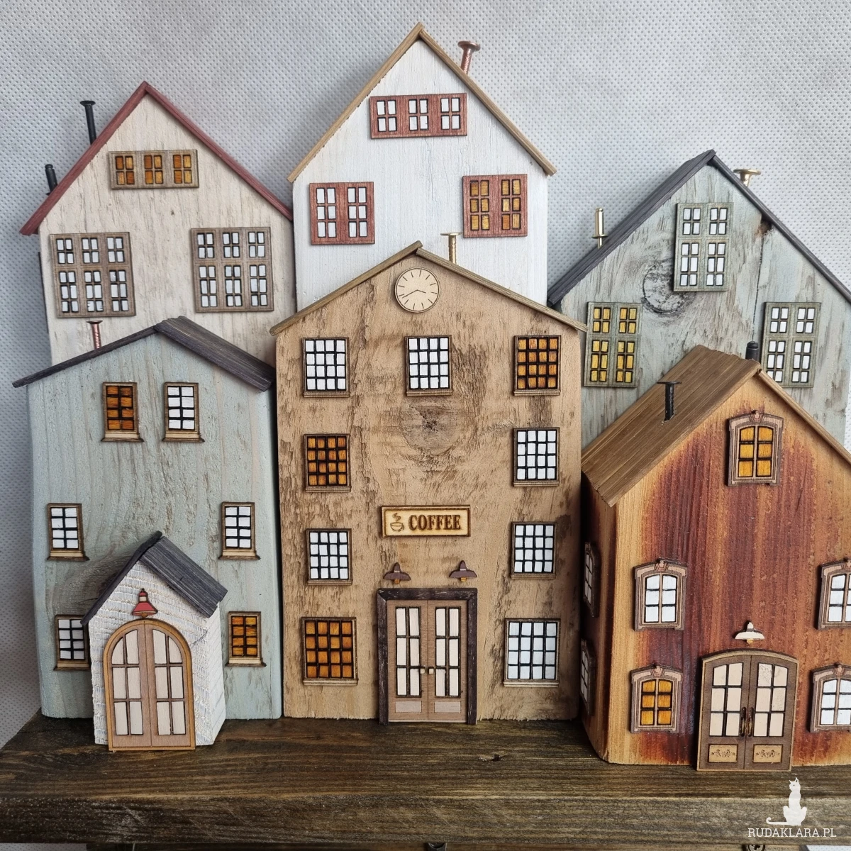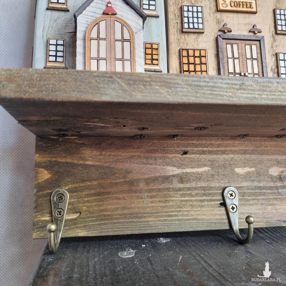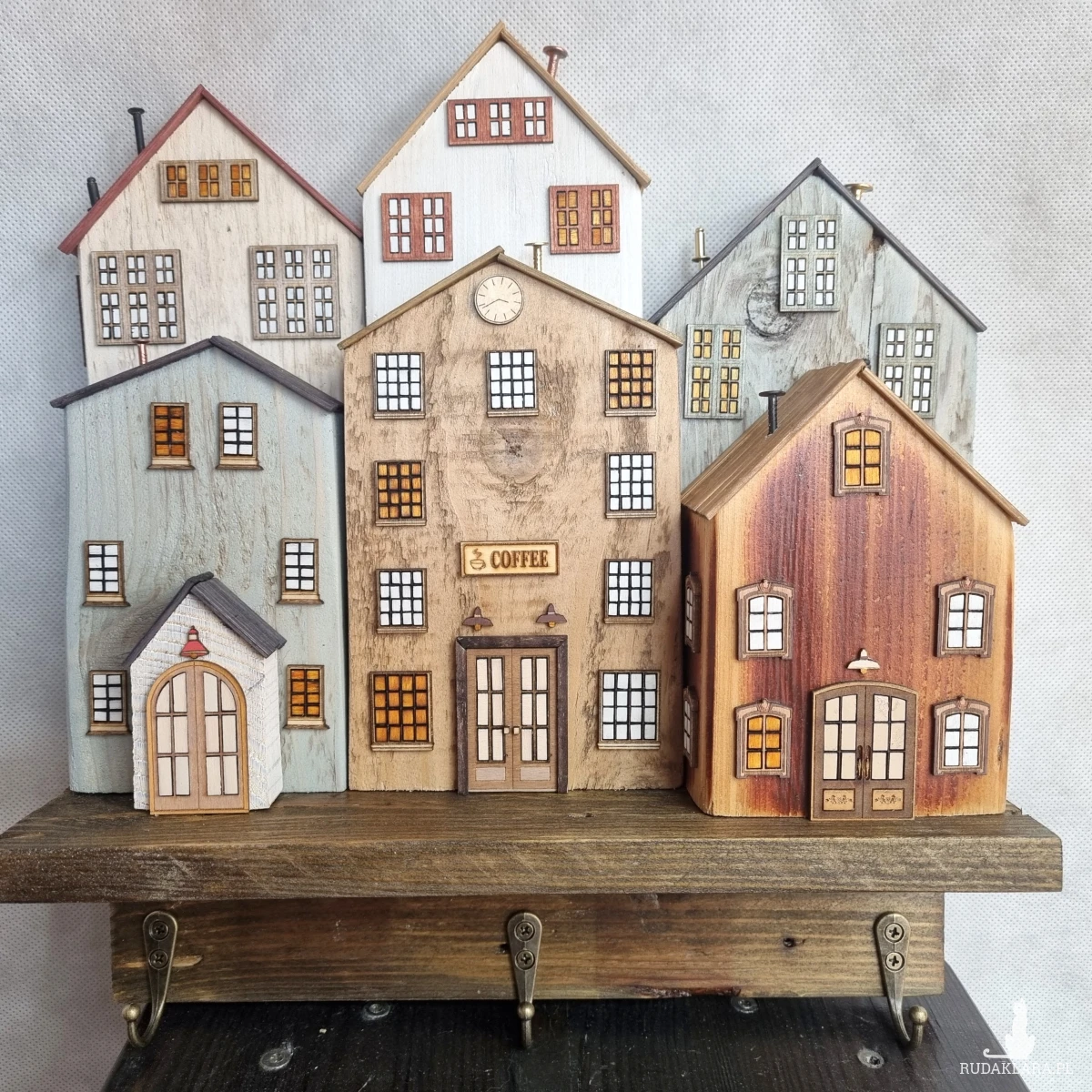 Drewniane domki handmade, mogące służyć jako wieszak na klucze (3), ręczniki inne drobiazgi. Domki wykonane desek ze starych palet z odzysku. Drewno bejcowane, woskowane, malowane w różnych odcieniach - ładnie podkreślające starość drewna - malowane bezbarwną farbą akrylową. Drewniane, wycinane okna i drzwi, również inne detale. Długość 29 cm, wysokość 32 cm, grubość 10 cm . Całość do zawieszenia na ścianie na 2 hakach. (21)
