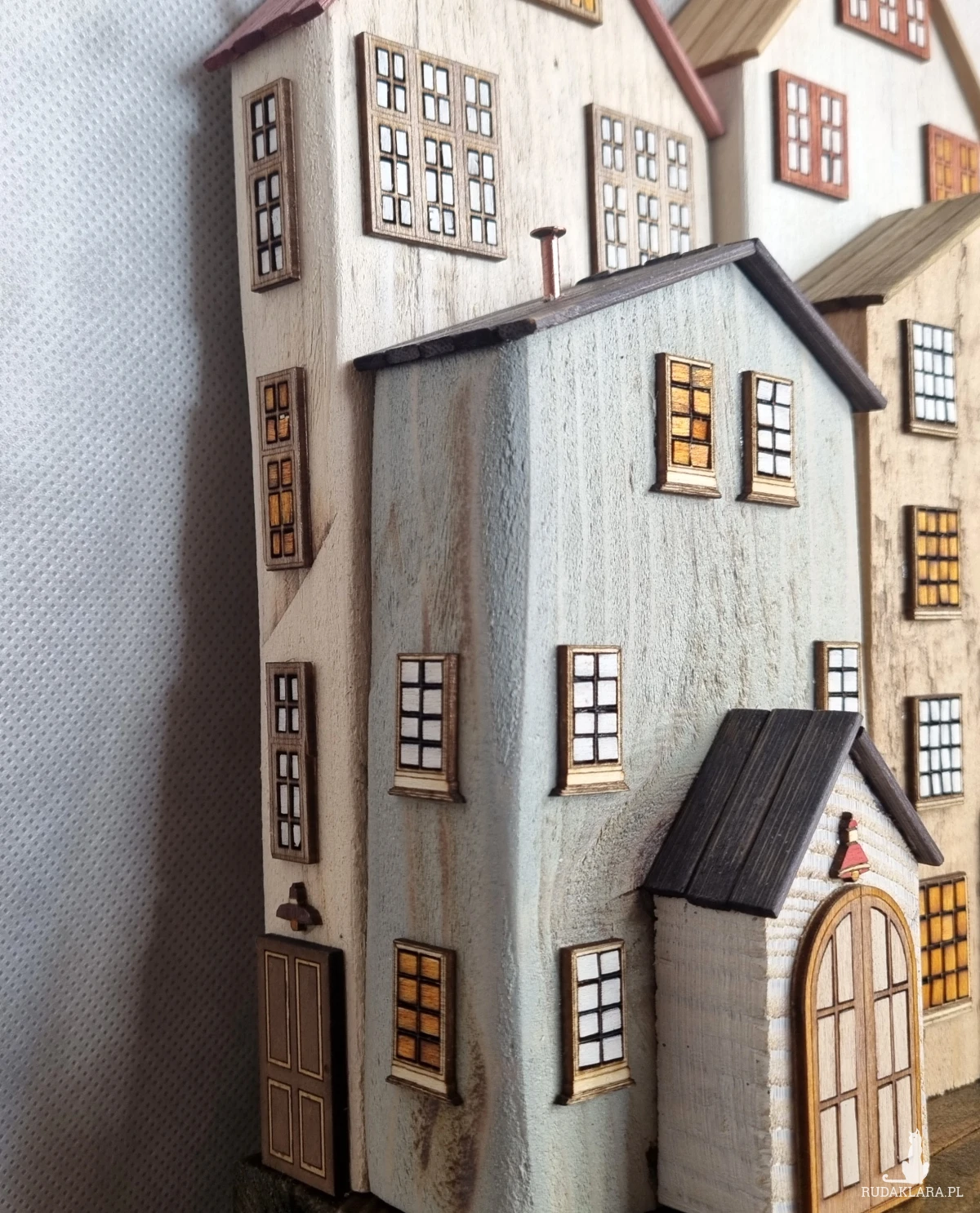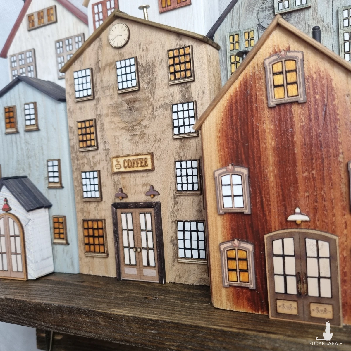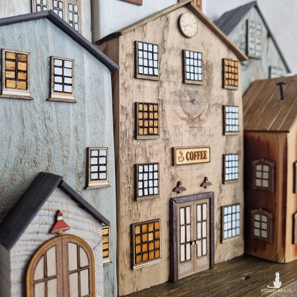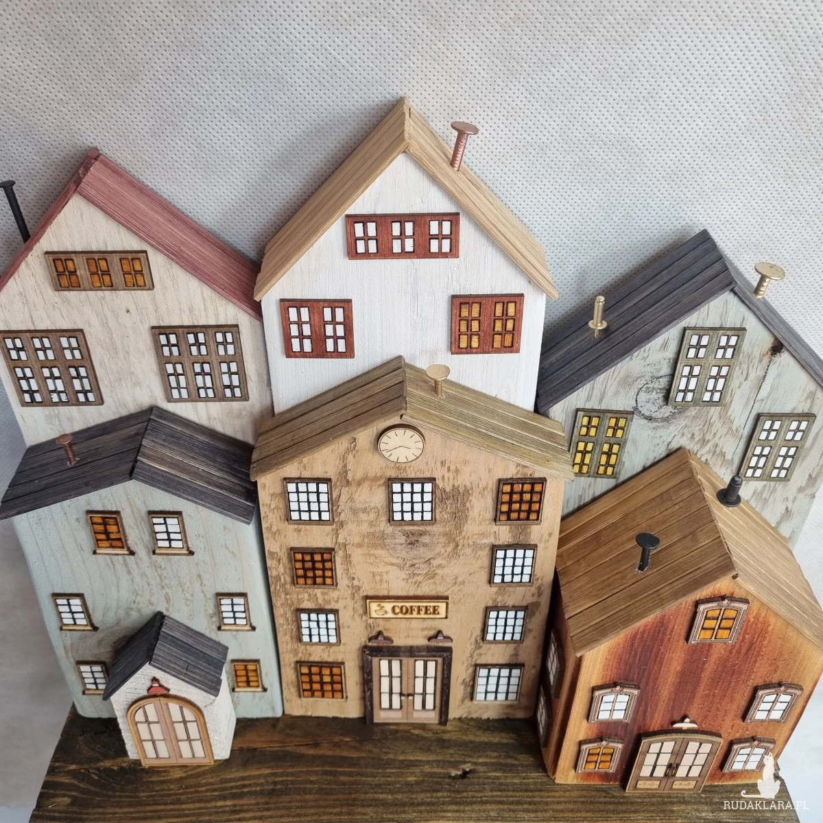 Drewniane domki handmade, mogące służyć jako wieszak na klucze (3), ręczniki inne drobiazgi. Domki wykonane desek ze starych palet z odzysku. Drewno bejcowane, woskowane, malowane w różnych odcieniach - ładnie podkreślające starość drewna - malowane bezbarwną farbą akrylową. Drewniane, wycinane okna i drzwi, również inne detale. Długość 29 cm, wysokość 32 cm, grubość 10 cm . Całość do zawieszenia na ścianie na 2 hakach. (21)