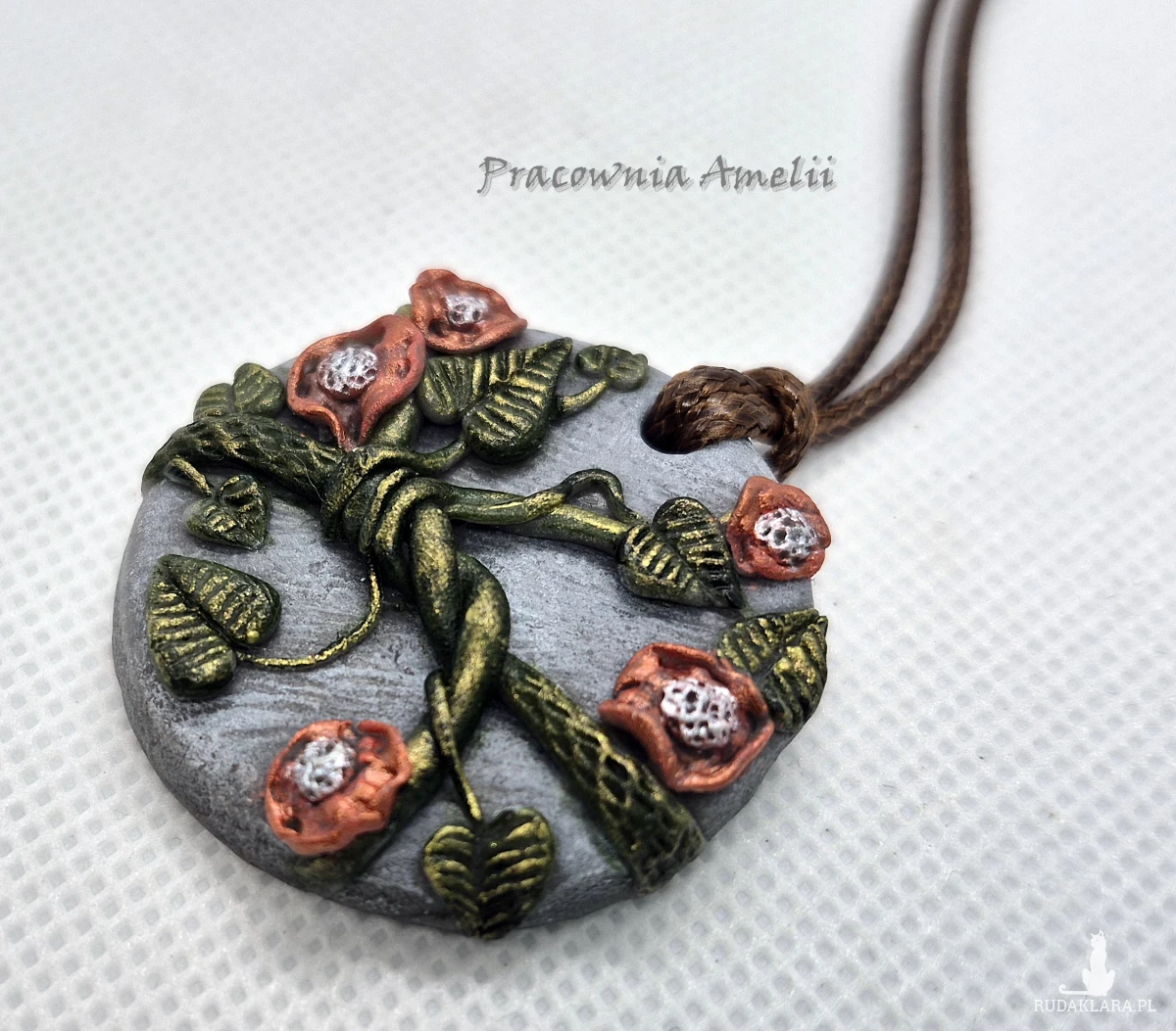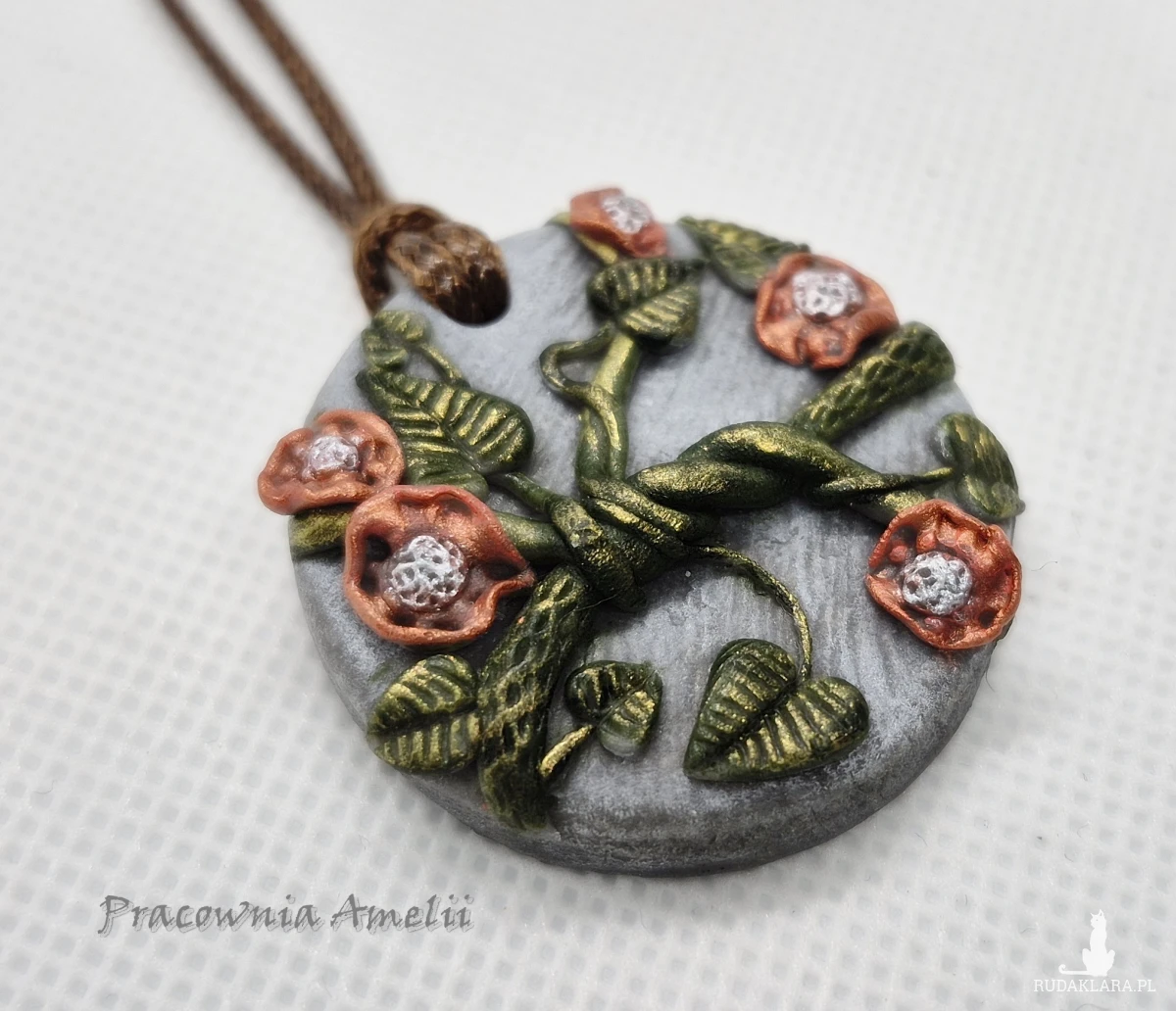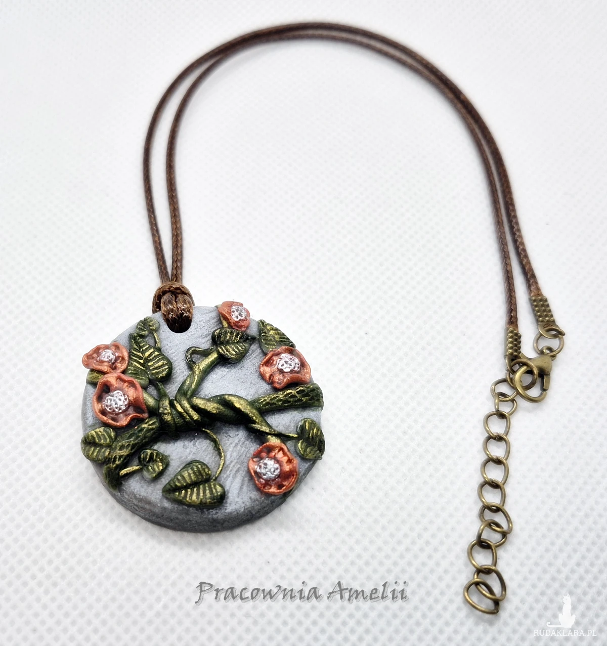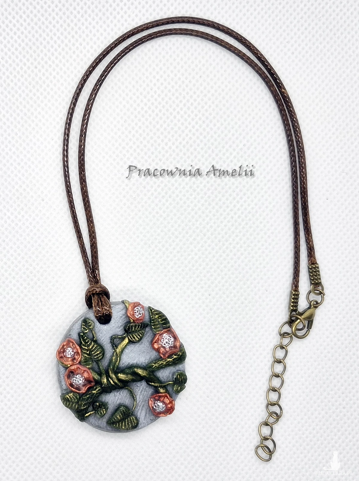 Wisiorek wykonany z gliny polimerowej zawieszony na brązowym powlekanym sznureczku zapinanym na karabińczyk. Projekt własny, wykonany tylko w jednym egzemplarzu. Biżuteria z gliny polimerowej jest trwała i uniwersalna. Idealna na oryginalny prezent w atrakcyjnej cenie.