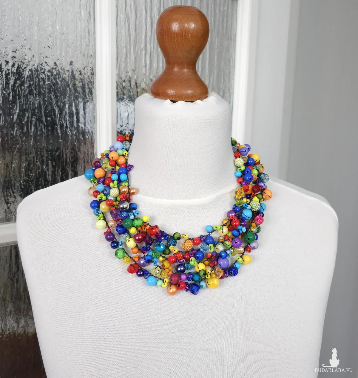 Bogaty, wielowarstwowy naszyjnik wykonany z koralików o różnych kształtach, kolorach i teksturach. Wyrazisty dodatek w stylu boho, który ożywi każdą stylizację.