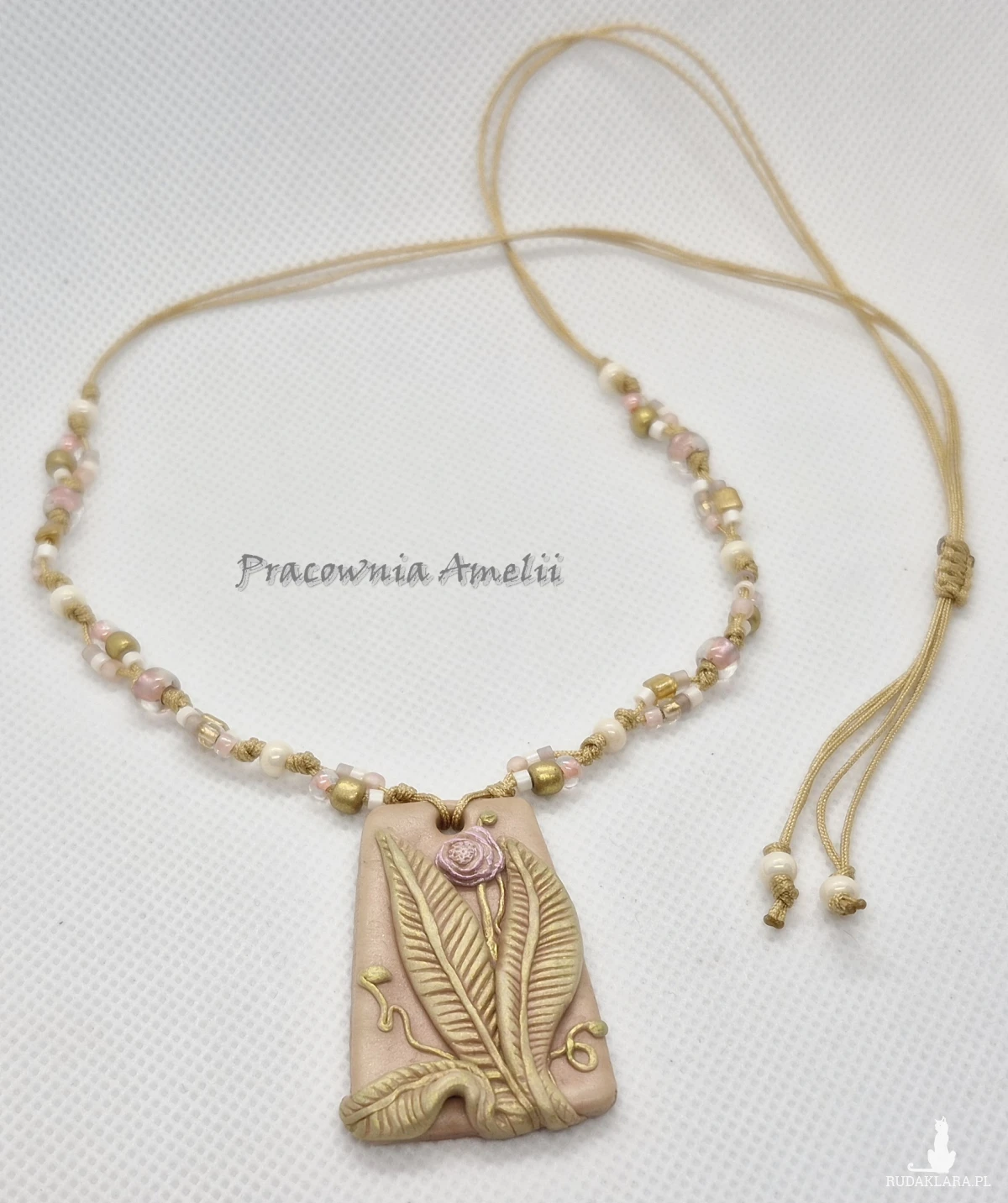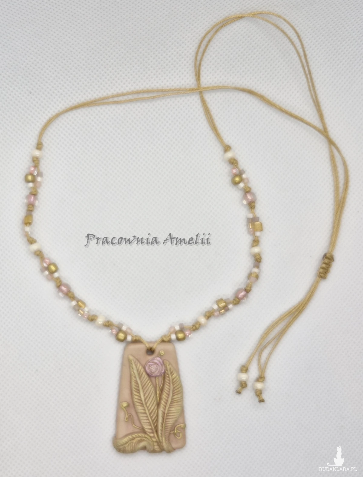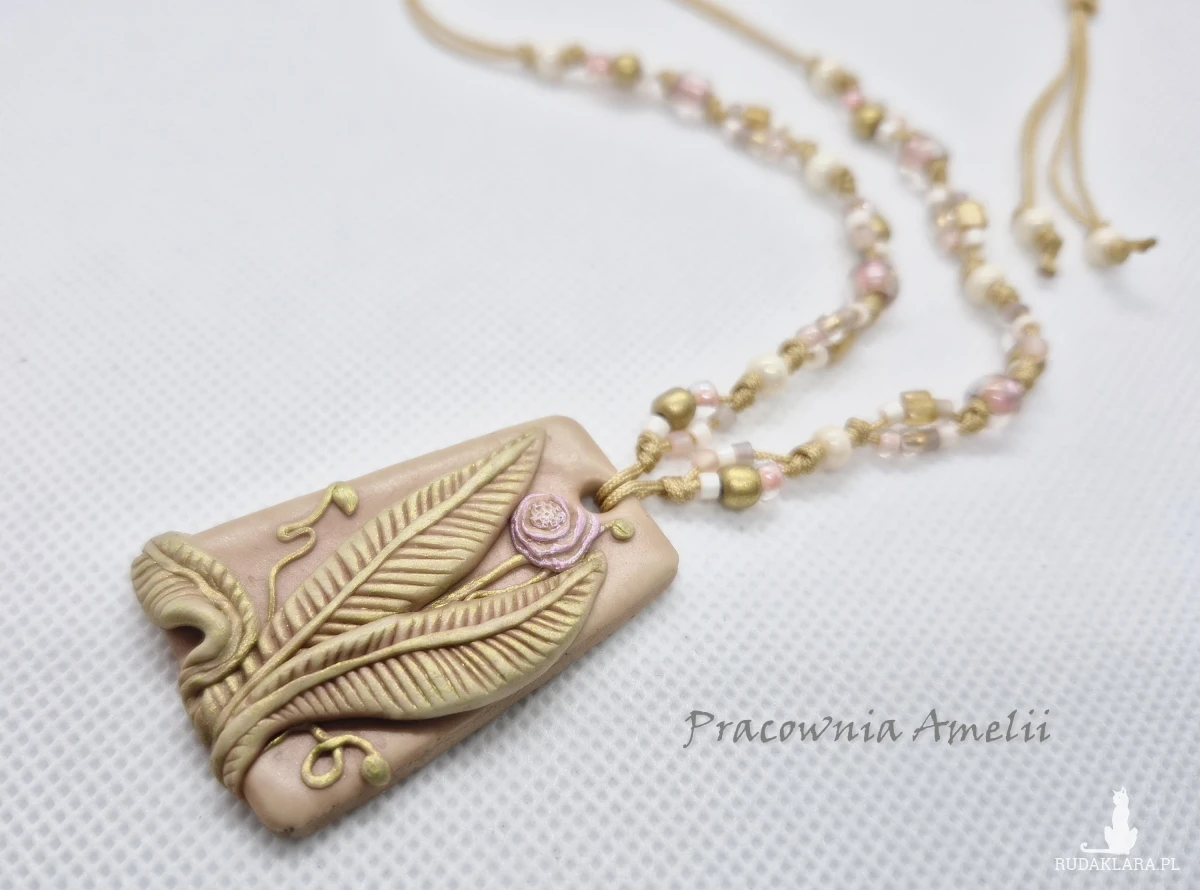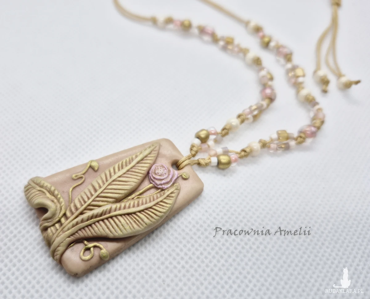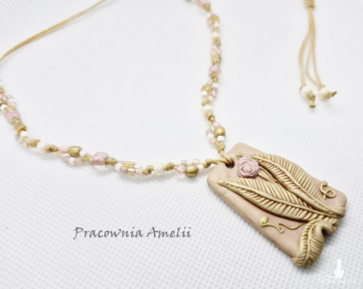 Wisior wykonany z gliny polimerowej zawieszony na sznureczku makramowym ze szklanymi koralikami, zakładany przez głowę, z regulacją długości. Projekt własny, wykonany tylko w jednym egzemplarzu. Biżuteria z gliny polimerowej jest trwała i uniwersalna. Idealna na oryginalny prezent w atrakcyjnej cenie.