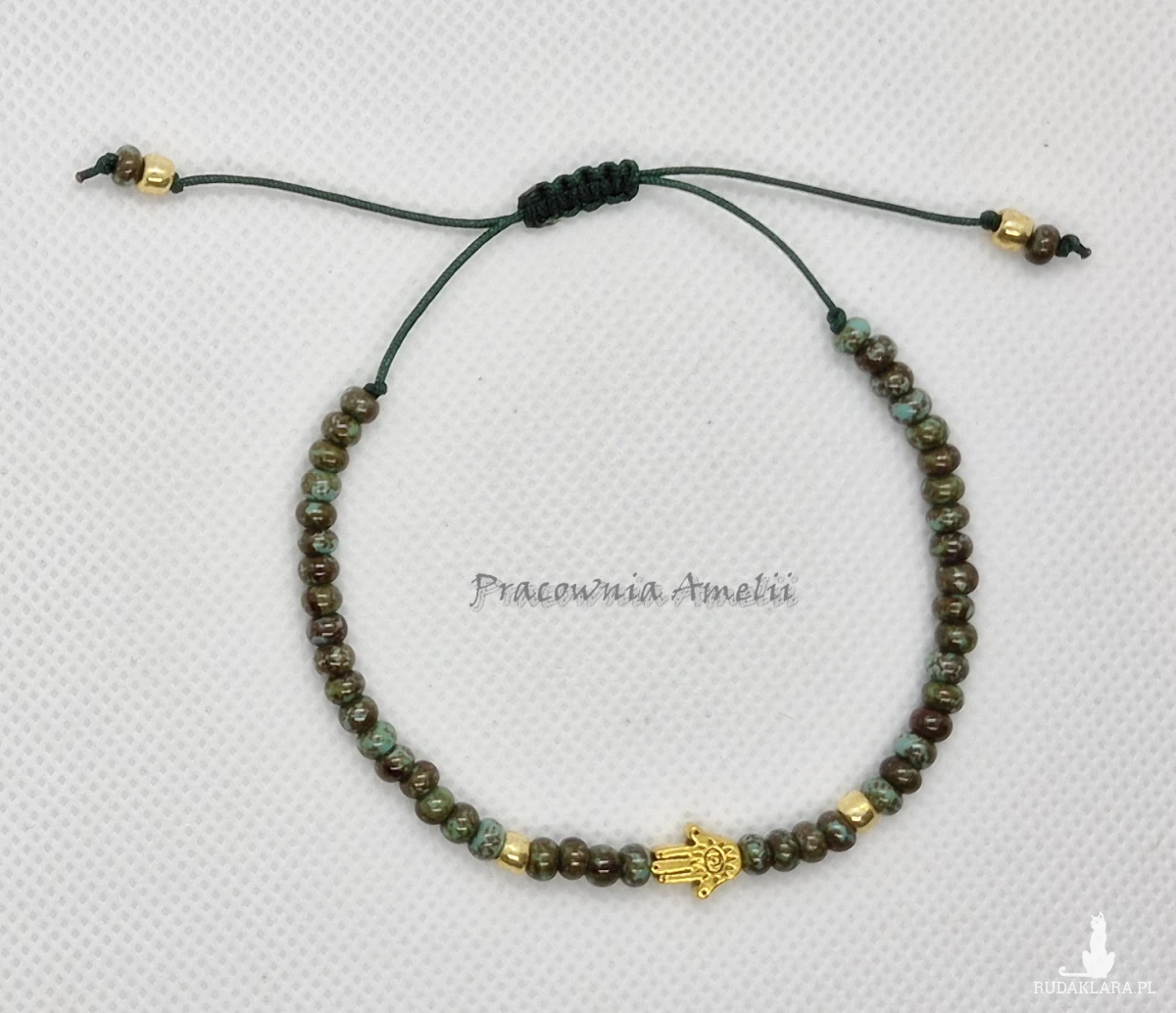 Bransoletka ochronna na ciemnozielonym sznurku nylonowym z dodatkiem szklanych marmurkowych koralików i metalowej chamsy (stop cynku). Rozmiar uniwersalny. Złote galwanizowane koraliki Miyuki są odporne na ścieranie.