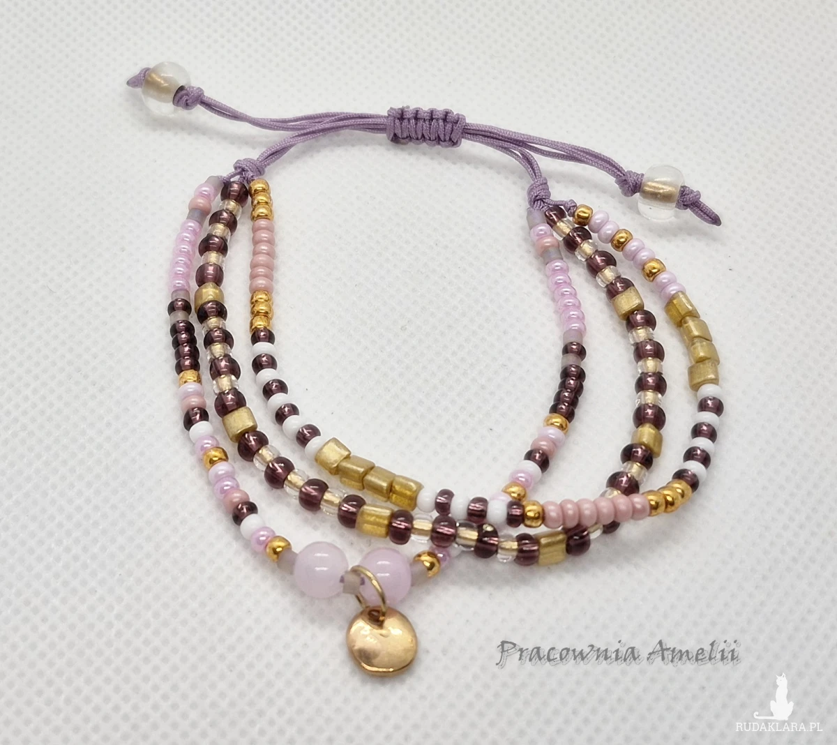 Potrójna bransoletka na lawendowym sznurku nylonowym z dodatkiem szklanych koralików i metalowej zawieszki. Rozmiar uniwersalny. Złote galwanizowane koraliki Toho są odporne na ścieranie.